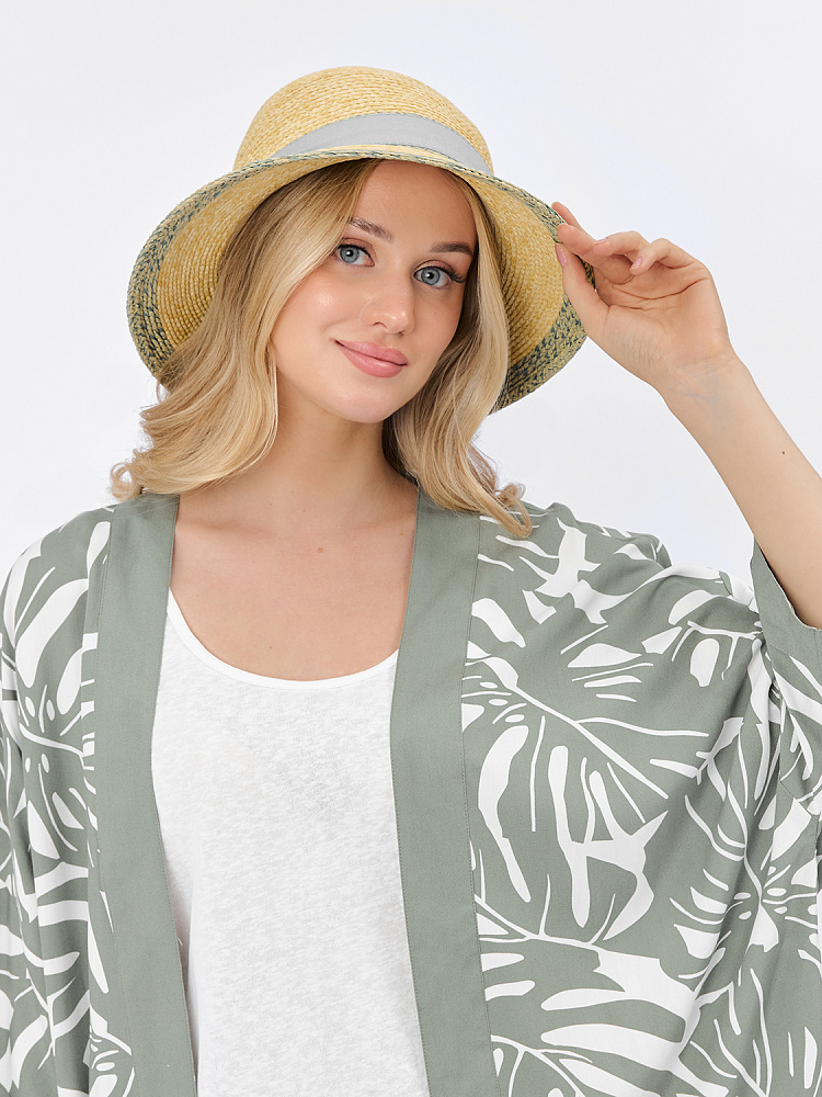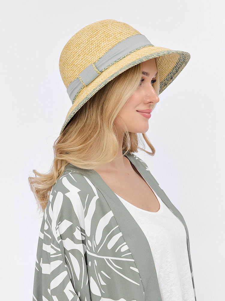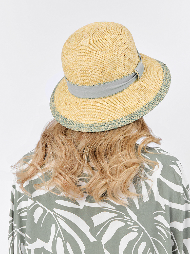 Элегантная летняя женская шляпа итальянского бренда FABRETTI в классическом соломенном цвете с нежно-зеленой отделкой полей.Шляпа-абажур - классическая летняя модель с опущенными полями - защищает от солнца и придает образу романтичную загадочность. Шляпка украшена текстильной лентой на тулье и небольшим металлическим логотипом. Внутри размер регулируется лентой.Шляпа изготовлена из плетеной соломки из целлюлозы.Этот легкий «дышащий» материал хорошо сохраняет форму и цвет. Прекрасно сочетается с любым летним гардеробом. Цвет фурнитуры – серебро.