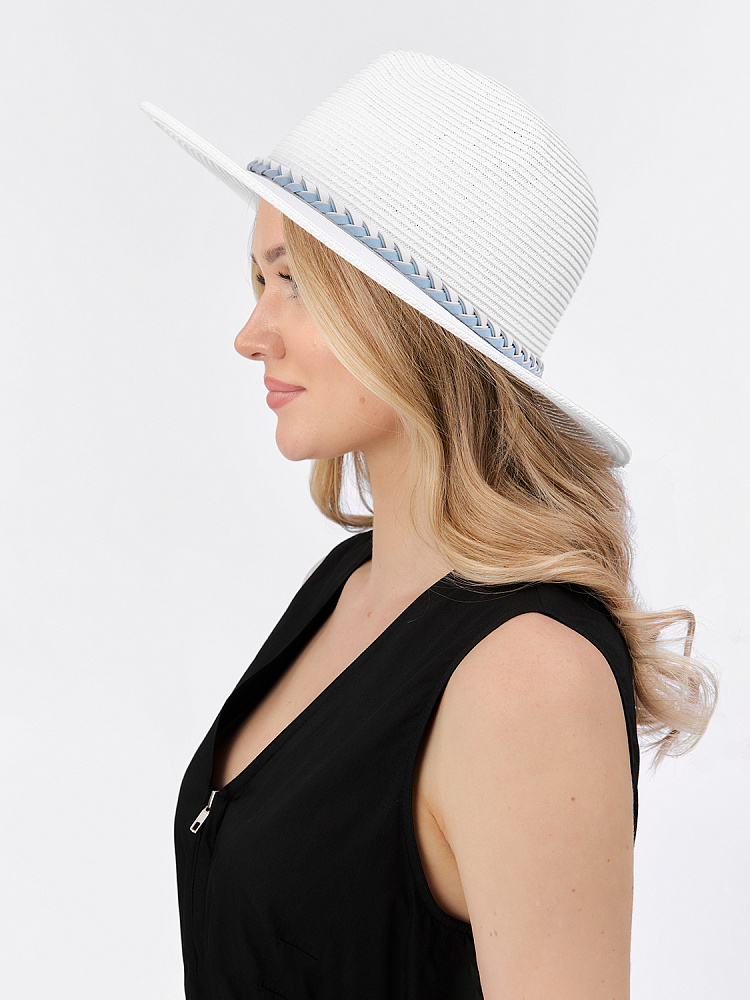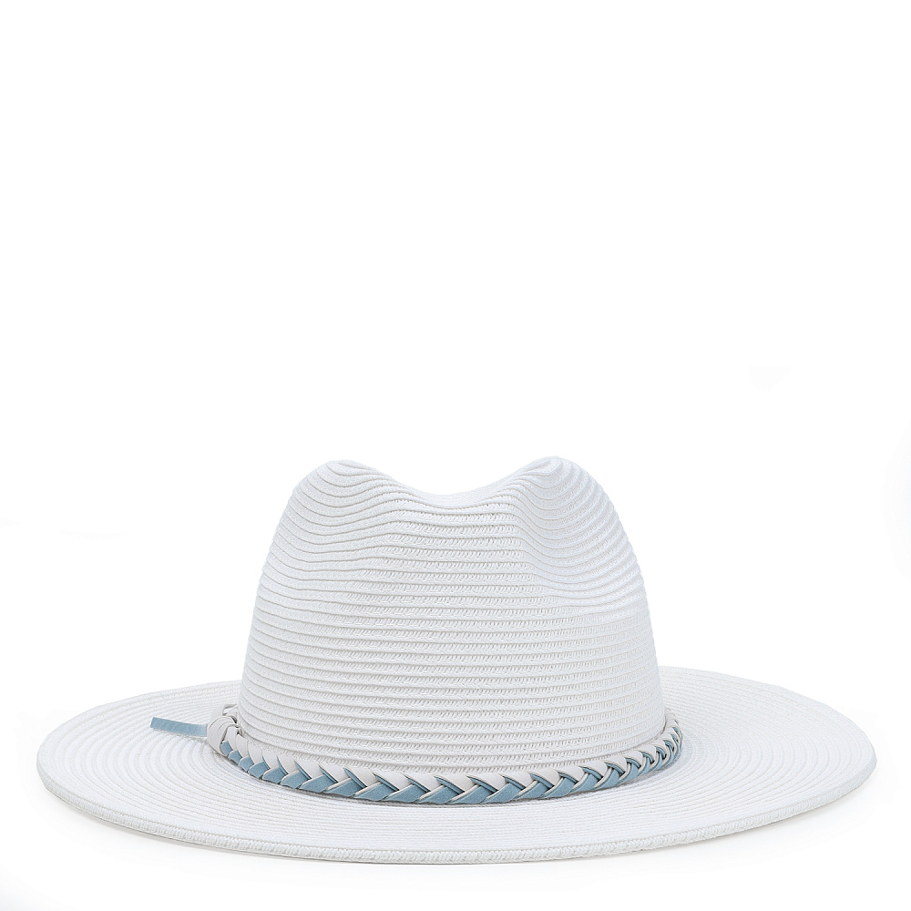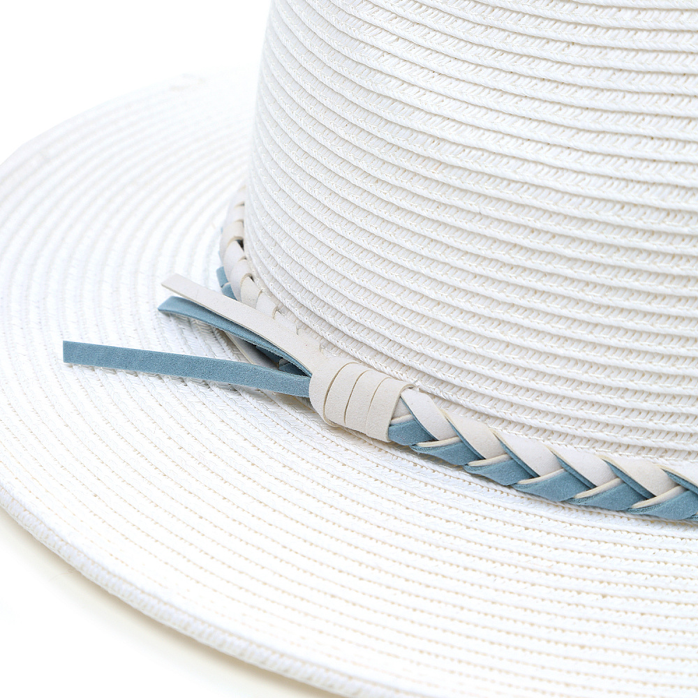 Стильная женская шляпа-стетсон итальянского бренда FABRETTI в белом цвете. Эта дерзкая «ковбойская» шляпа украсит любой образ, придав ему динамичности. Классическое сочетание – образ в стиле «кантри» – с джинсами и рубашкой, с длинными многоярусными юбками и платьями.Широкие поля этой шляпы отлично защищают от солнца, а легкий «плетеный» материал хорошо пропускает воздух, не давая перегреться на жаре.Шляпа украшена плетеным шнуром из экозамши. Внутри объем регулируется лентой.
