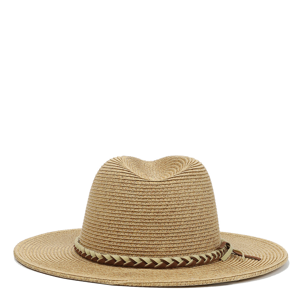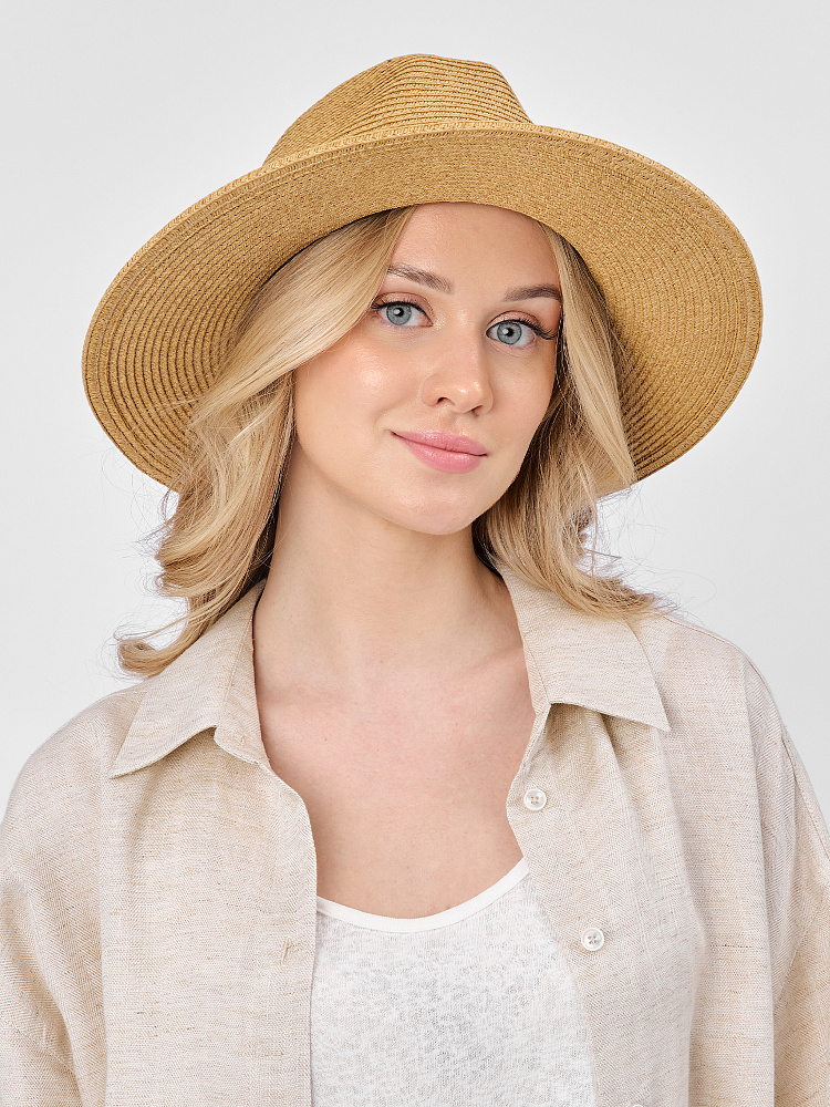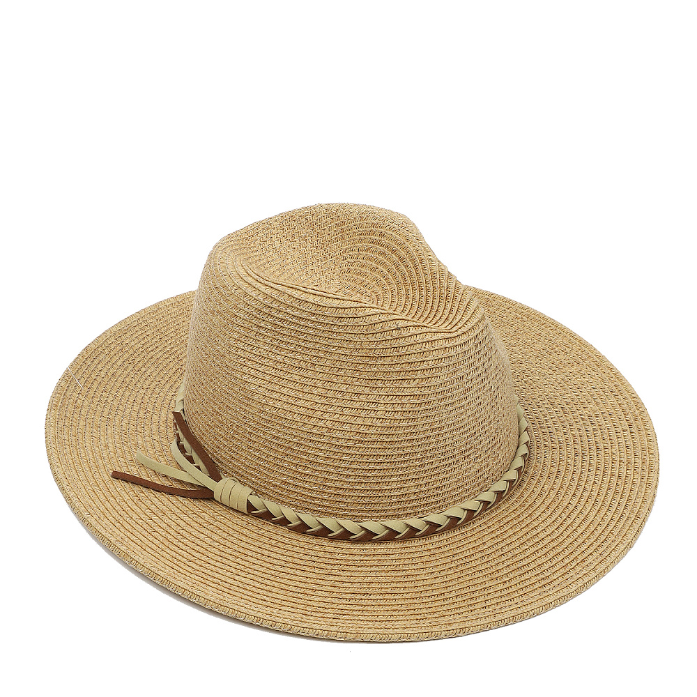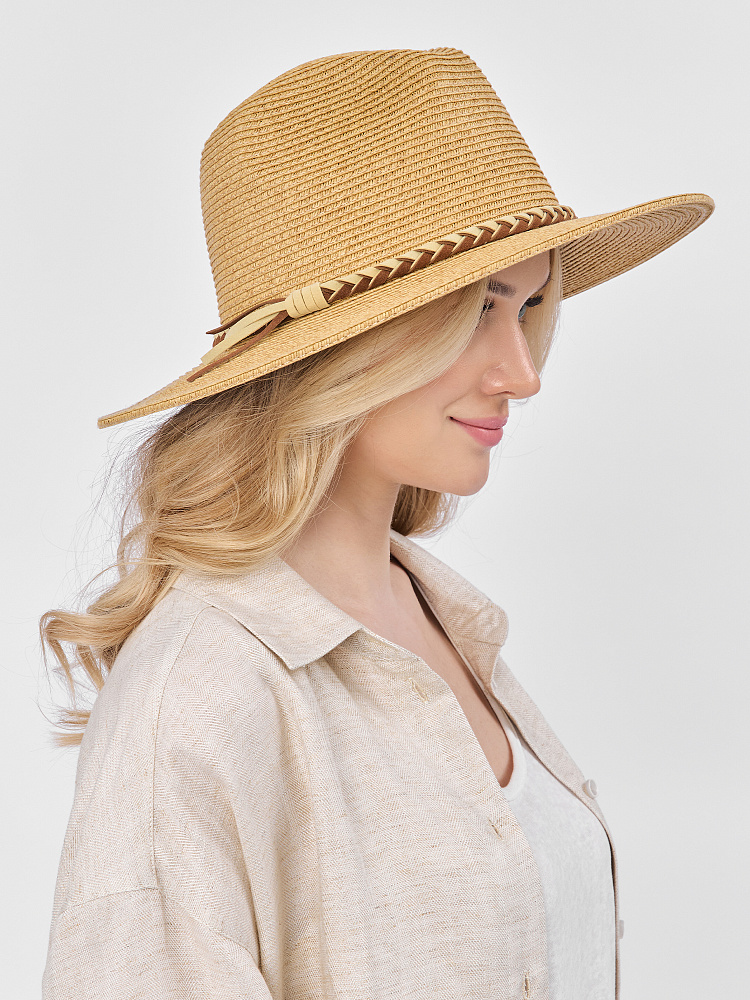 Стильная женская шляпа-стетсон итальянского бренда FABRETTI в бежевом цвете. Эта дерзкая «ковбойская» шляпа украсит любой образ, придав ему динамичности. Классическое сочетание – образ в стиле «кантри» – с джинсами и рубашкой, с длинными многоярусными юбками и платьями.Широкие поля этой шляпы отлично защищают от солнца, а легкий «плетеный» материал хорошо пропускает воздух, не давая перегреться на жаре.Шляпа украшена плетеным шнуром из экозамши. Внутри объем регулируется лентой.