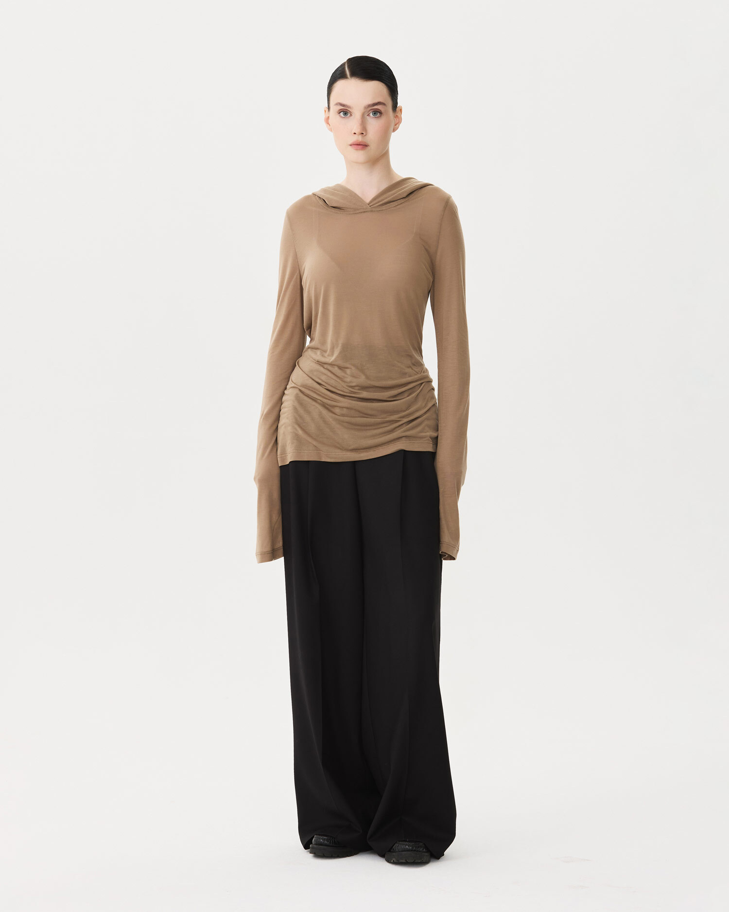 Тончайший трикотаж комфортно ложится под рубашку или пиджак. Любой формальный комплект обретёт более расслабленный вид с лонгсливом с капюшоном.