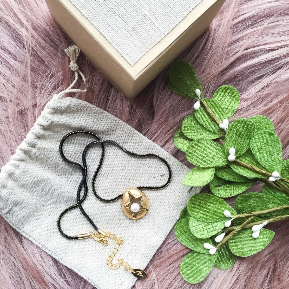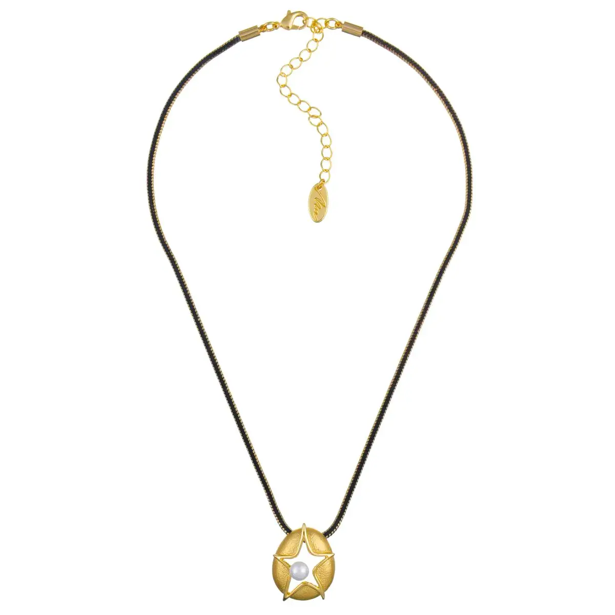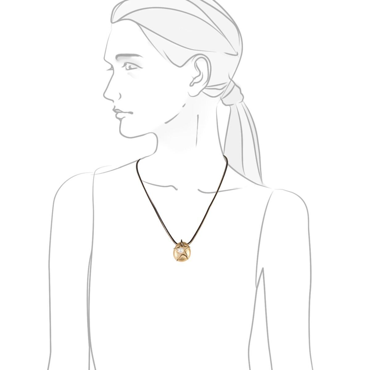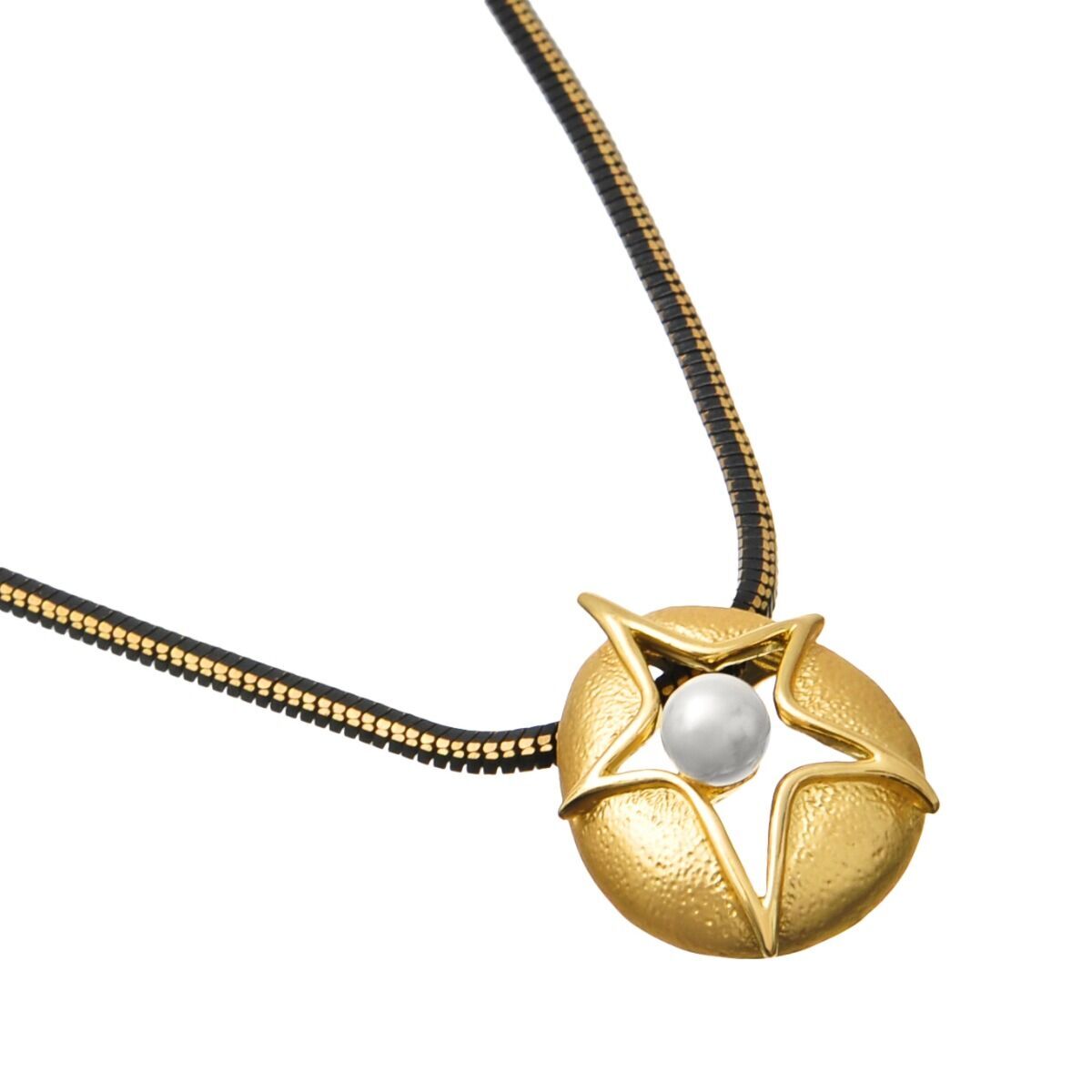 Короткое ожерелье из бижутерийного сплава с гальваническим покрытием золотом на цепочке, подвеска в виде звезды спрятанной в овал и с вставкой имитирующей жемчуг. Застежка - карабин.