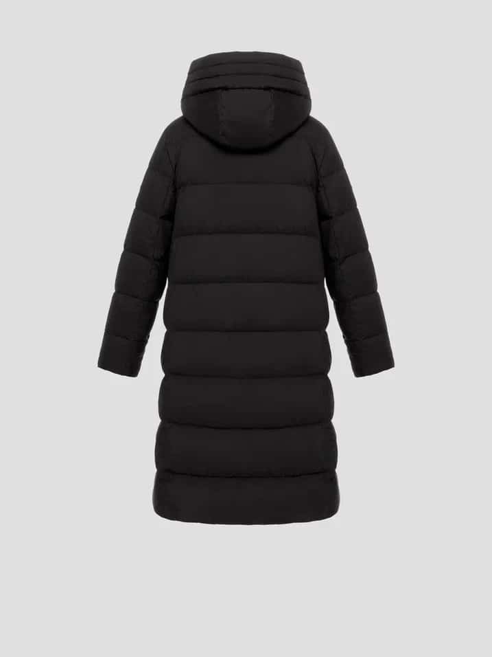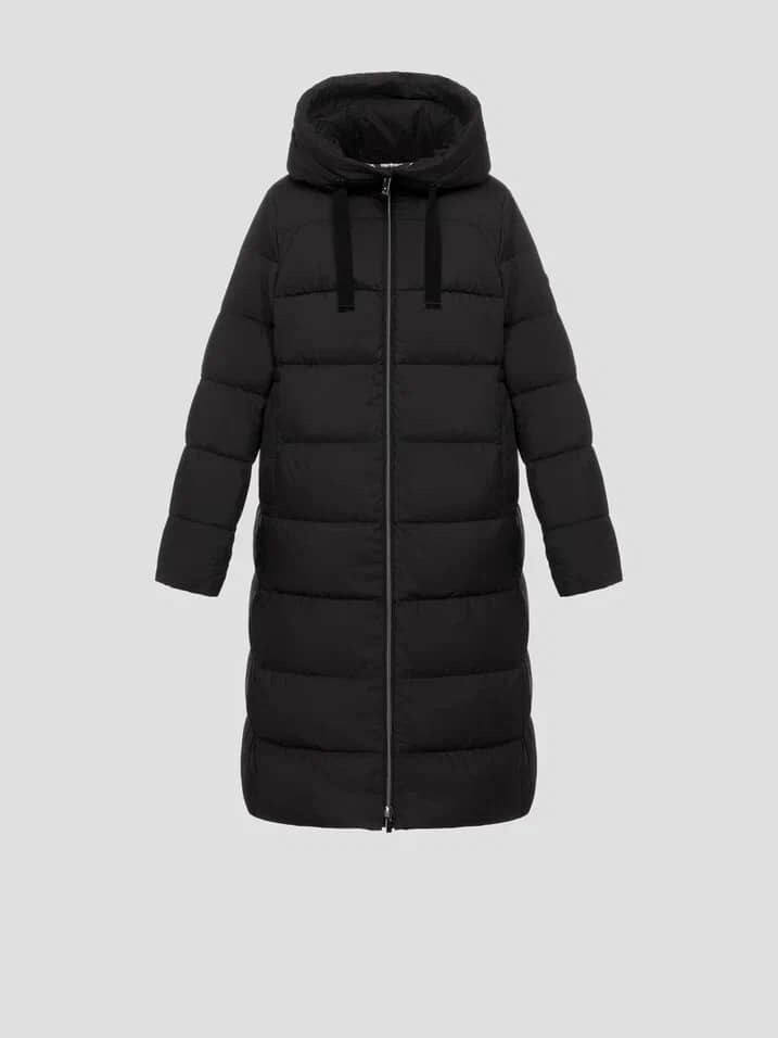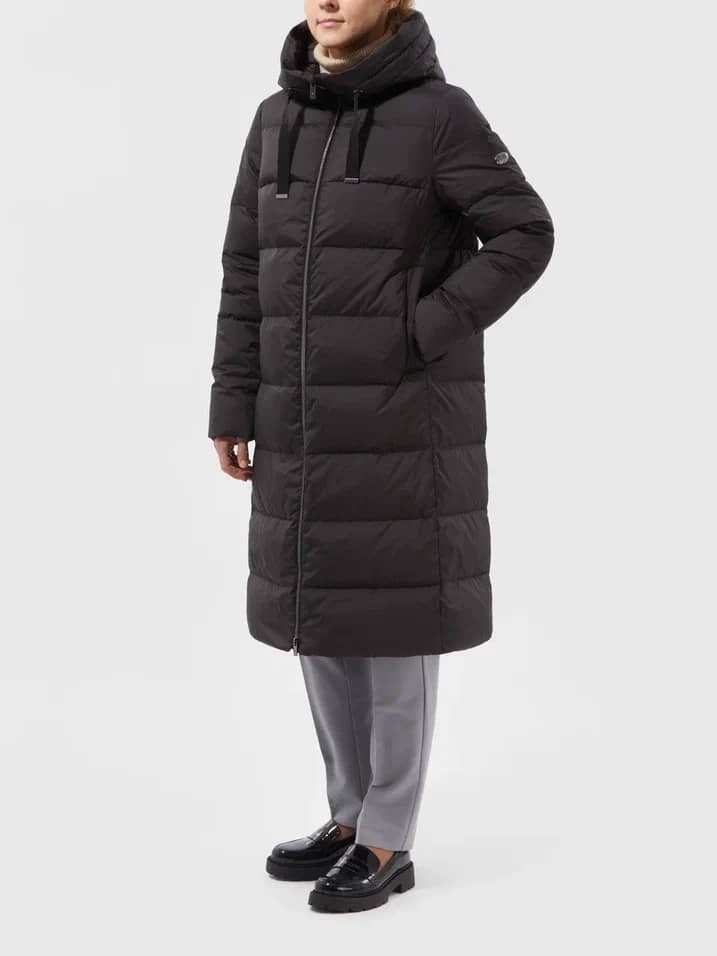 Пальто женское на натуральном пуху прямого силуэта из водоотталкивающей ткани. По борту застежка на молнии и потайных кнопках, втачной капюшон с кулиской и декоративной тесьмой, карманы листочки.