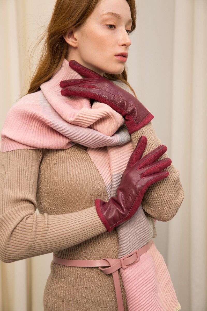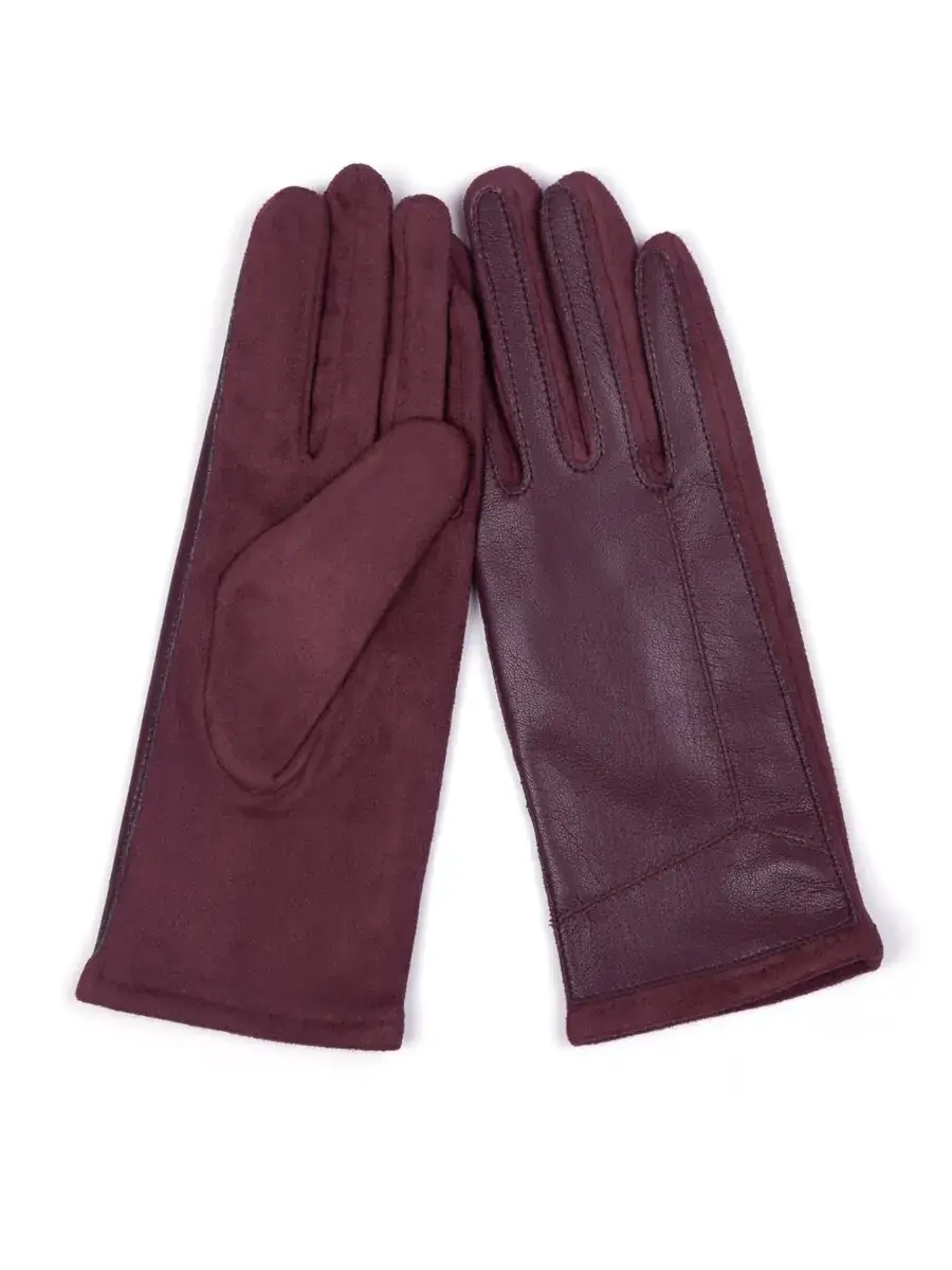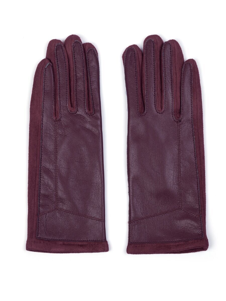 Перчатки бордового цвета из экокожи и экозамши.Современные перчатки глубокого бордового цвета из микса материалов: экокожи, экозамши и полиэстера для любителей простоты и удобства. Уютное изделие с классическим декором экокожей на тыльной части перчатки великолепно сочетается с монохромными образами в одежде. Внутри перчаток деликатный мягкий трикотаж. Пара настолько комфортно сидит на руке, что после примерки ее уже не хочется снимать. Перчатки дополнят как яркий, так и лаконичный образ.