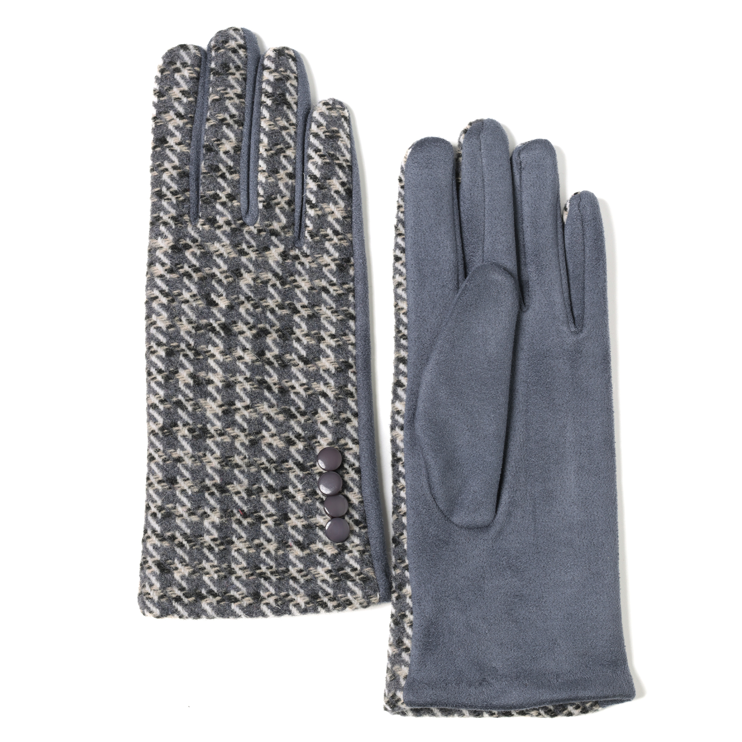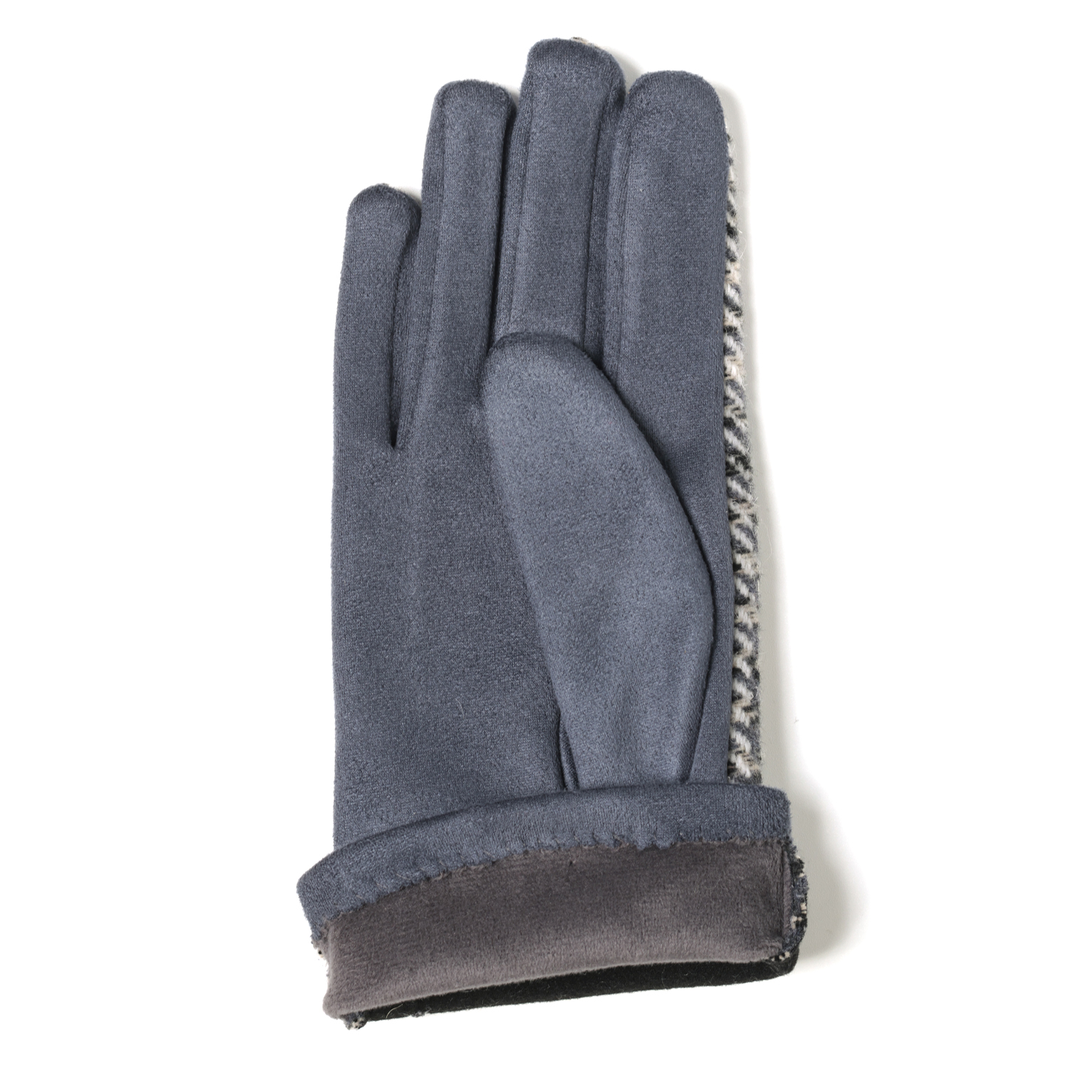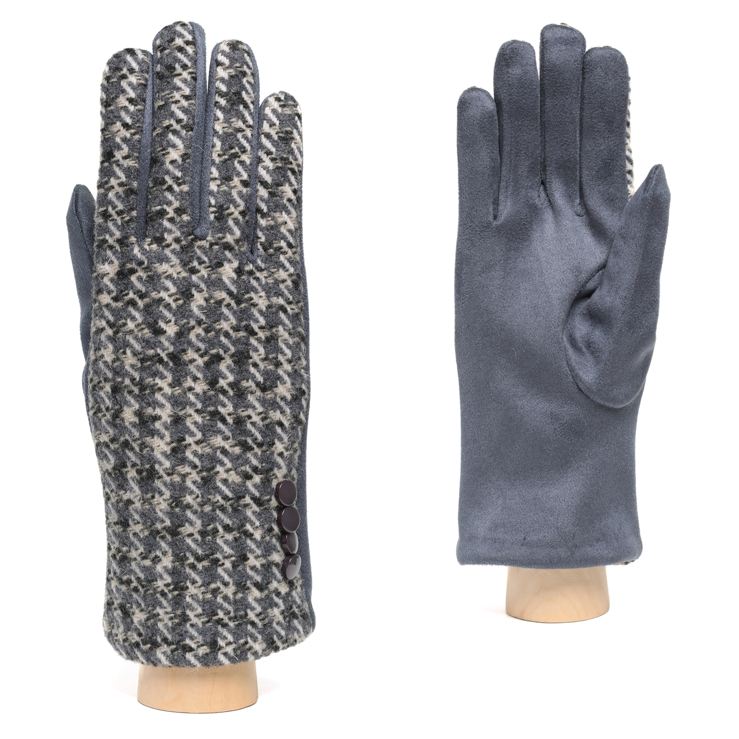 Стильные комбинированные перчатки итальянского бренда FABRETTI сочетают искусственную замшу на тыльной стороне и плотную драповую ткань - на лицевой стороне. Ткань украшена модным узором «гусиная лапка». На манжете четыре декоративных пуговицы.