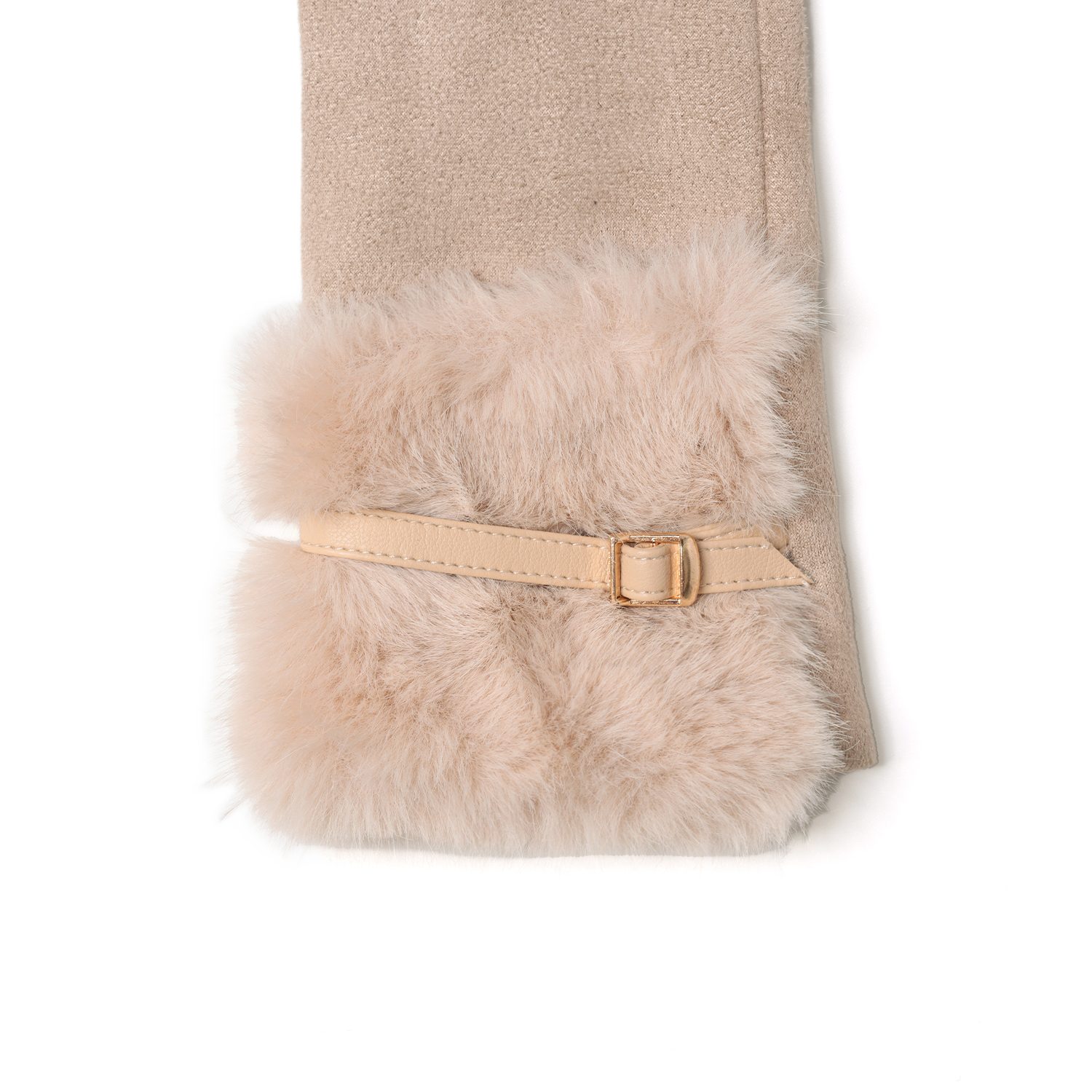 Лицевая сторона декорирована опушкой из экомеха с узким кожаным ремешком с пряжкой. Внутри бархатистая подкладка из короткого экомеха.