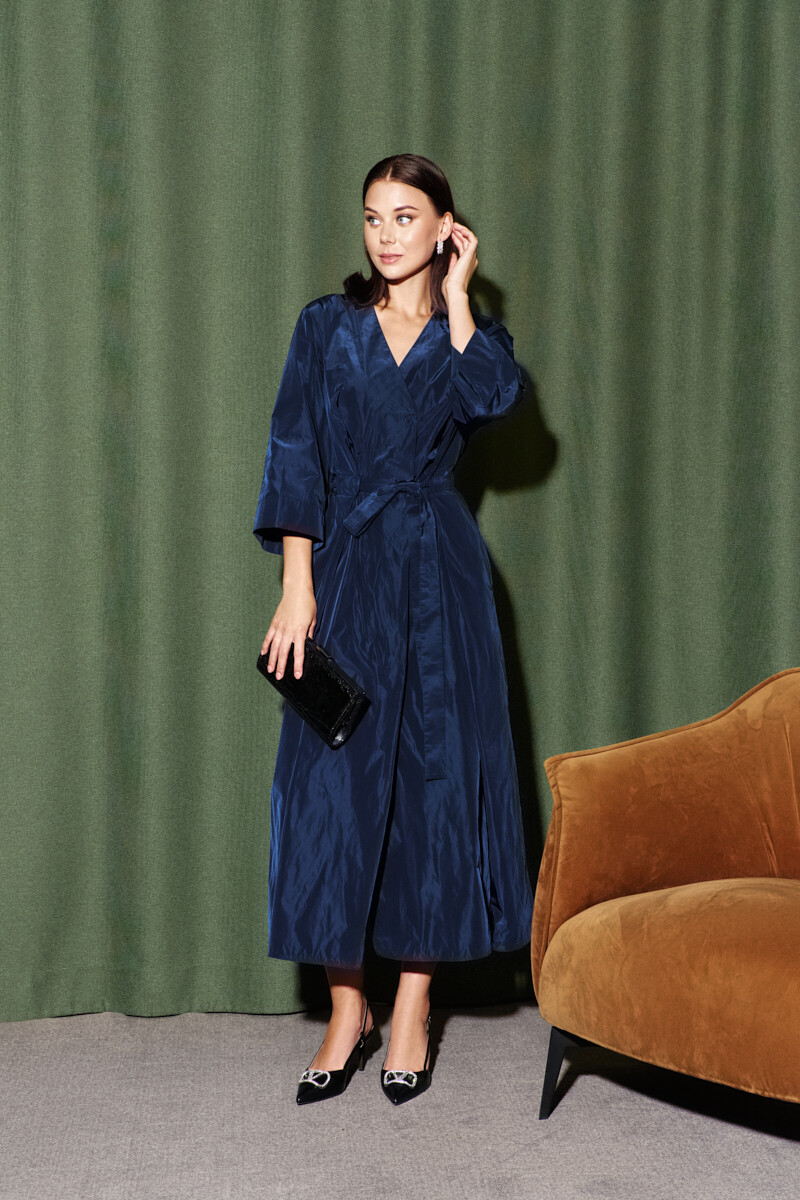 Платье в стиле smart casual выполнено из плащевой ткани. Модель полуприлегающего силуэта со спущенной линией плеча. На передней части застрочены глубокие складки, из которых выходит пояс из основной ткани, завязывающийся на бант. По спинке широкая эластичная лента. V-образная горловина. Рукава свободные, длины 7/8. Для удобства в носке в боковых швах предусмотрены карманы и разрезы.