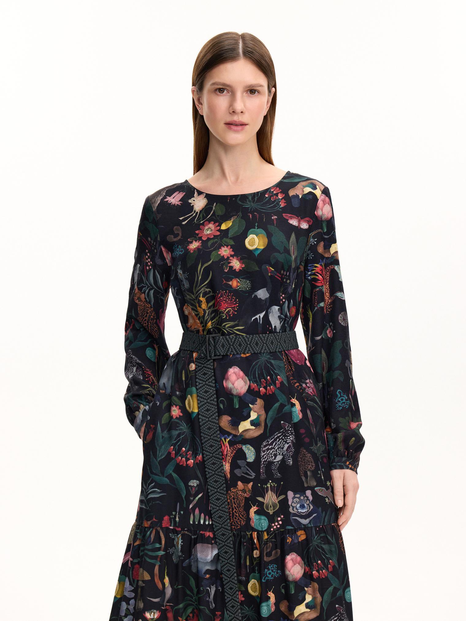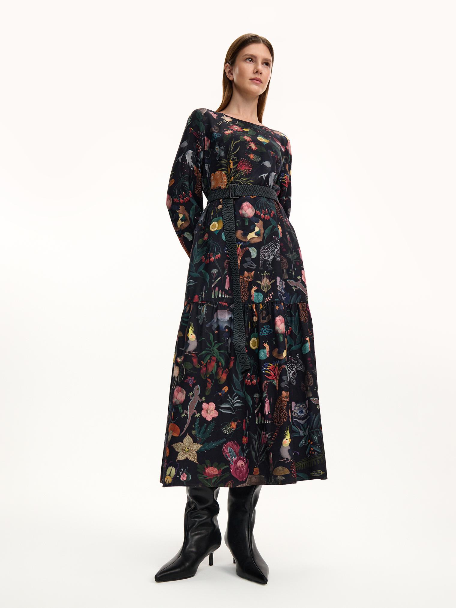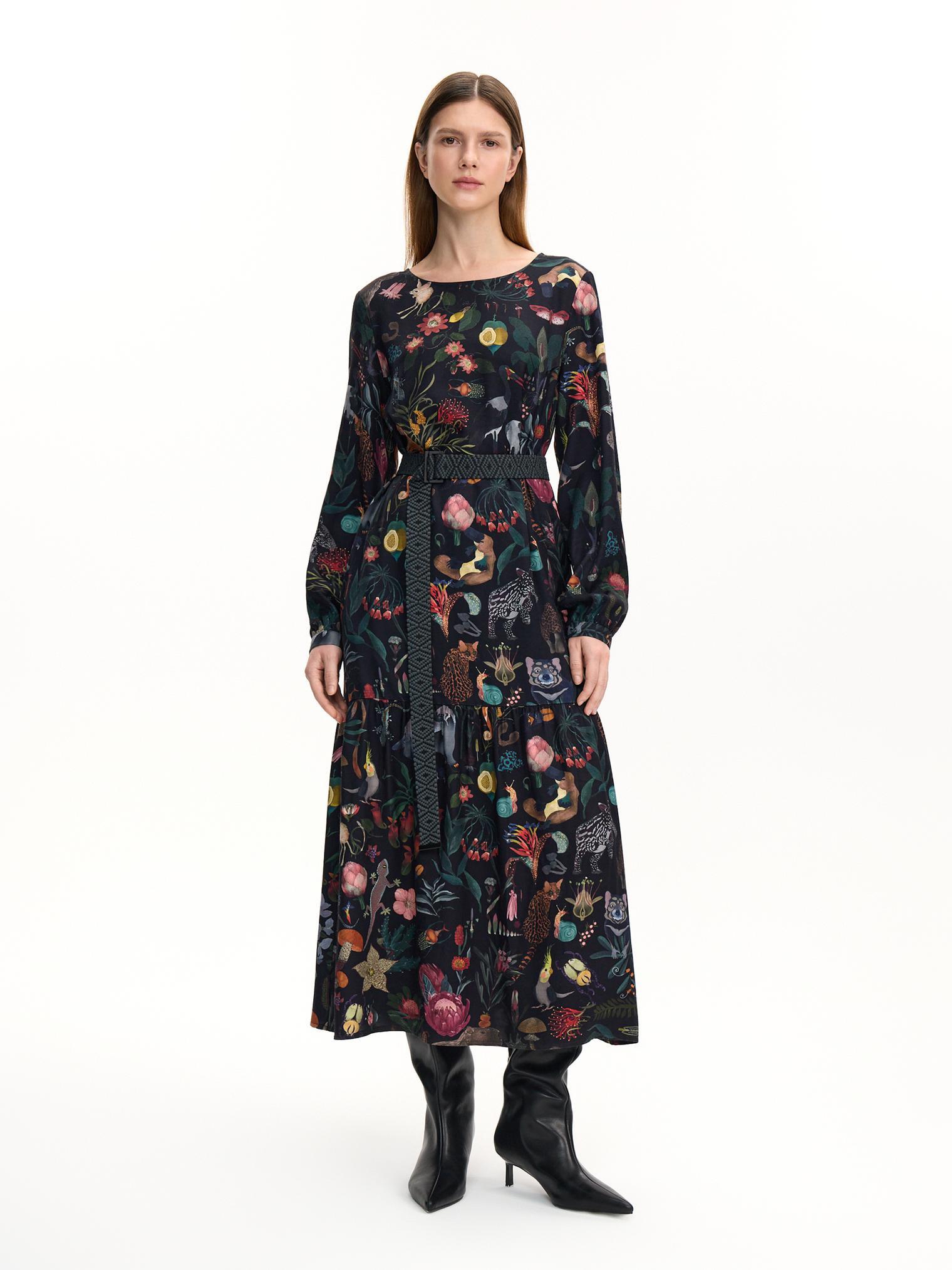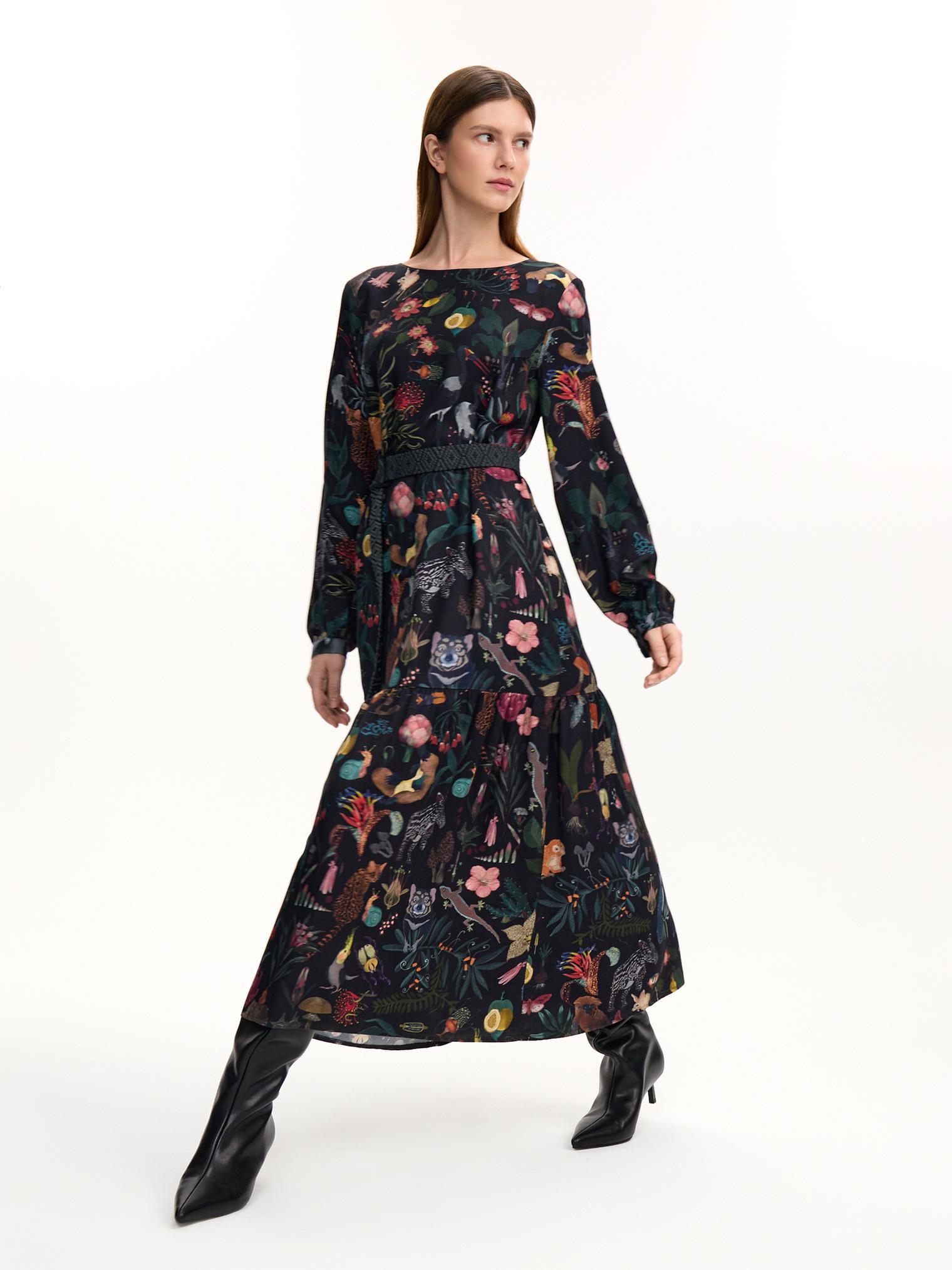 Нежное, струящееся и ультра романтичное платье с ярким графичным принтом с флорой и фауной.Модель закрытого фасона из нежной на ощупь, тёплой вискозы станет отличным вариантом на демисезонную погоду. Округлый вырез, объемные рукава и пояс в комплекте. Идеальный вариант для похода в театр или ресторан.