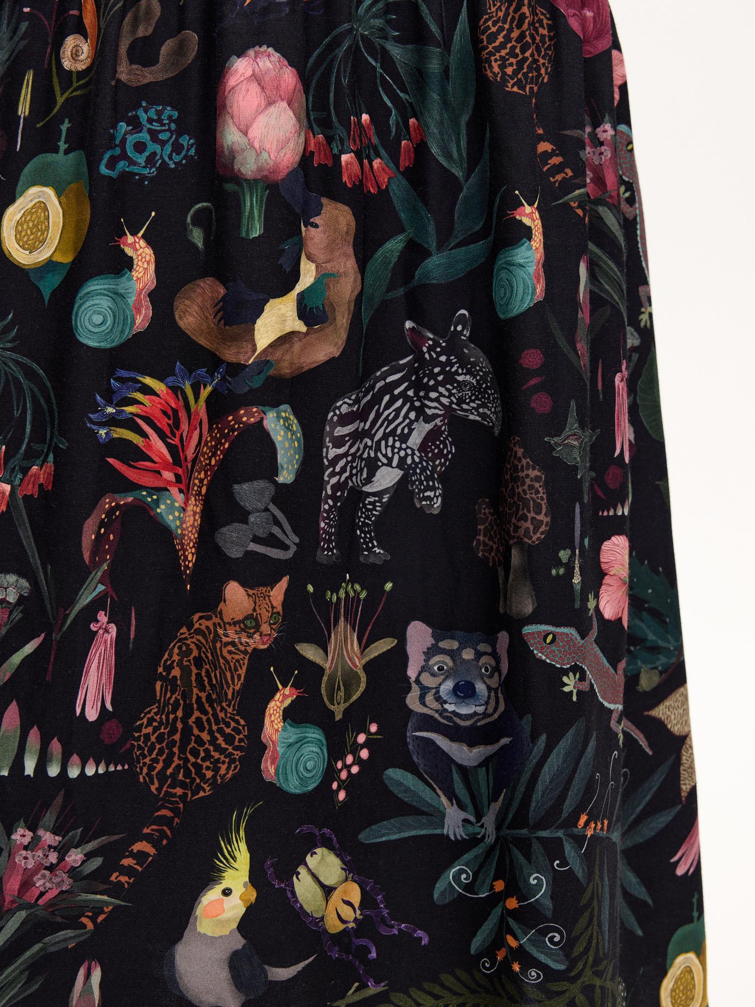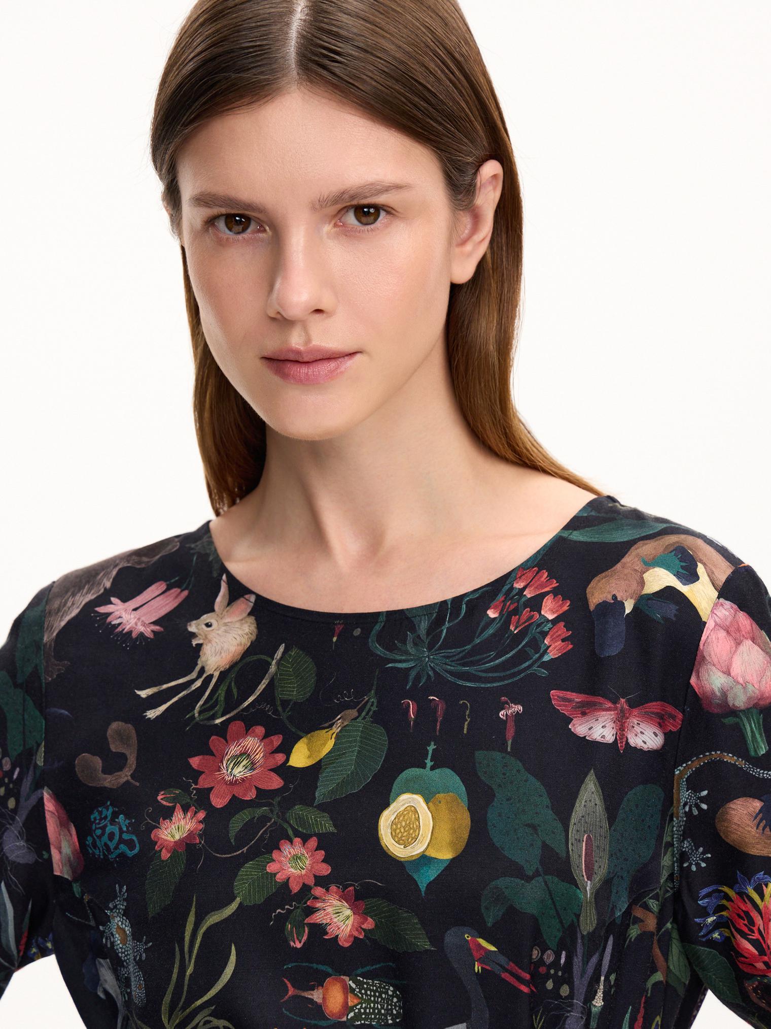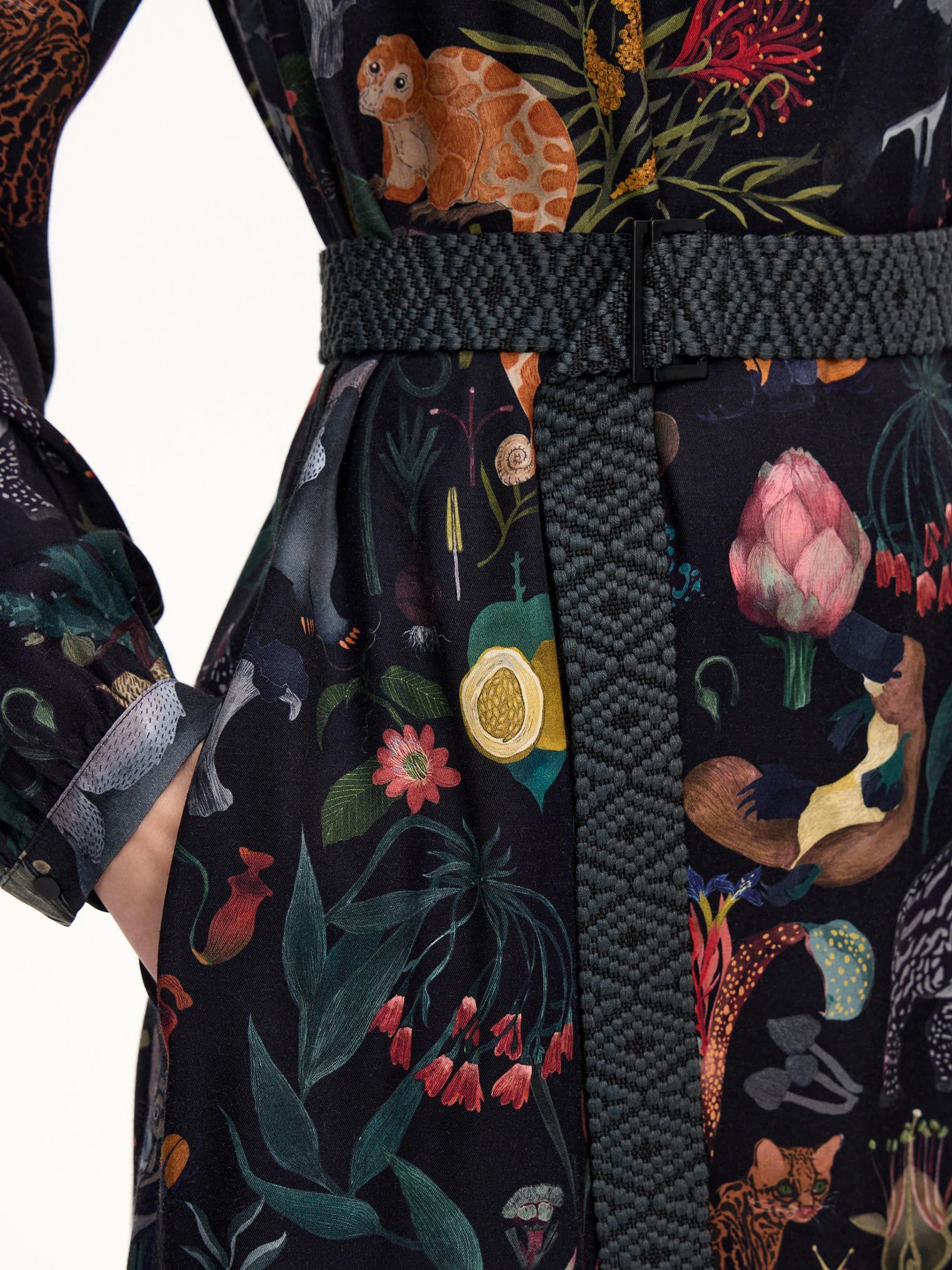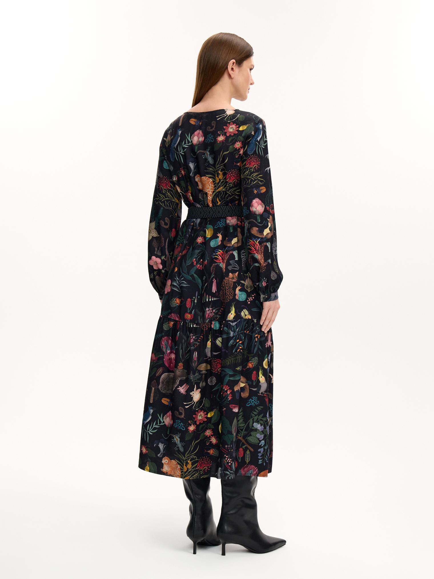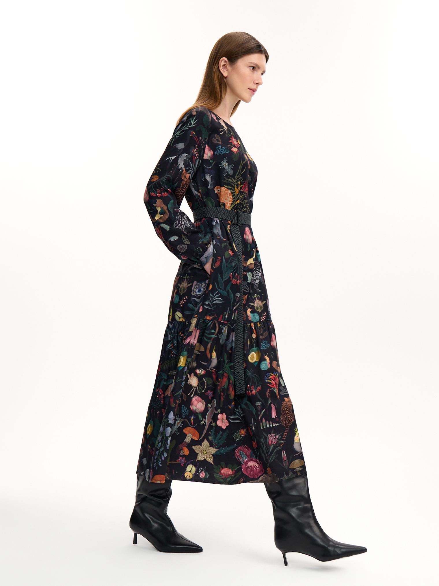 Нежное, струящееся и ультра романтичное платье с ярким графичным принтом с флорой и фауной.Модель закрытого фасона из нежной на ощупь, тёплой вискозы станет отличным вариантом на демисезонную погоду. Округлый вырез, объемные рукава и пояс в комплекте. Идеальный вариант для похода в театр или ресторан.