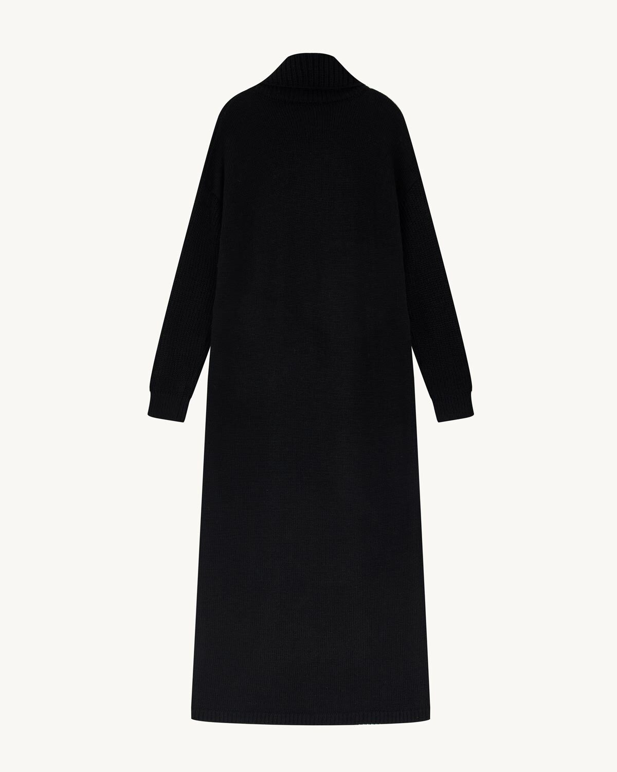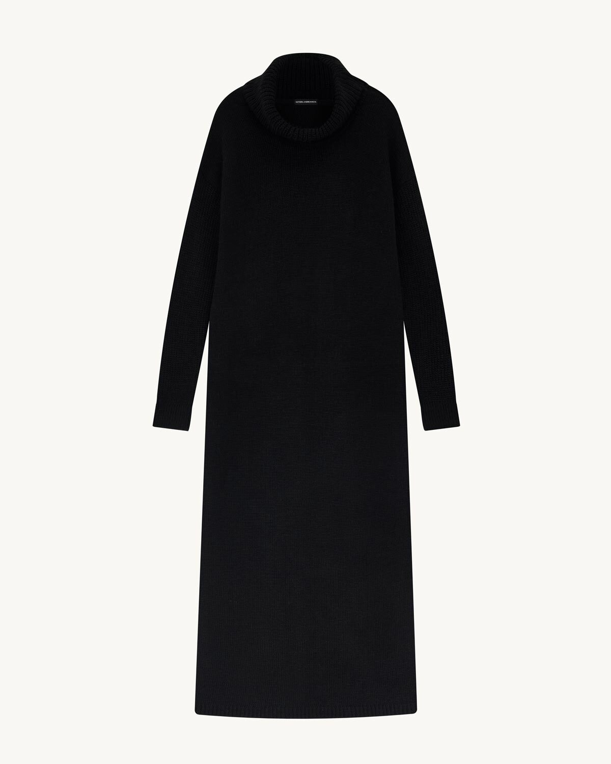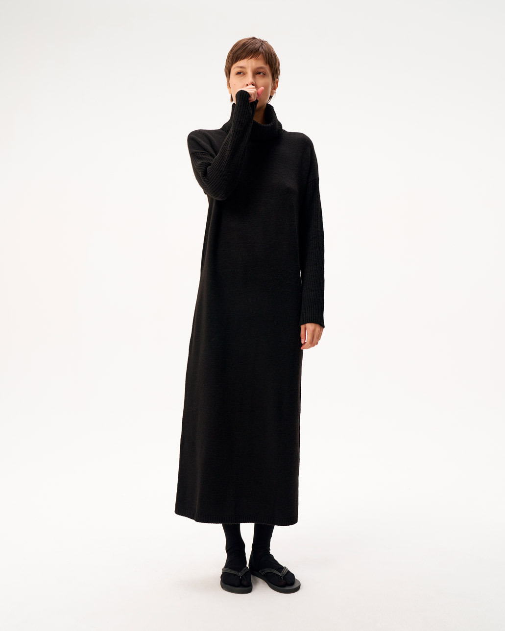 Удлинённое платье с широким воротником-стойкой. Прямой силуэт, спущенное плечо, заниженная пройма рукава.