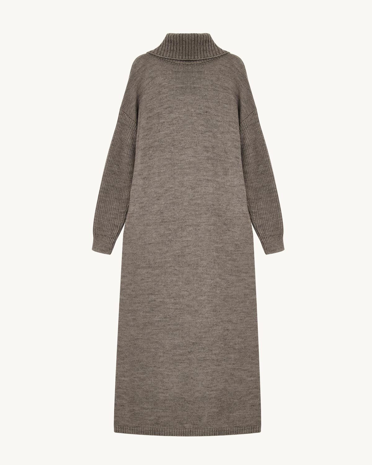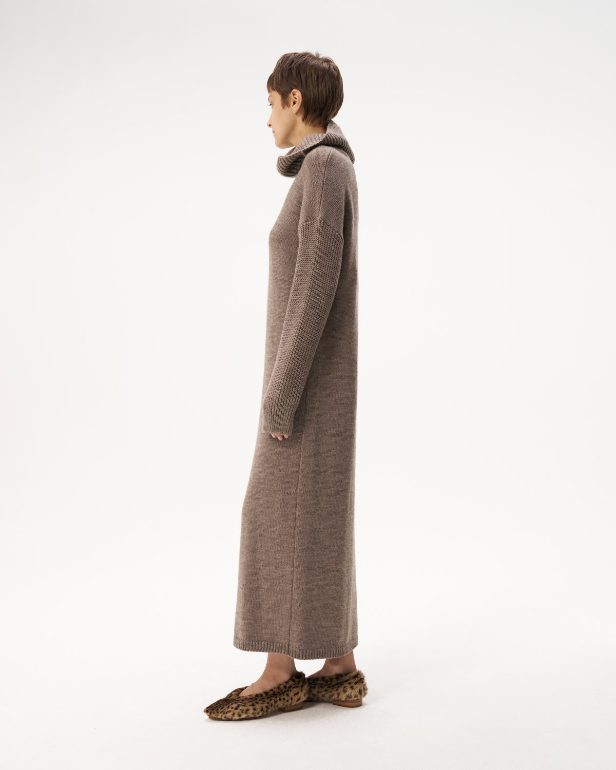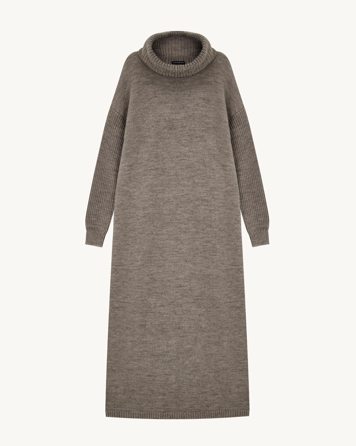 Удлинённое платье с широким воротником-стойкой. Прямой силуэт, спущенное плечо, заниженная пройма рукава.