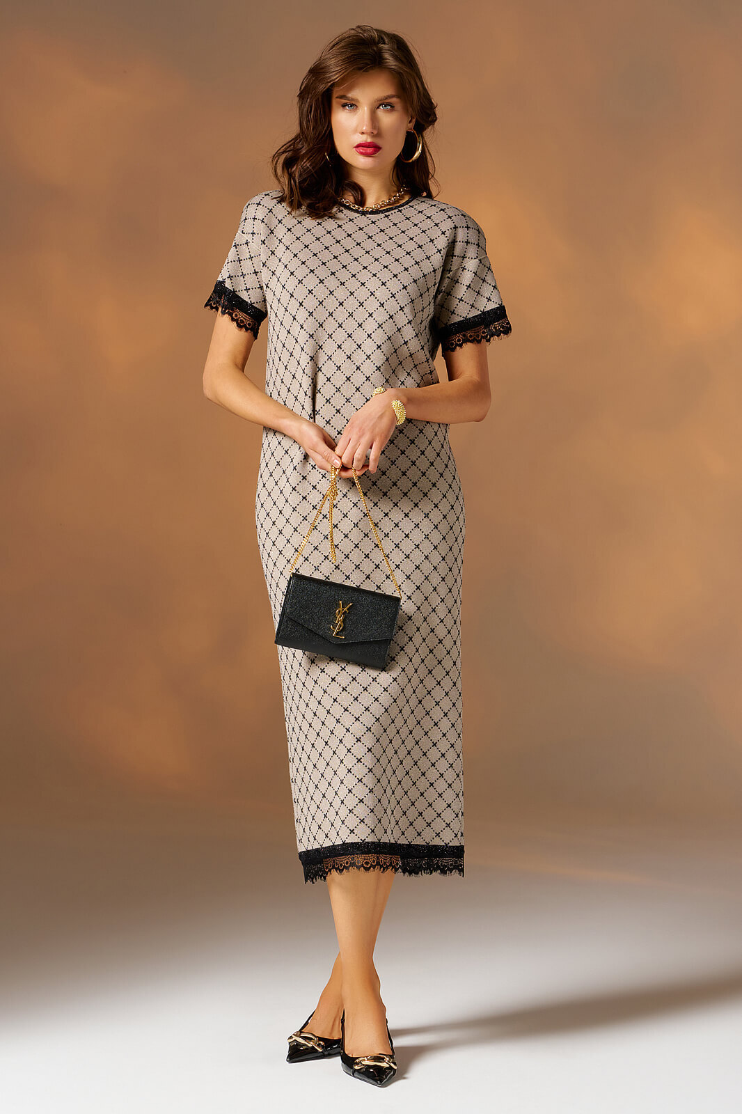Платье женское, прямого, свободного силуэта.Рукав длиной до локтя, со спущенной линией плеча.Горловина круглая, по спинке на застежку-пуговицу.Спинка со средним швом и шлицей. По низу платья и рукавам настрочено кружево.