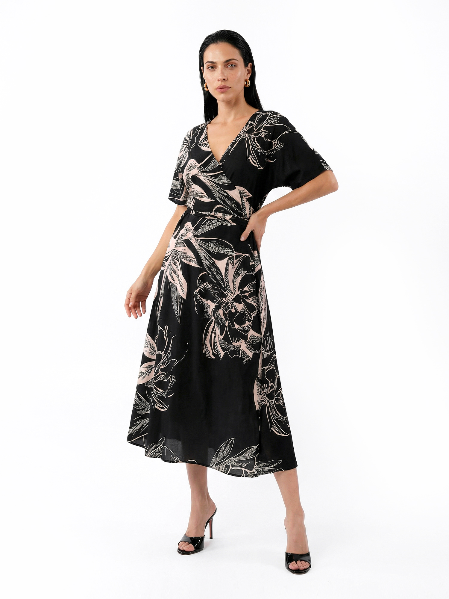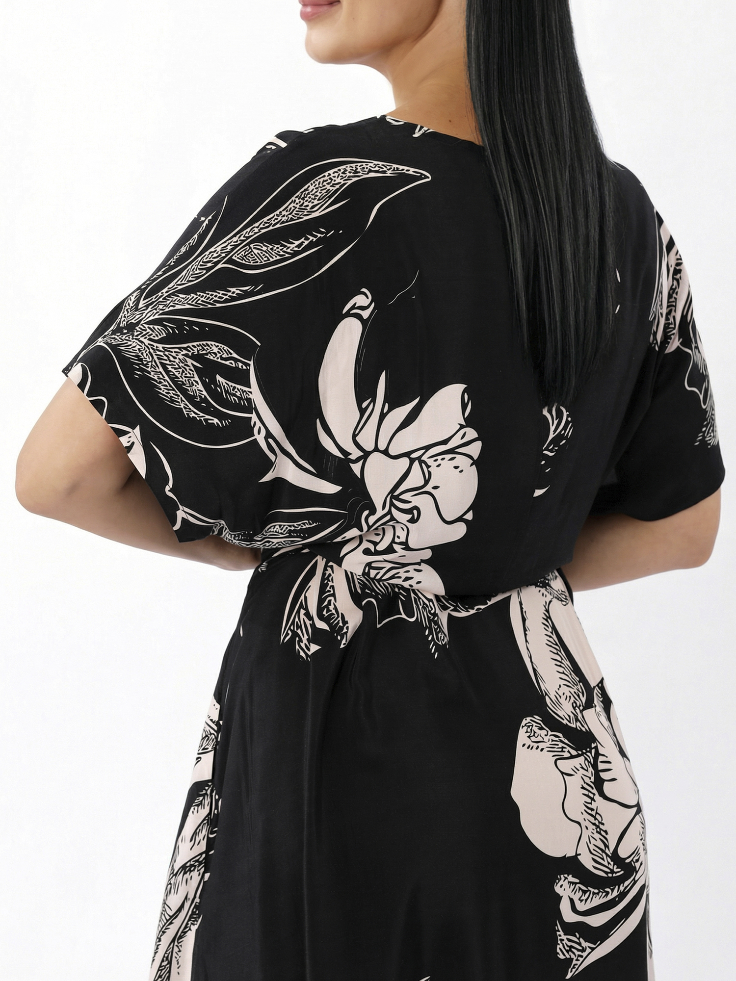 Великолепное летнее длинное платье итальянского бренда FABRETTI в монохромном дизайне: черный фон модели украшен светло-бежевым цветочным узором.Платье выполнено в приталенном крое с эффектом запАха: внутри оно фиксируется на пуговицу, снаружи – завязкой на ленту на боку. У модели глубокий V-образный вырез и короткие рукава.Ткань платья сочетает легкие дышащие материалы – район и вискозу, которые быстро сохнут и устойчивы к воздействию ультрафиолета, соленой или хлорированной воды. Идеальное решение для летнего отпуска у моря.
