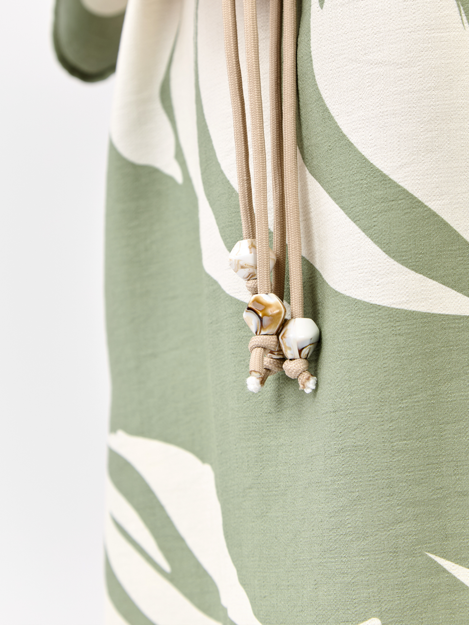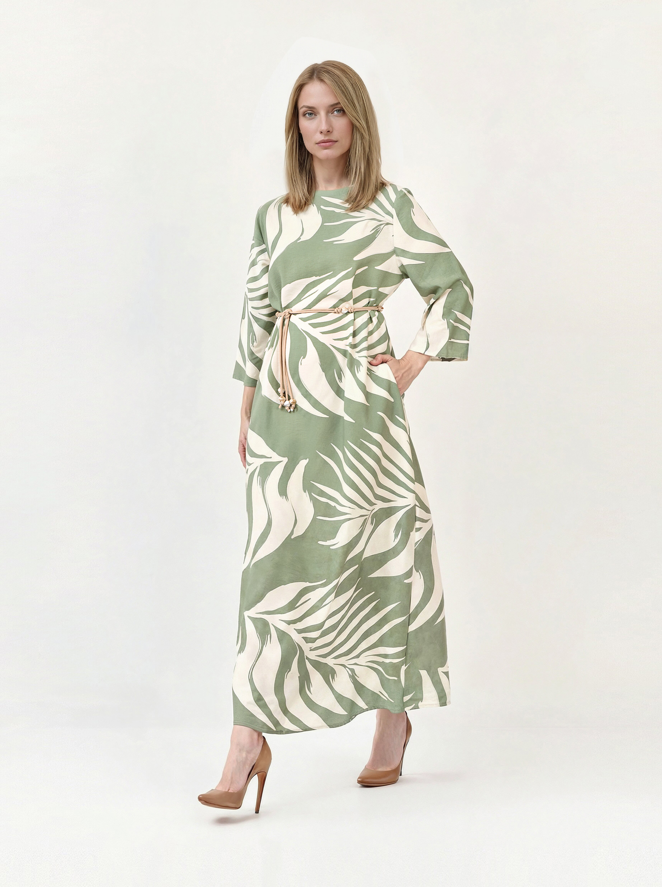 Великолепное летнее платье итальянского бренда FABRETTI мягкого фисташкового цвета с узором из тропических листьев.У платья прямой крой, рукава длиной три четверти. По бокам небольшие втачные карманы. Модель дополнена съемным плетеным поясом в технике макраме с крупными бусинами. Вырез горловины лодочкой дополнен застежкой с разрезом и пуговицей на спинке.Платье выполнено из вискозы – легкого летнего материала, которые хорошо подходит для жаркой погоды.Растительный принт на ткани придает образу легкость; ткань из дышащей вискозы имеет небольшой рельеф.Фисташковый цвет – летний тренд, который отлично подходит к загорелой коже и сочетается с большинством «природных» тонов в одежде, популярных в теплый сезон.Хорошо сочетается с однотонными аксессуарами, шляпами и сумками из соломки.