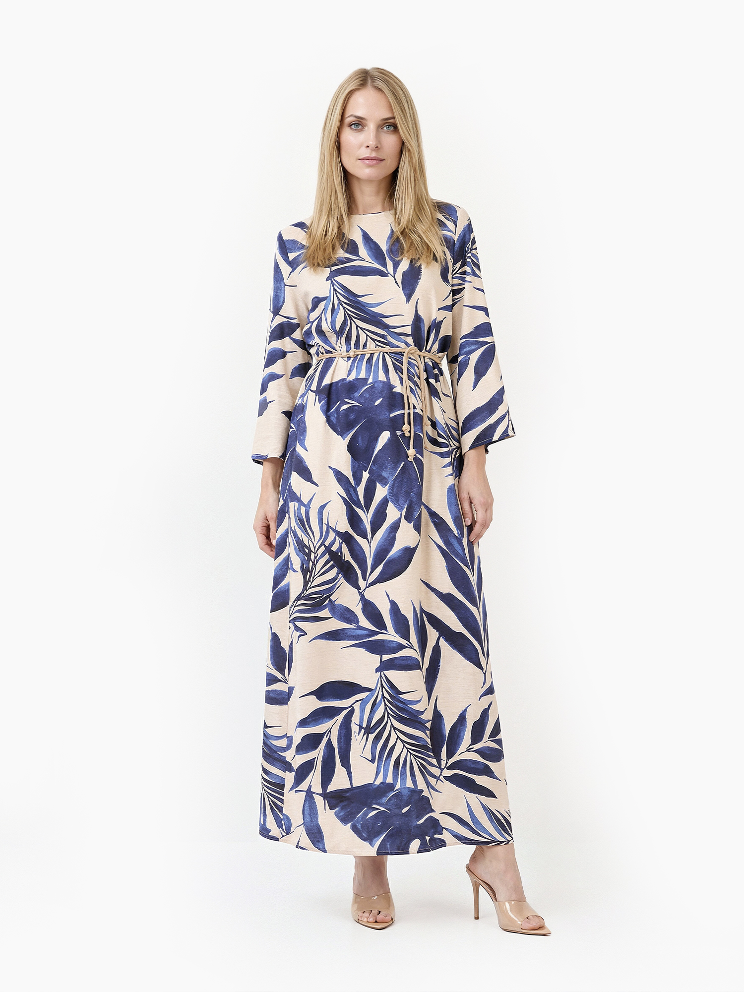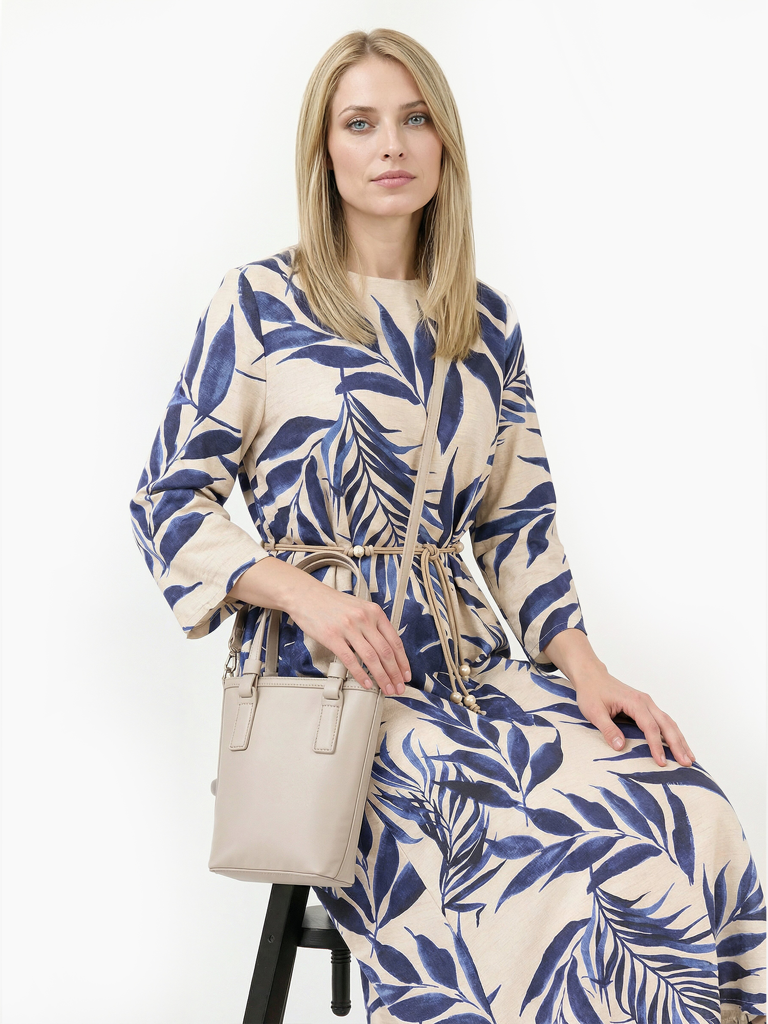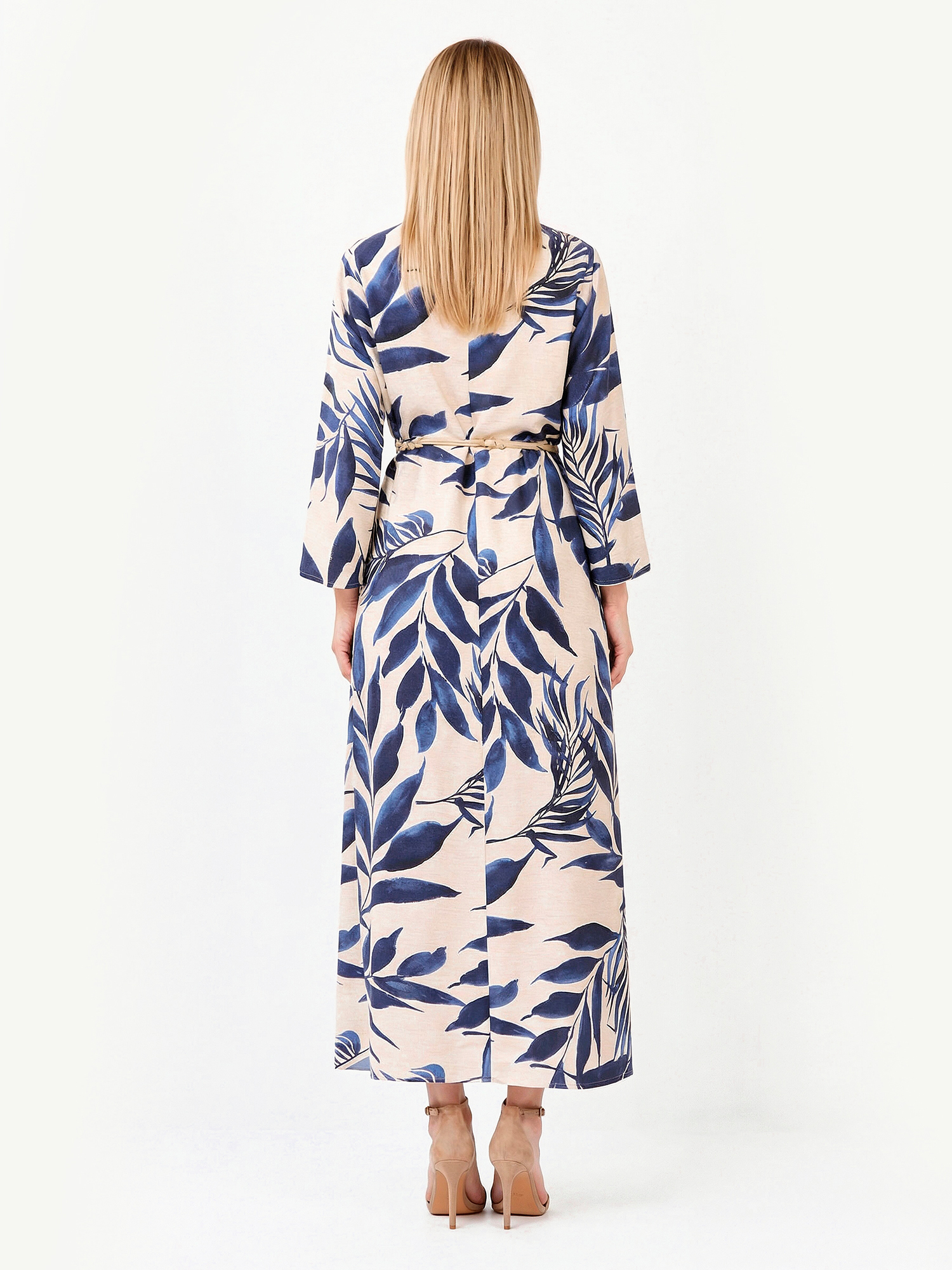 Великолепное летнее платье итальянского бренда FABRETTI светло-бежевого цвета с растительным узором, имитирующим рисунок тушью глубокого синего цвета.У платья прямой крой, рукава длиной семь восьмых. По бокам небольшие втачные карманы. Модель дополнена съемным плетеным поясом в технике макраме с крупными бусинами. Вырез горловины лодочкой дополнен застежкой с разрезом и пуговицей на спинке.Платье выполнено из вискозы с добавлением льна – легких летних материалов, которые хорошо подходят для жаркой погоды.Насыщенный синий узор модели смотрится женственно и элегантно, он прекрасно подходит не только для пляжной моды, но и для городского стиля. Хорошо сочетается с однотонными аксессуарами, шляпами и сумками из соломки.