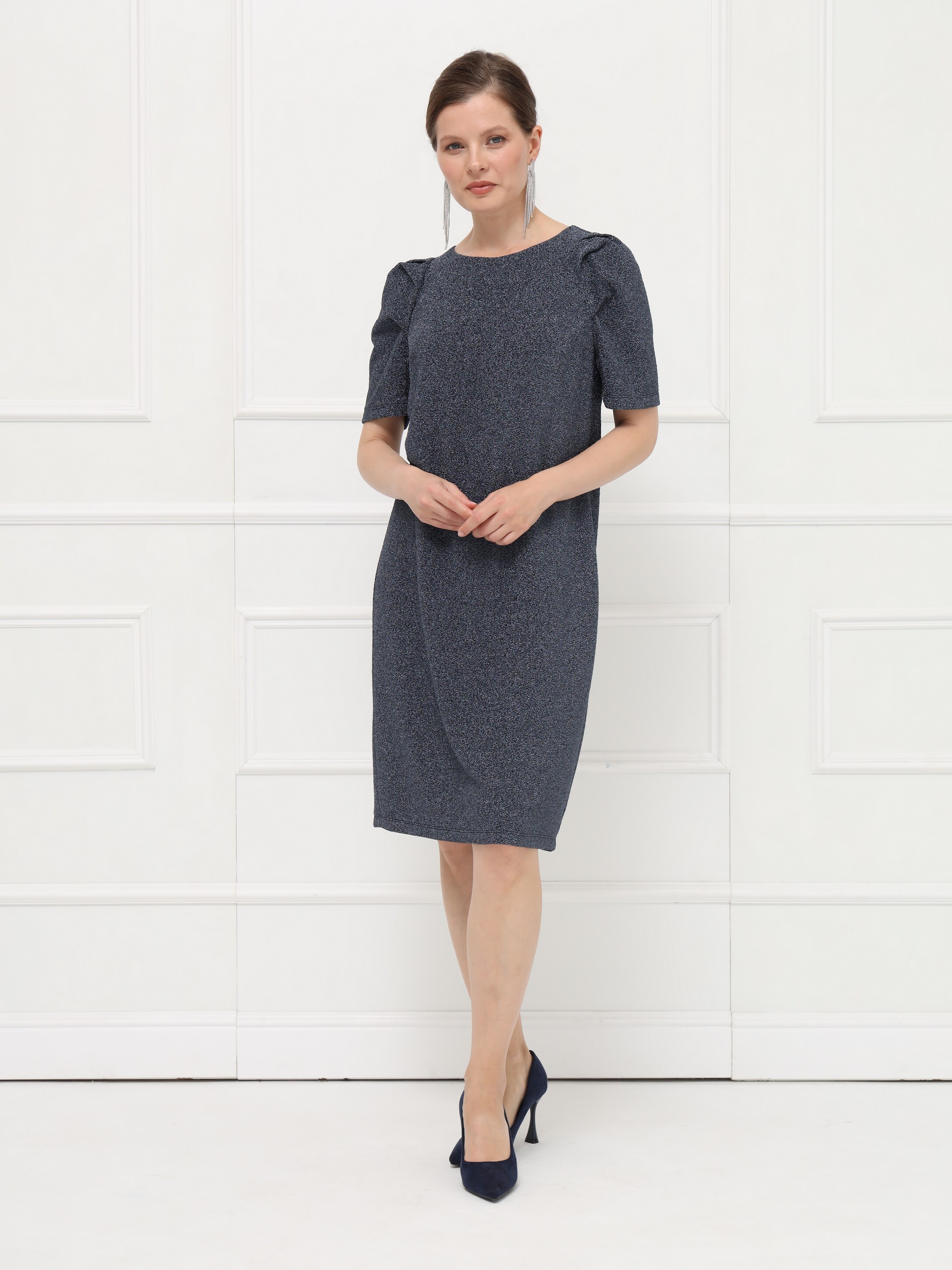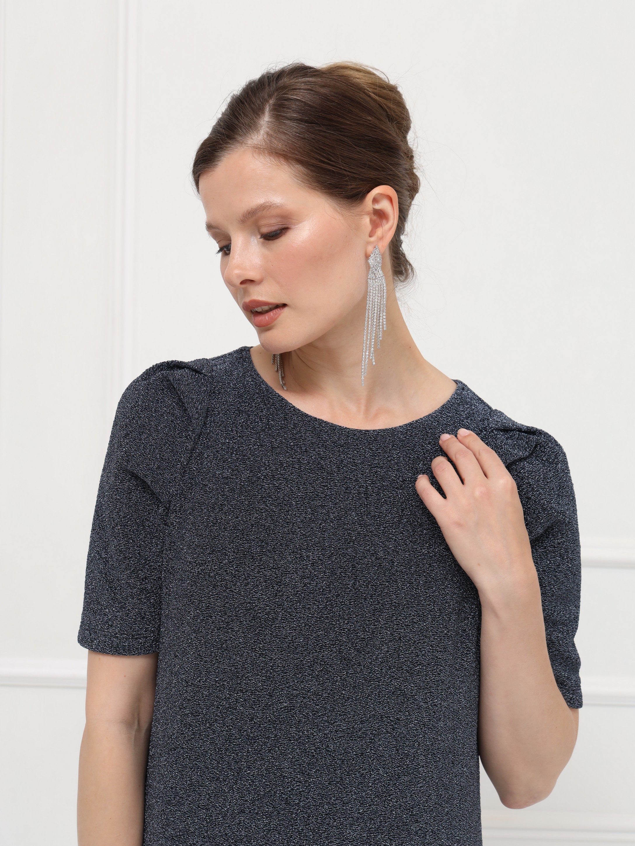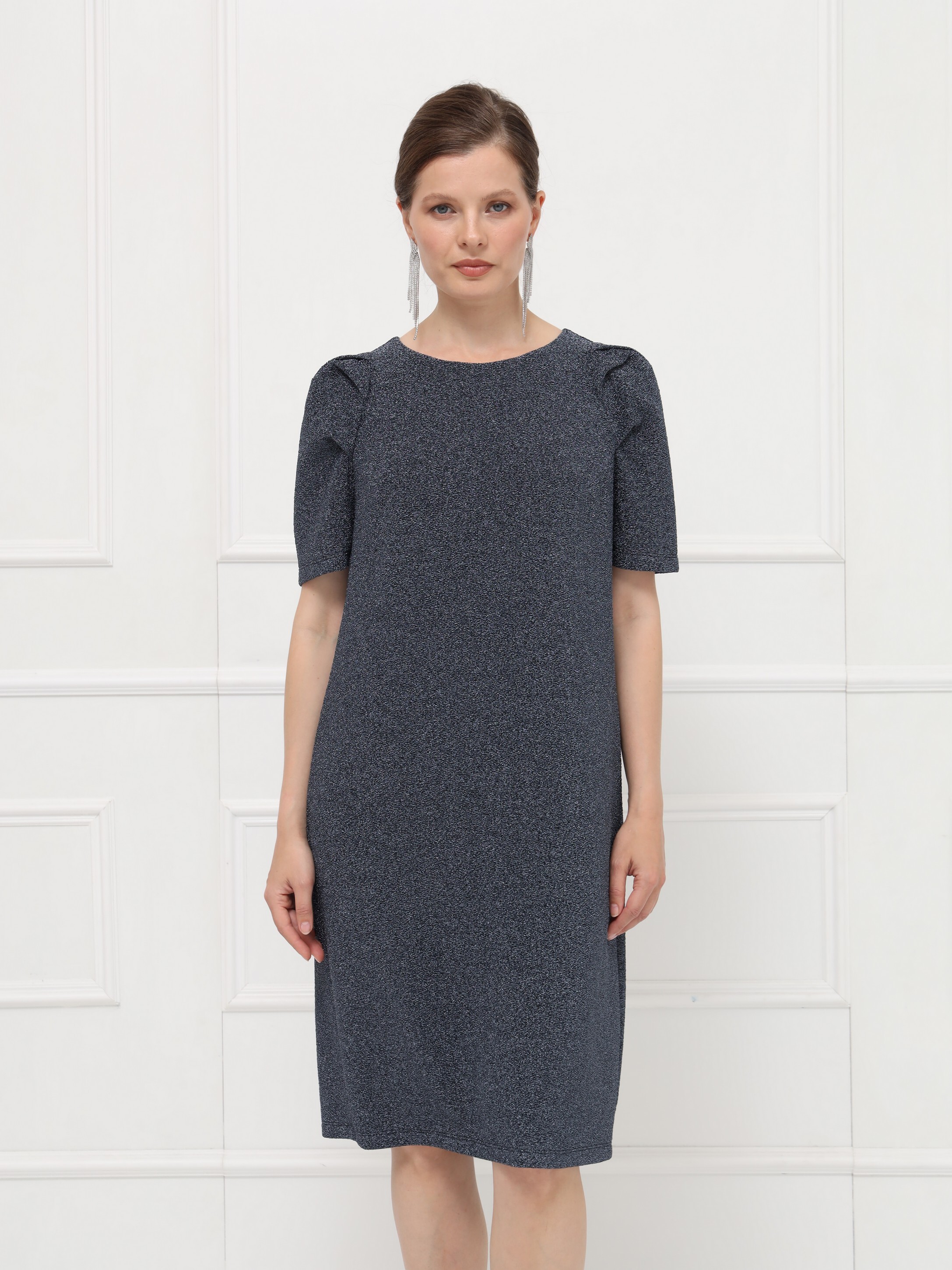 Элегантное платье, полуприлегающего силуэта из тонкого трикотажа графитового оттенка, с деликатным мерцанием. Короткие рукава с глубокими складками на окате придают образу особую выразительность, а подкладка обеспечивает идеальную посадку и комфорт. Длина до середины колена делает модель универсальной для торжественных и коктейльных выходов.