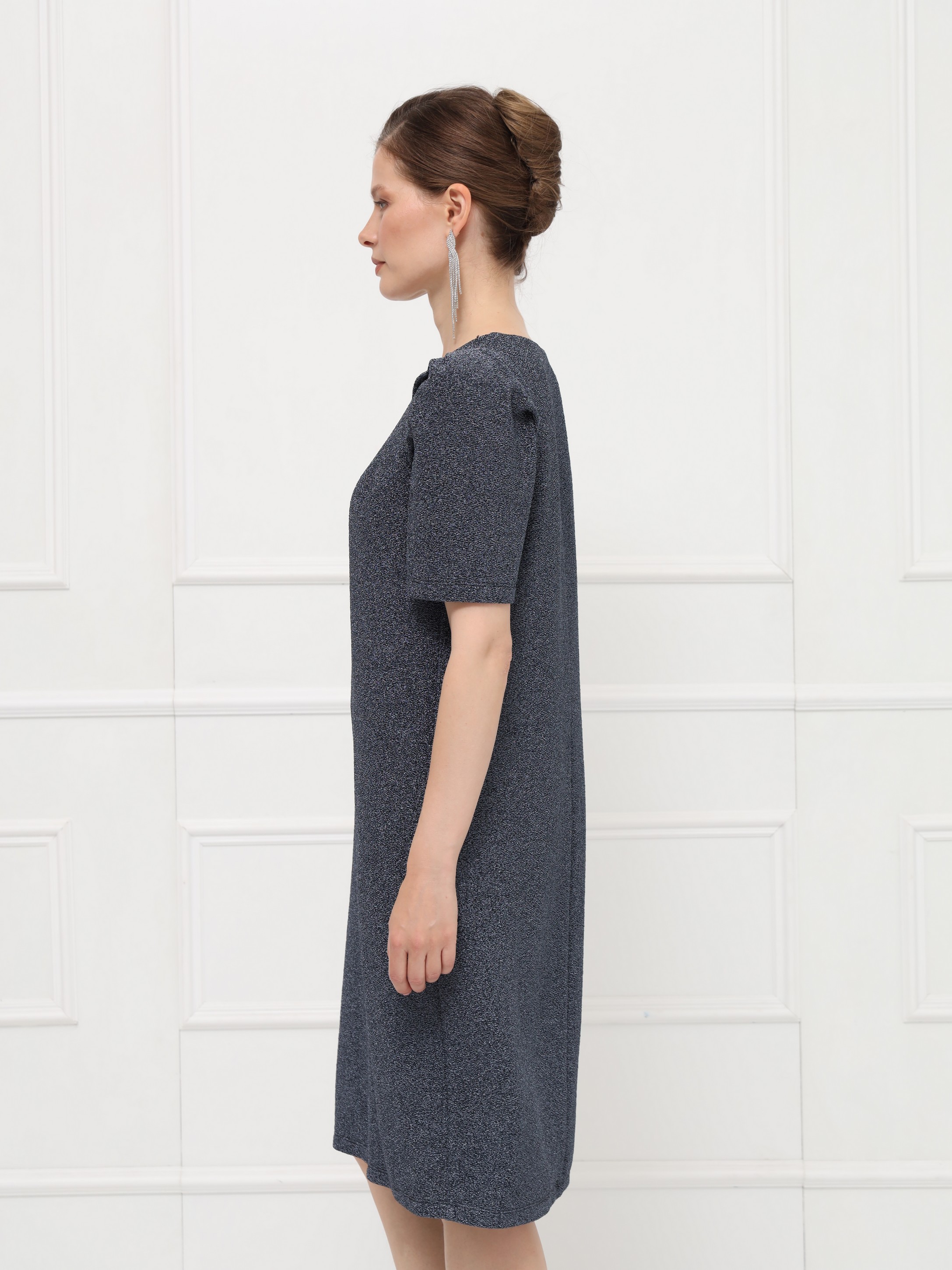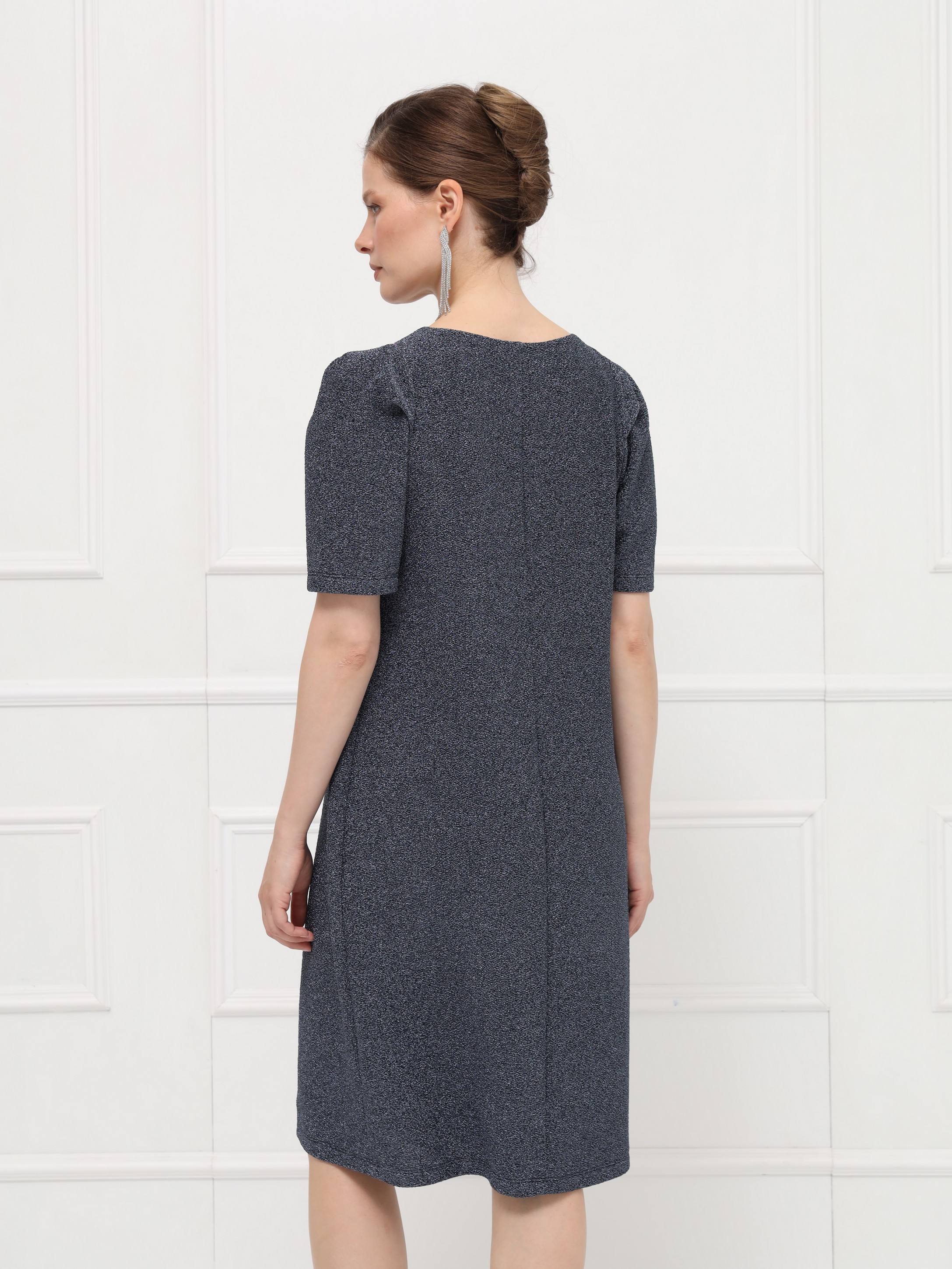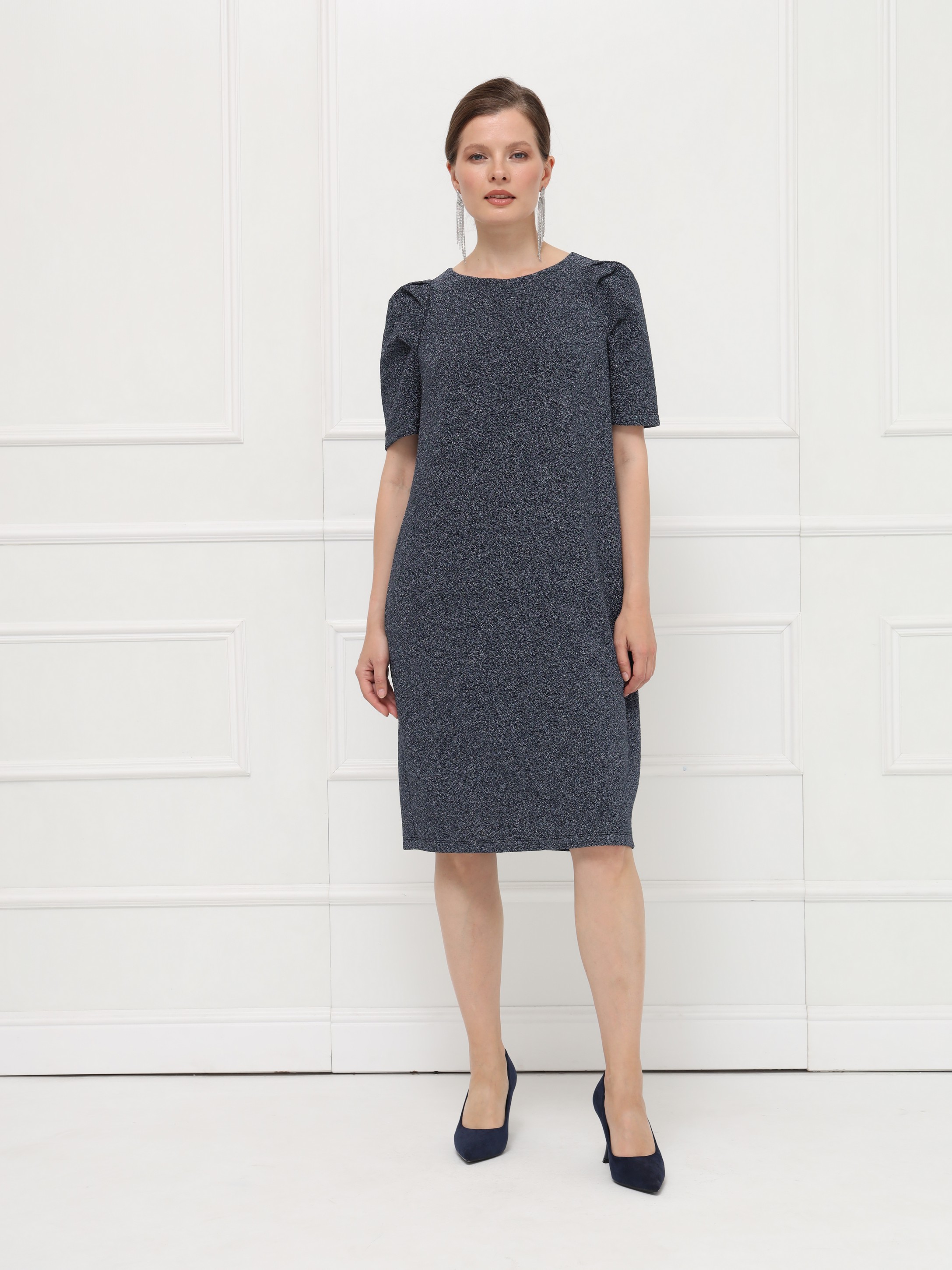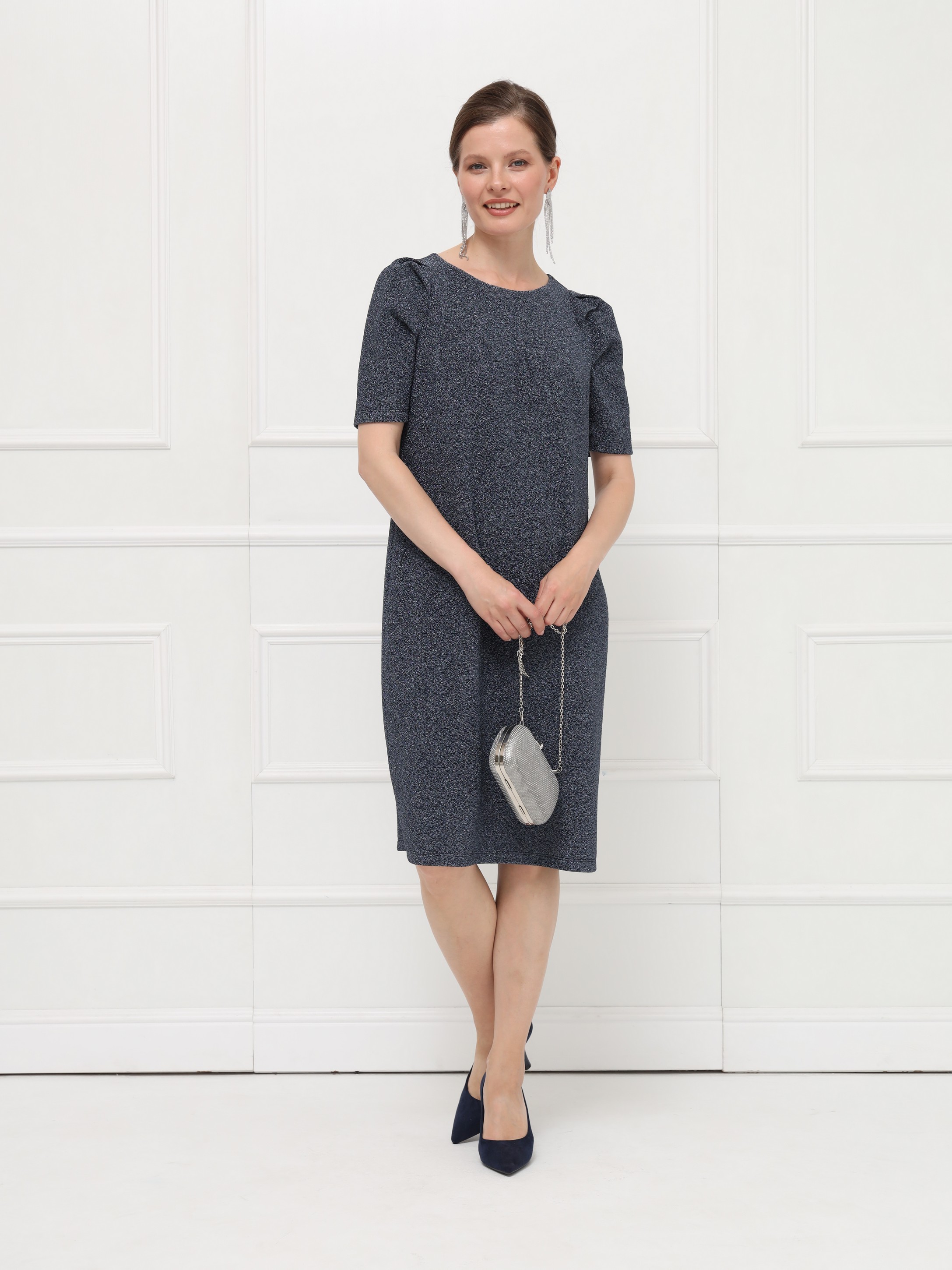 Элегантное платье, полуприлегающего силуэта из тонкого трикотажа графитового оттенка, с деликатным мерцанием. Короткие рукава с глубокими складками на окате придают образу особую выразительность, а подкладка обеспечивает идеальную посадку и комфорт. Длина до середины колена делает модель универсальной для торжественных и коктейльных выходов.