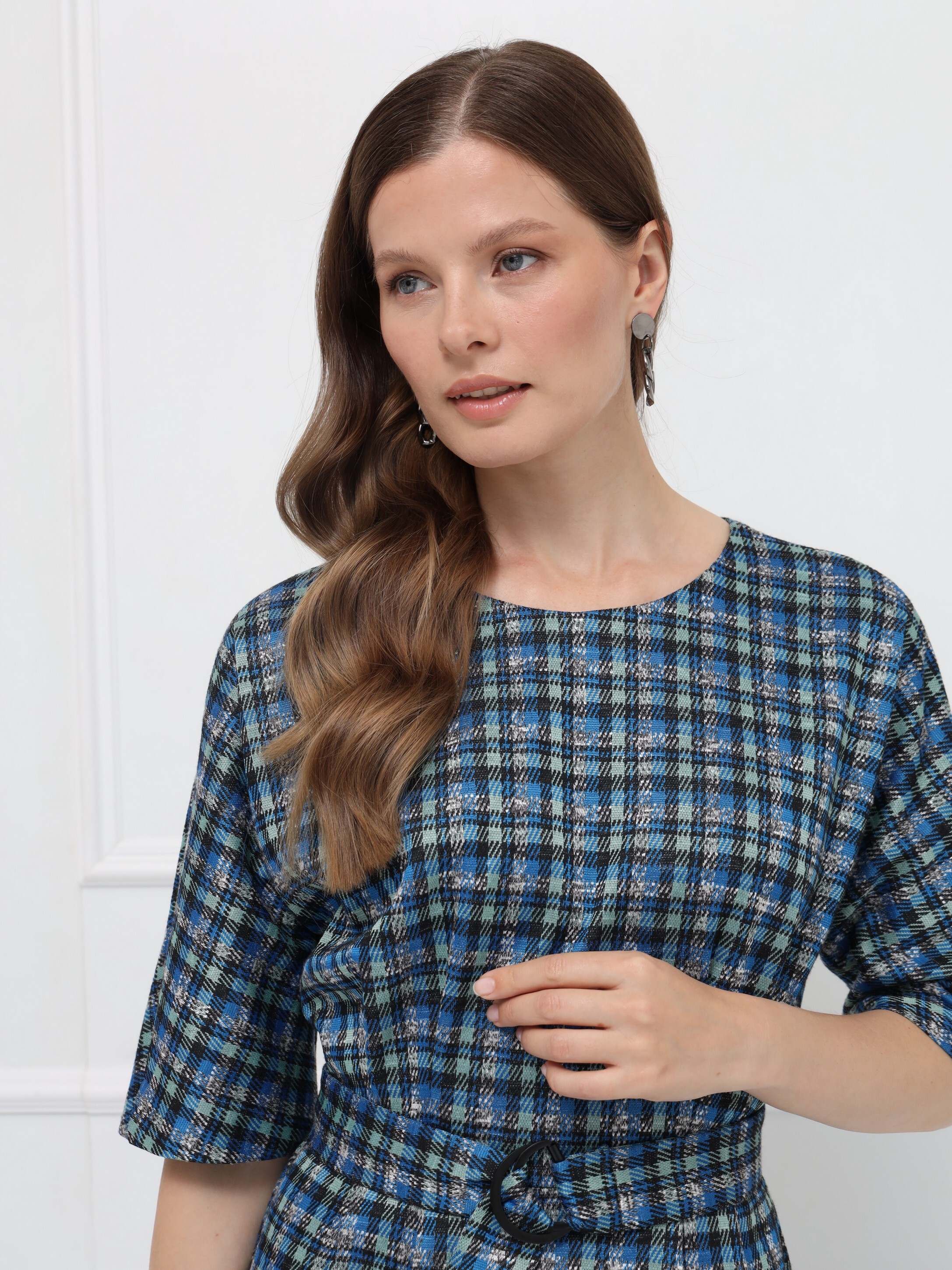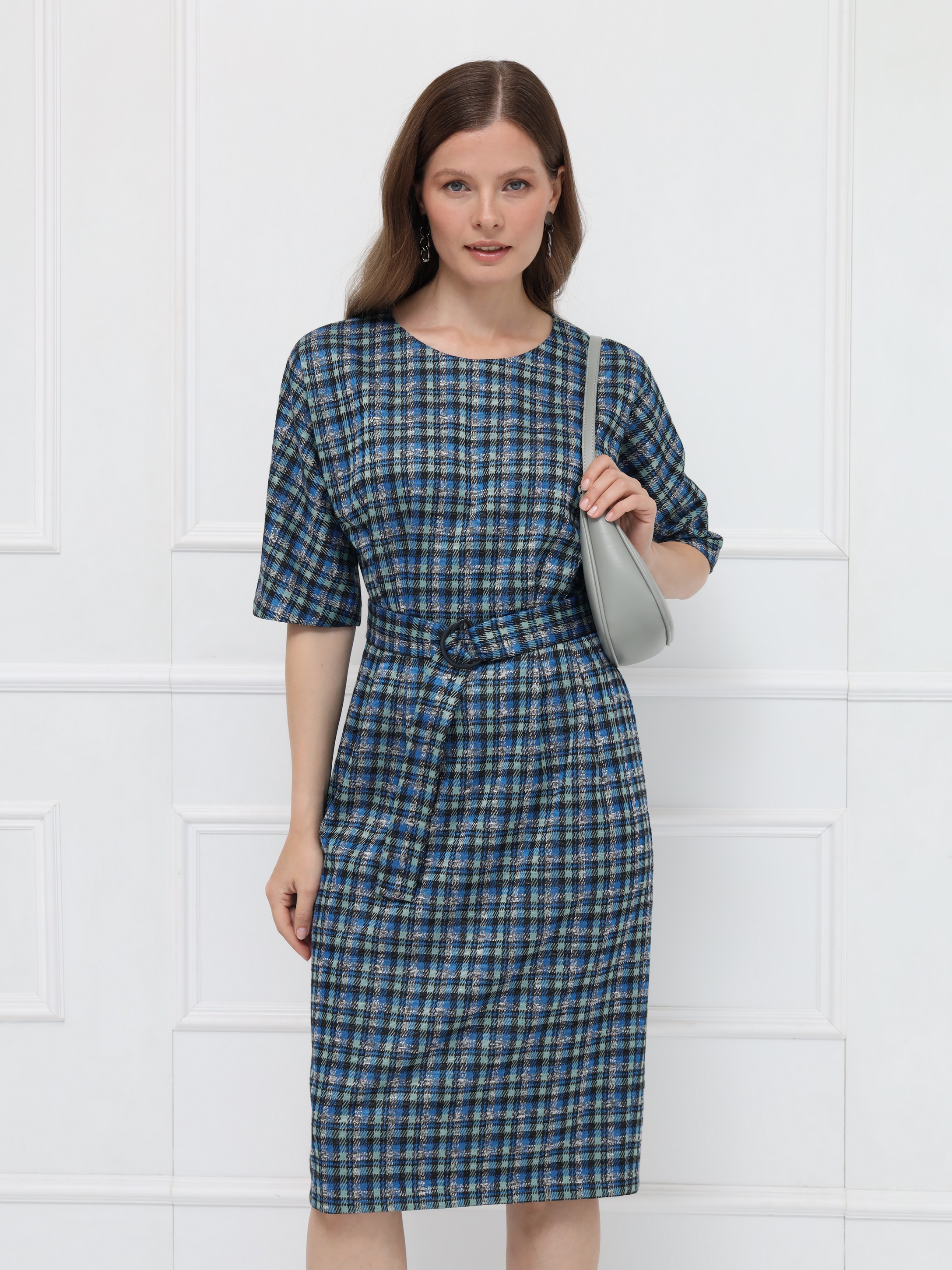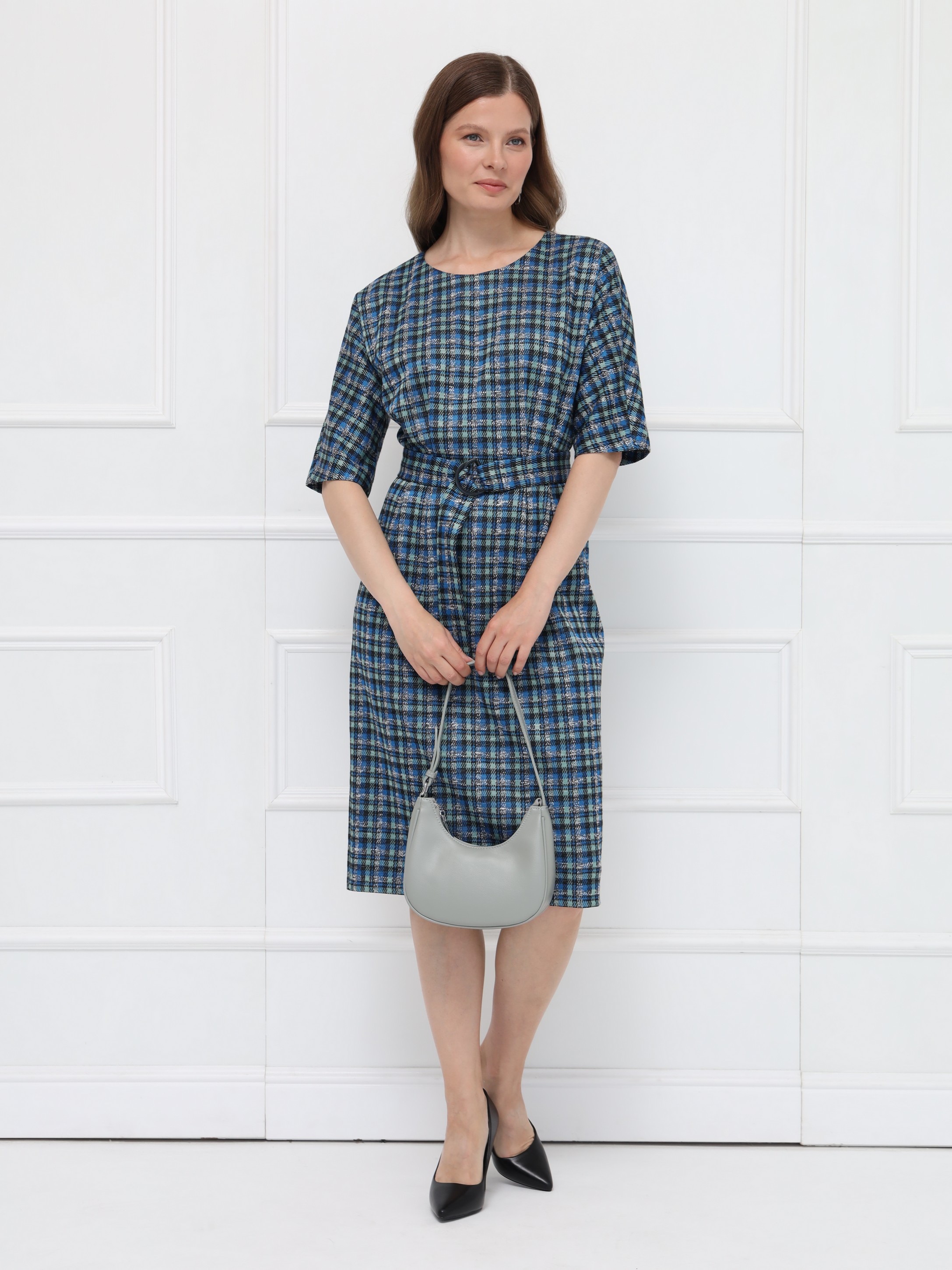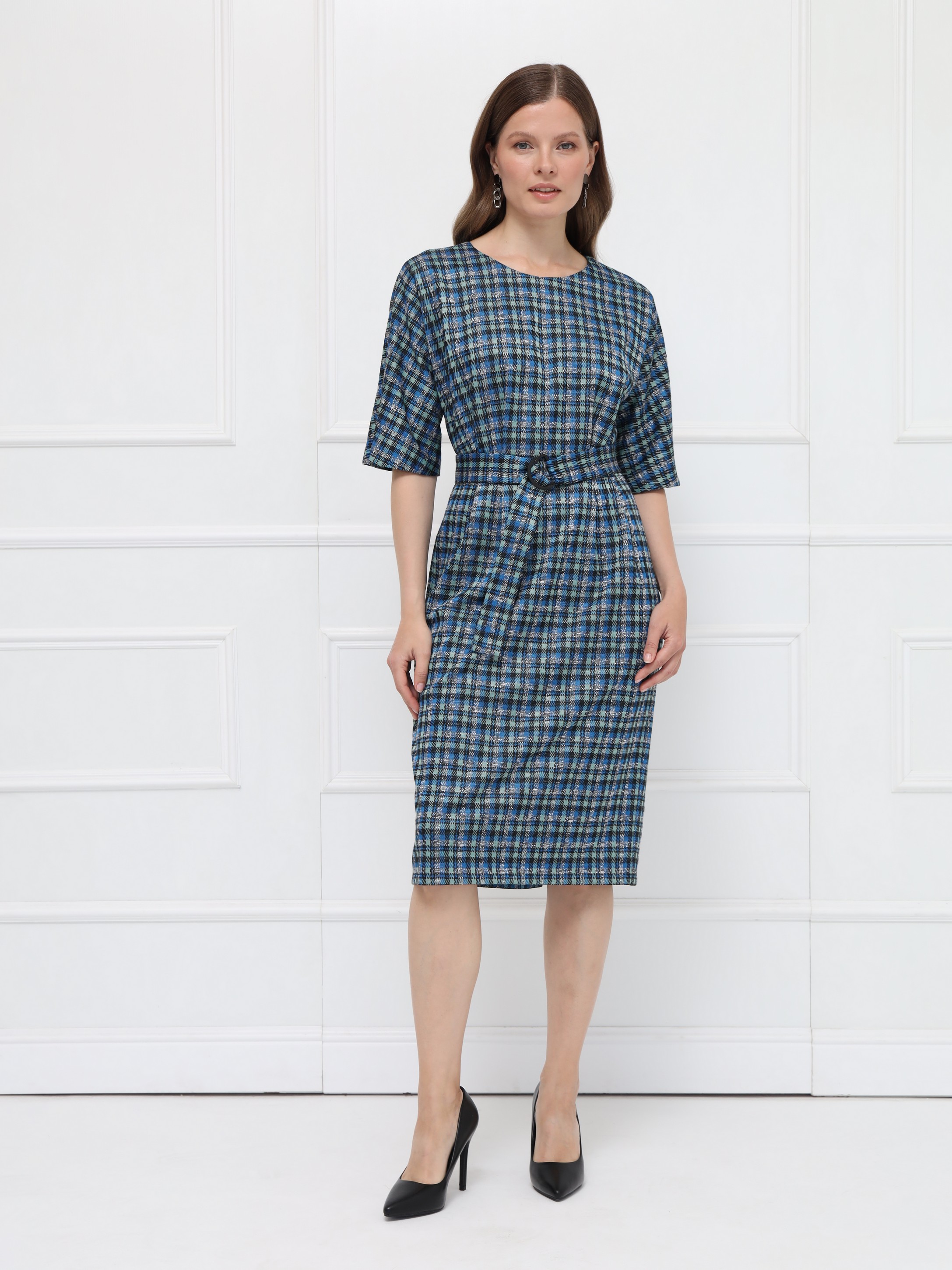 Элегантное платье полуприлегающего силуэта, идеально подчеркивающее фигуру. Цельнокроеные рукава длины 3/4 идеально ложатся под жакет или верхнюю одежду. Вытачки и мягкие застроченные складки создают аккуратный женственный силуэт, а пояс акцентирует талию. На спинке — изящная шлица и застёжка-молния. Модель выполнена из мягкого трикотажа с мелким принтом «микроклетка» в благородной сине-серой гамме. Универсальная длина до середины колена делает платье подходящим как для офиса, так и для повседневных образов.