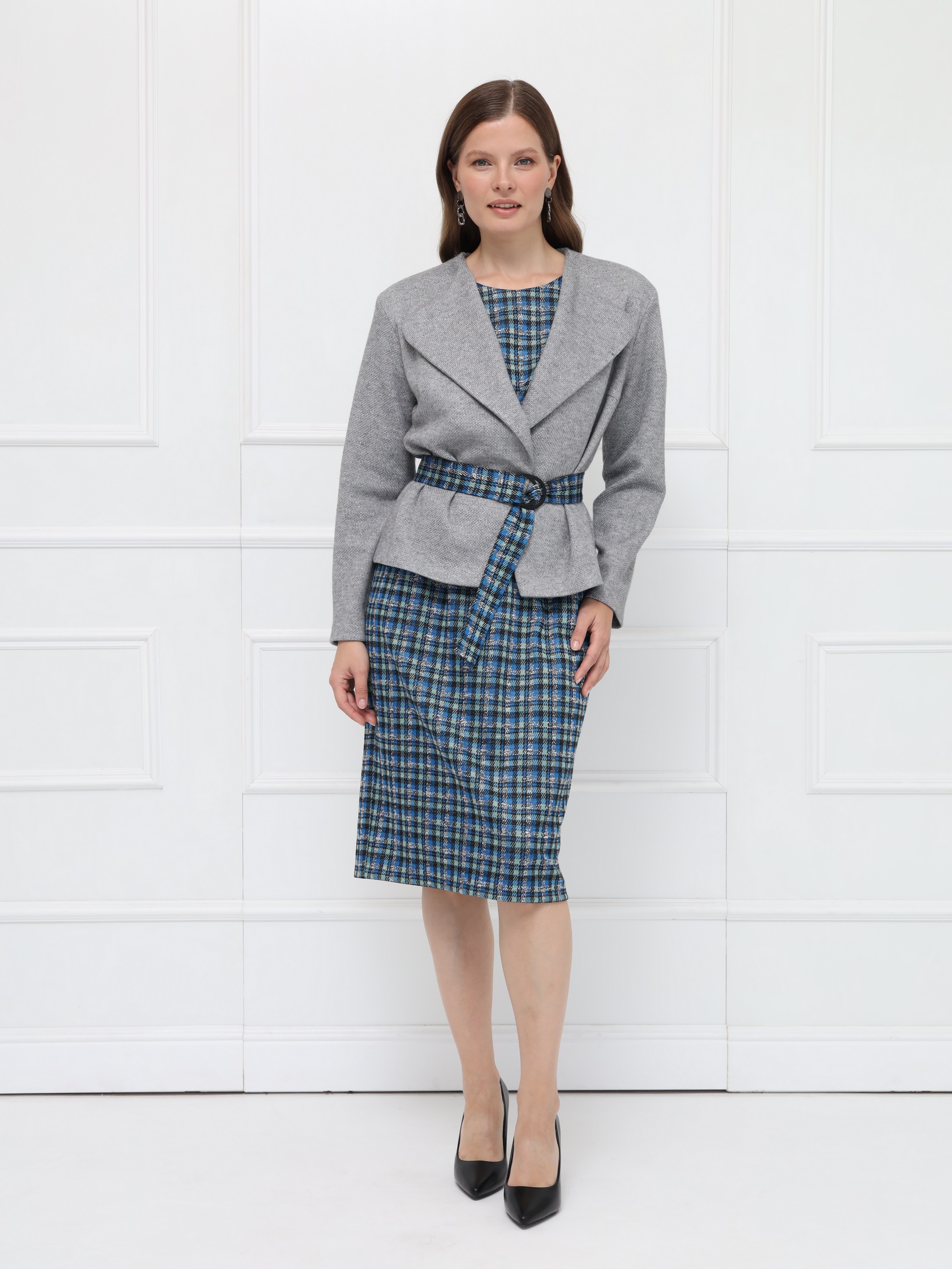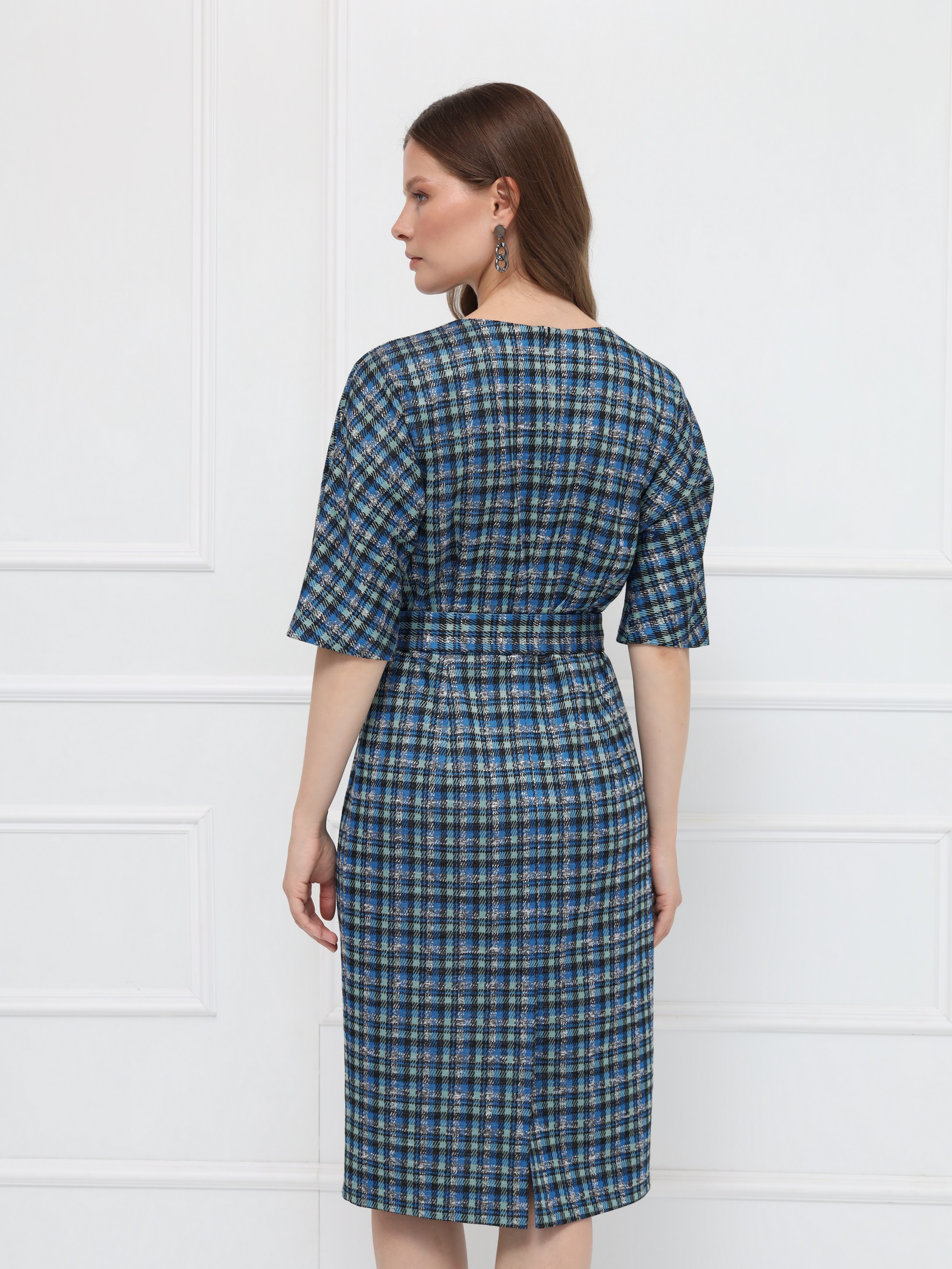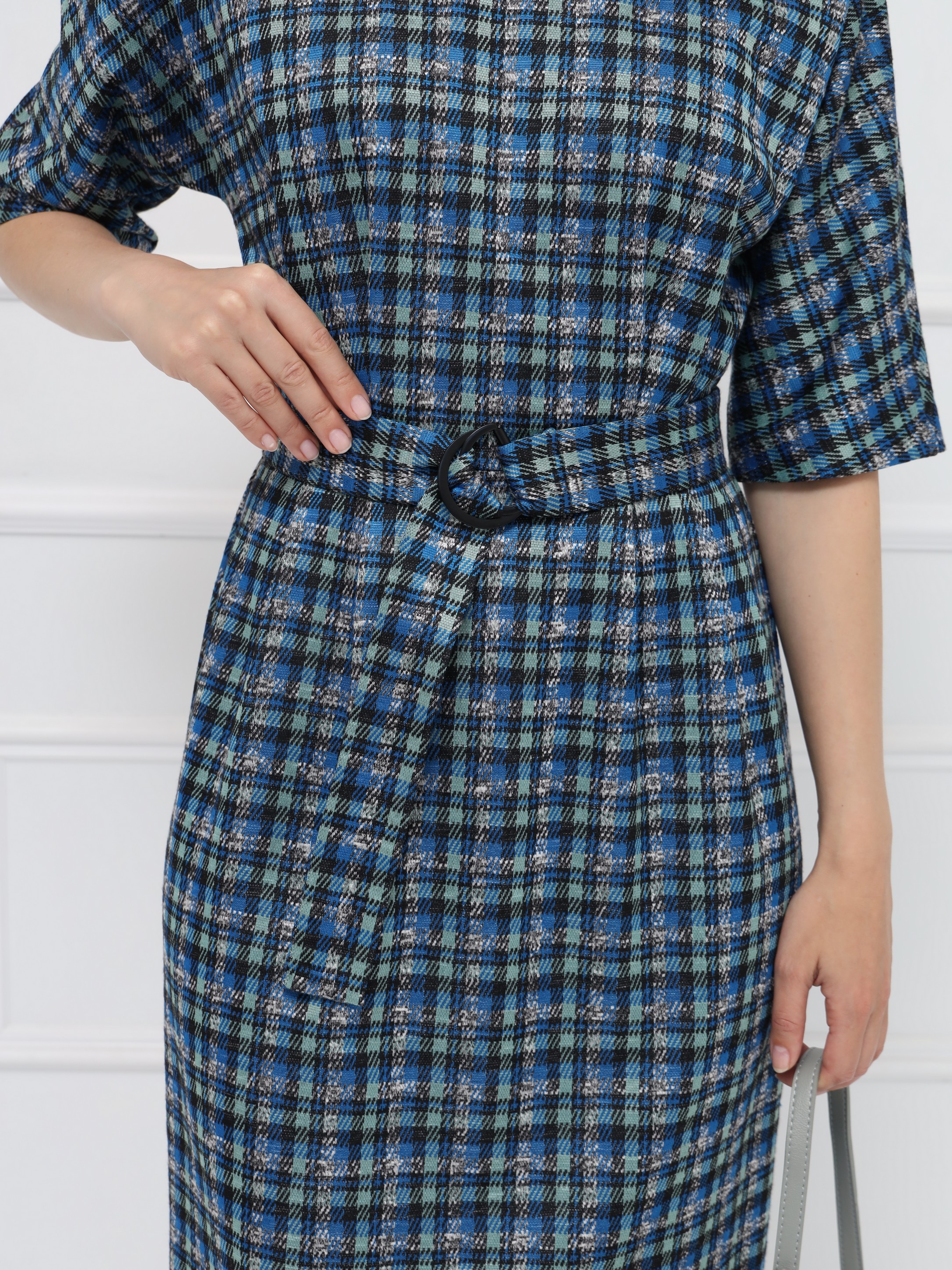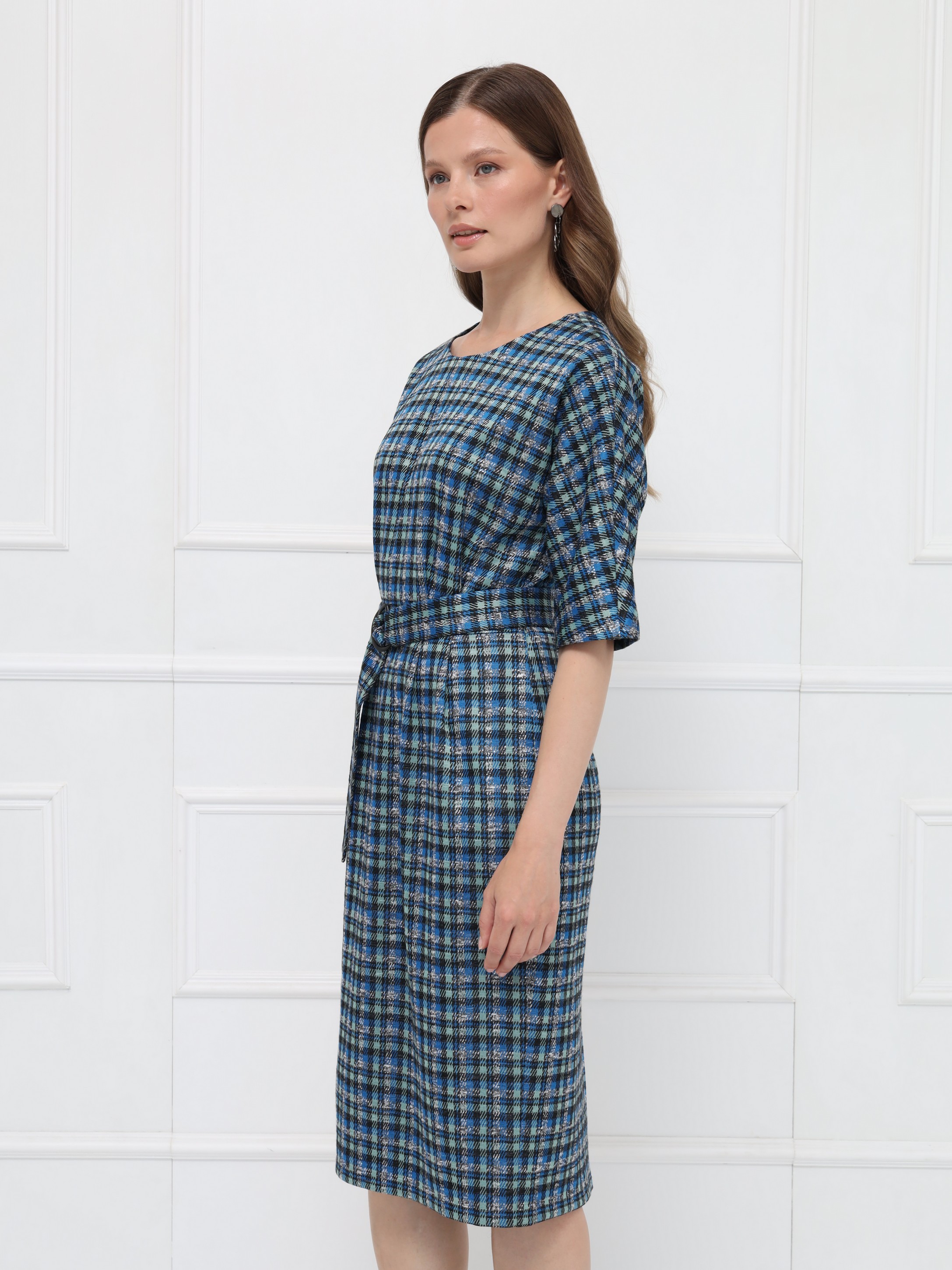 Элегантное платье полуприлегающего силуэта, идеально подчеркивающее фигуру. Цельнокроеные рукава длины 3/4 идеально ложатся под жакет или верхнюю одежду. Вытачки и мягкие застроченные складки создают аккуратный женственный силуэт, а пояс акцентирует талию. На спинке — изящная шлица и застёжка-молния. Модель выполнена из мягкого трикотажа с мелким принтом «микроклетка» в благородной сине-серой гамме. Универсальная длина до середины колена делает платье подходящим как для офиса, так и для повседневных образов.