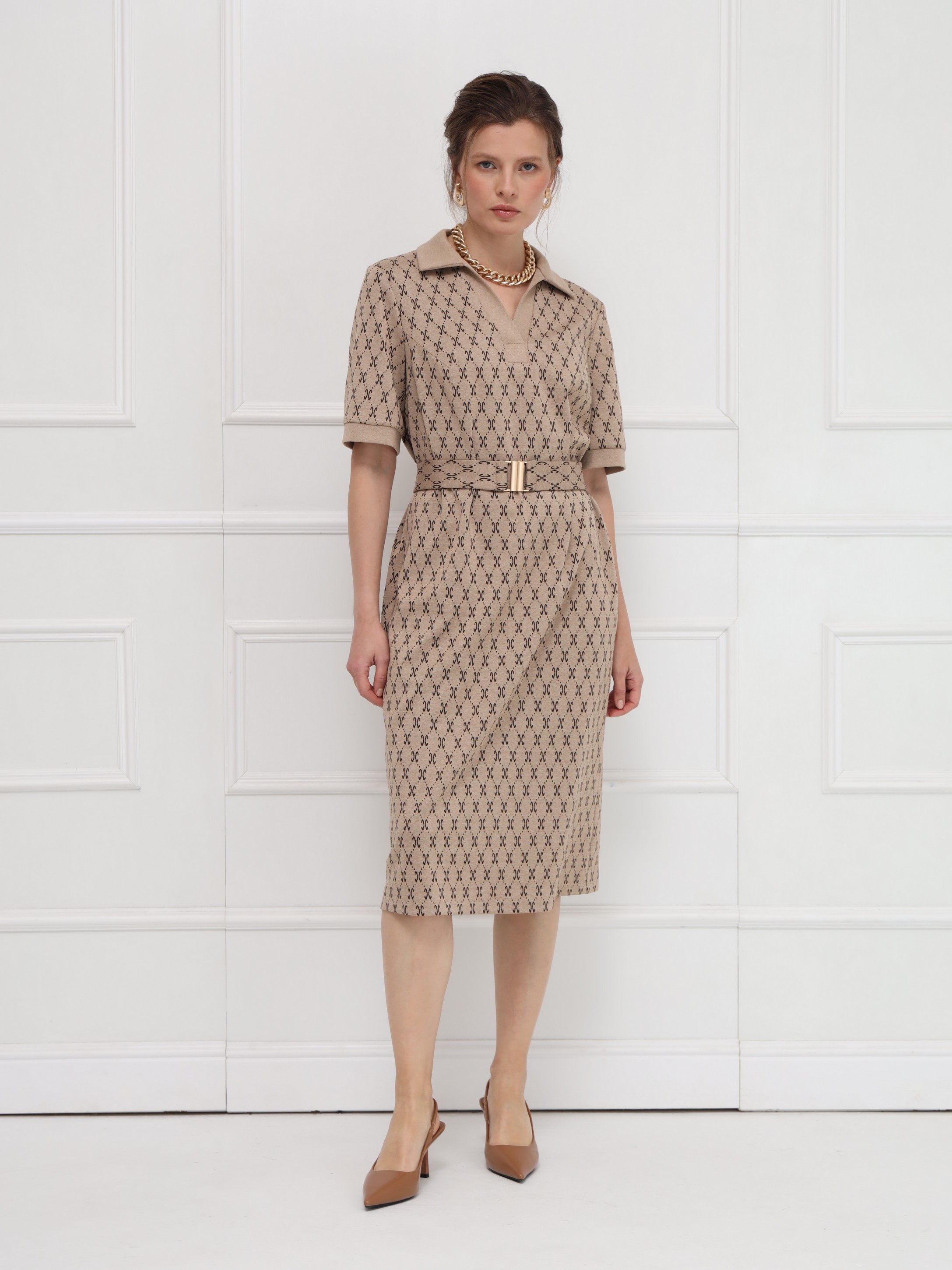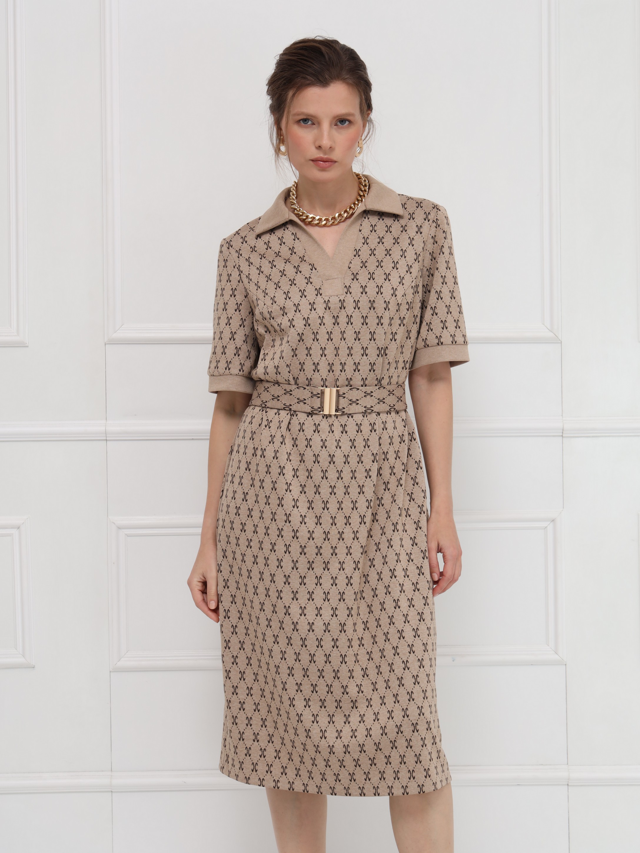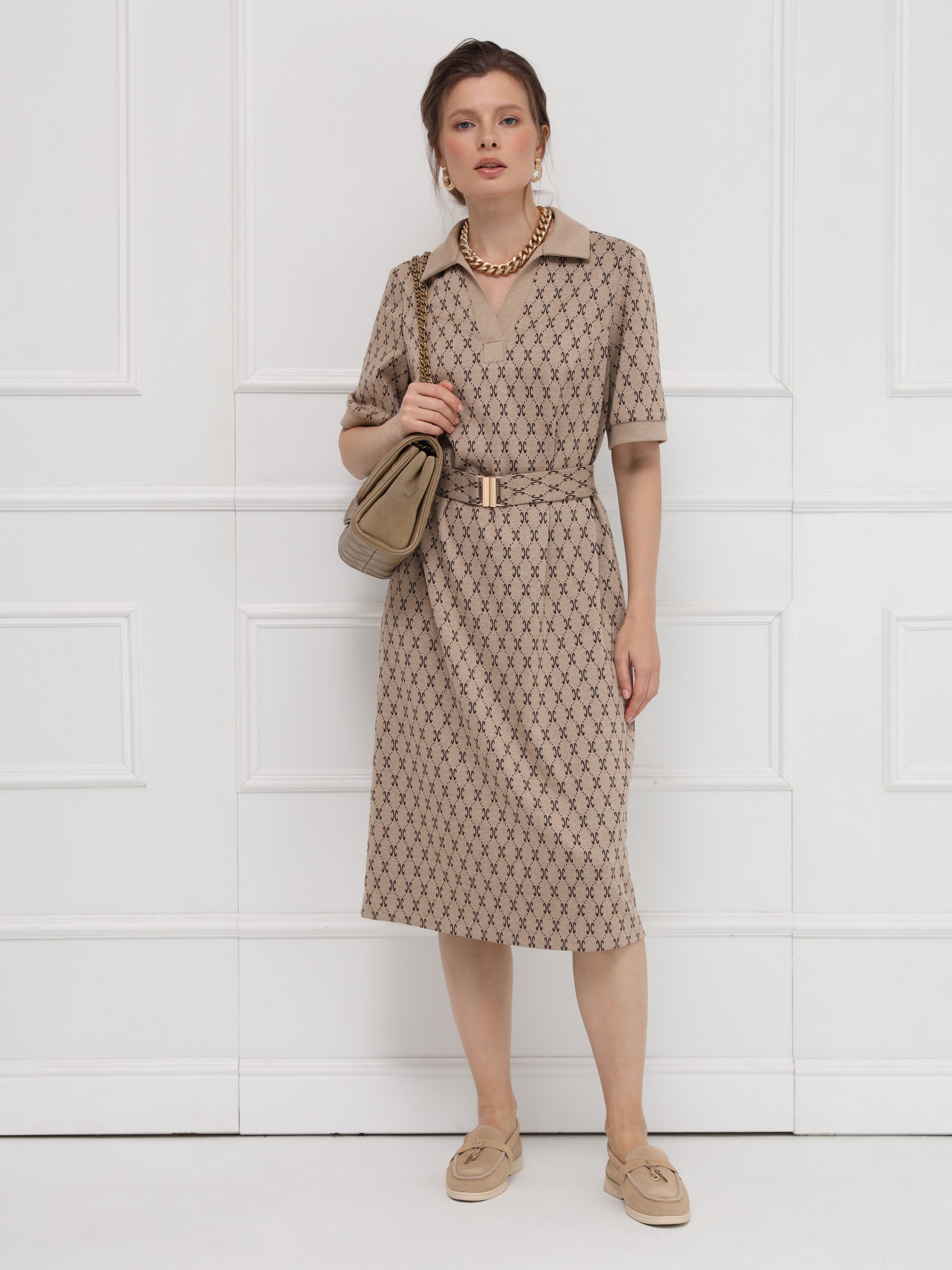 Стильное платье в благородном бежевом оттенке с принтом, напоминающим мотивы люксовых брендов. Прямой силуэт и воротник поло придают образу сдержанную элегантность, а короткие рукава на манжетах добавляют нотку лёгкости. Пояс с пряжкой формирует изящный акцент на фигуре. Идеальное решение для свежих весенних образов.