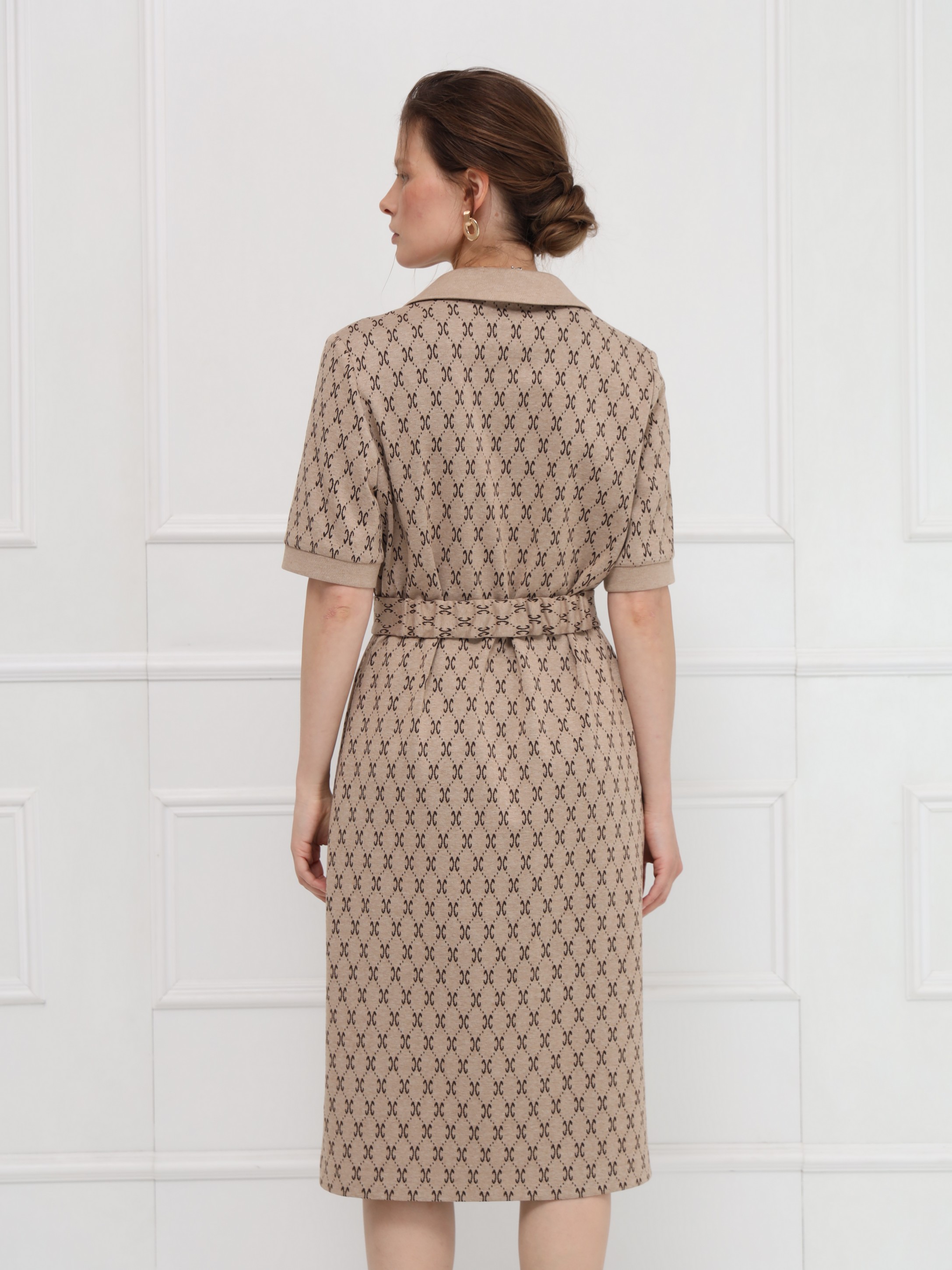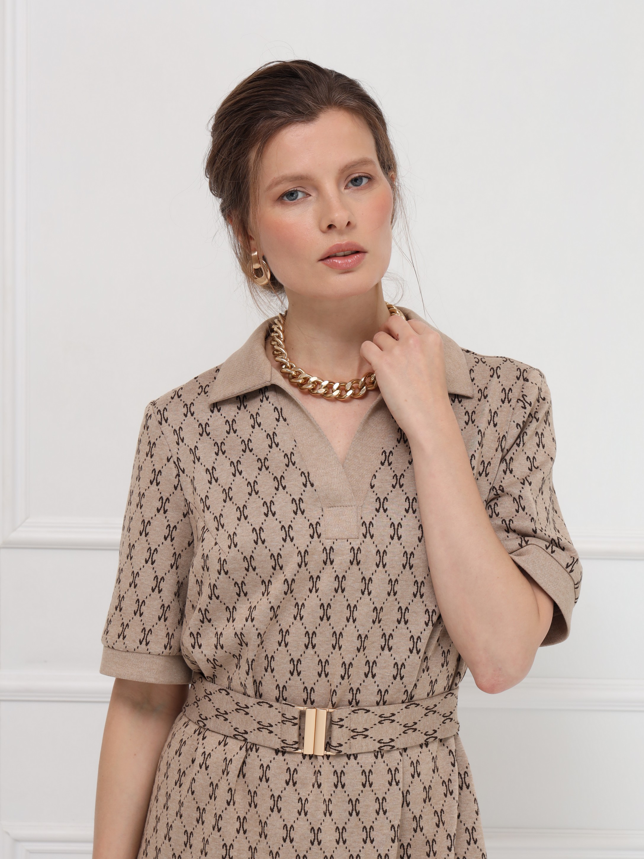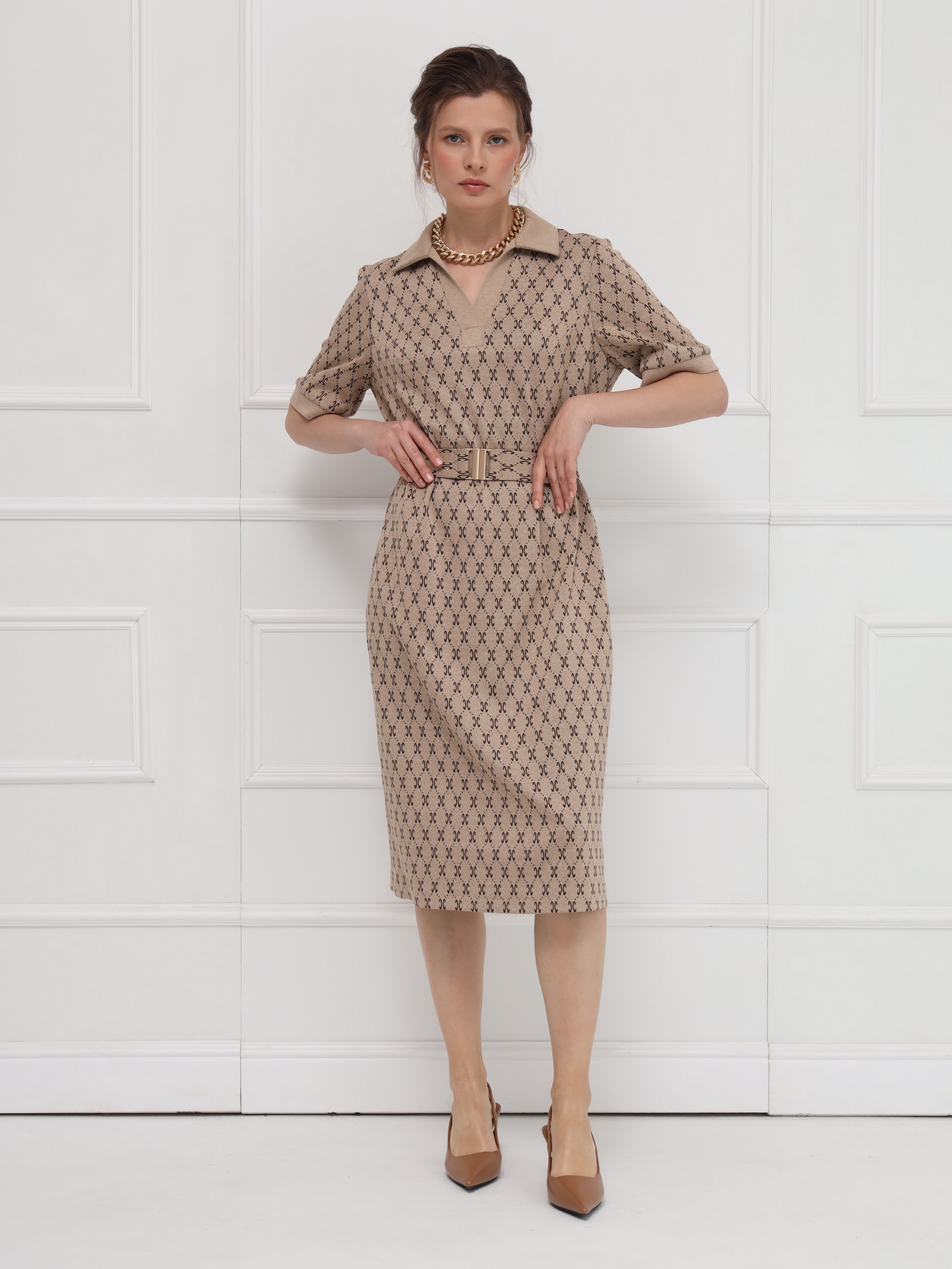 Стильное платье в благородном бежевом оттенке с принтом, напоминающим мотивы люксовых брендов. Прямой силуэт и воротник поло придают образу сдержанную элегантность, а короткие рукава на манжетах добавляют нотку лёгкости. Пояс с пряжкой формирует изящный акцент на фигуре. Идеальное решение для свежих весенних образов.