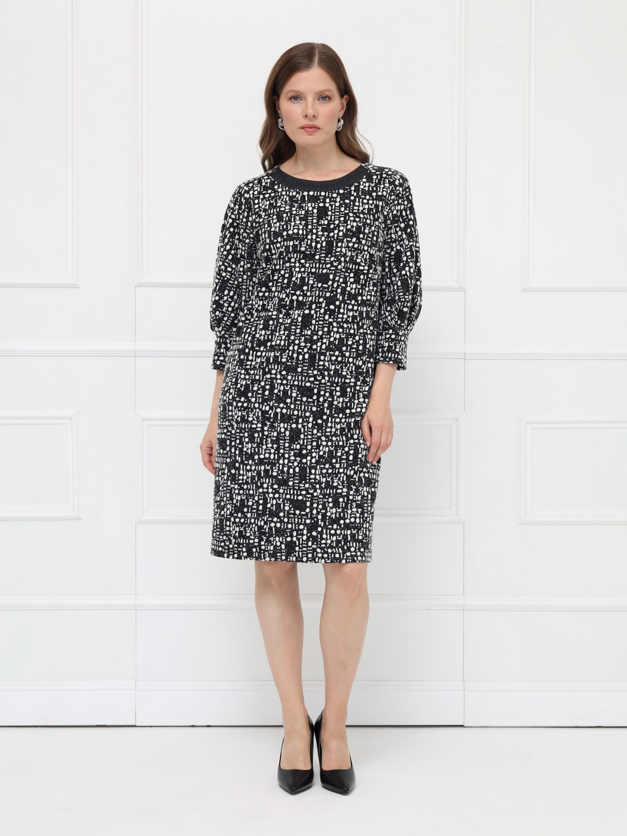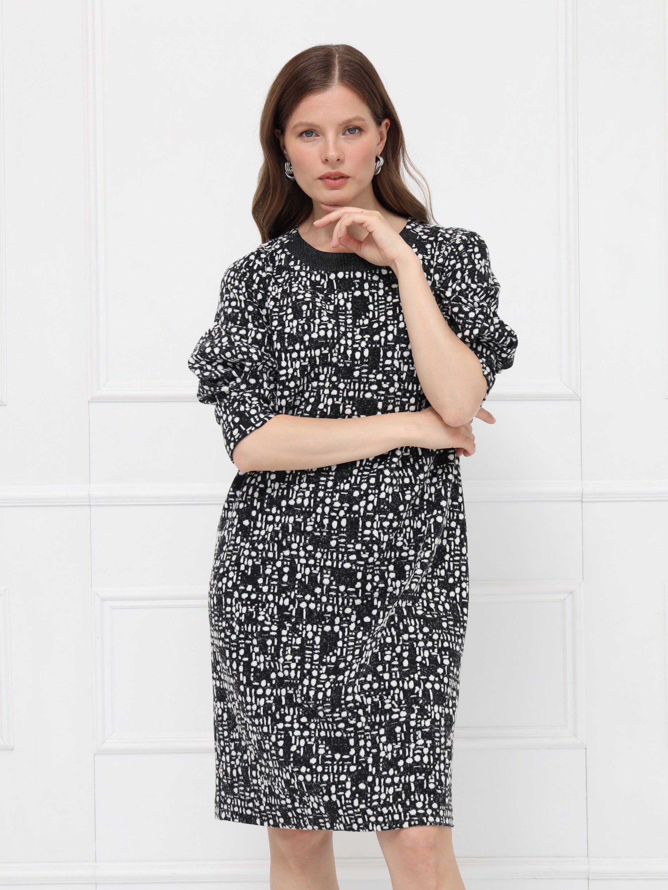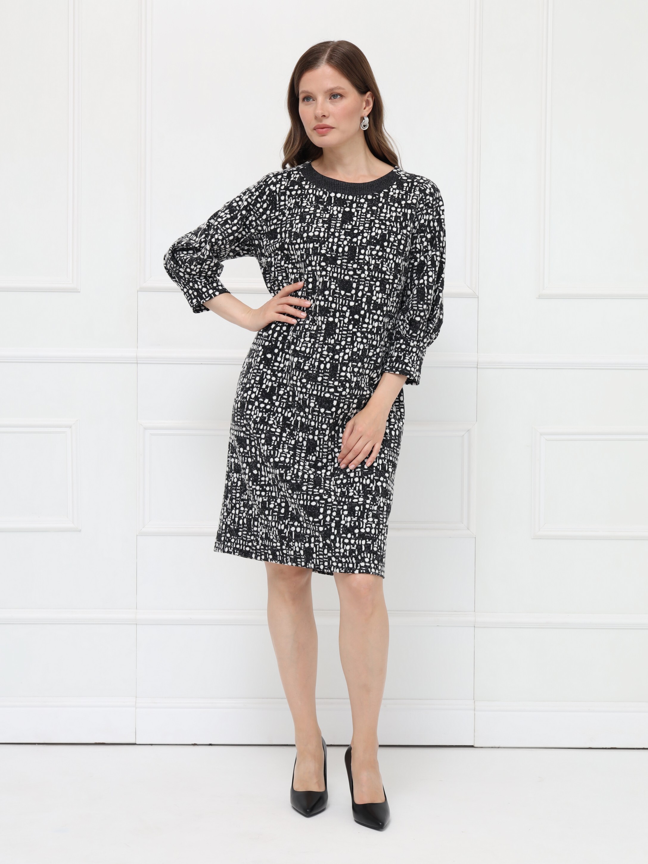 Элегантное платье полуприлегающего силуэта выполнено из мягкого уютного трикотажа в серо-белой гамме. Длина — до середины колена. Дополнено застежкой на молнию и шлицей для удобства при движении. Овальная горловина оформлена однотонной планкой, подчёркивая чистоту линий. Рукава реглан длины 7/8 привлекают внимание оригинальными вставками со складками, создающими необычный силуэт и дополнительный объём.