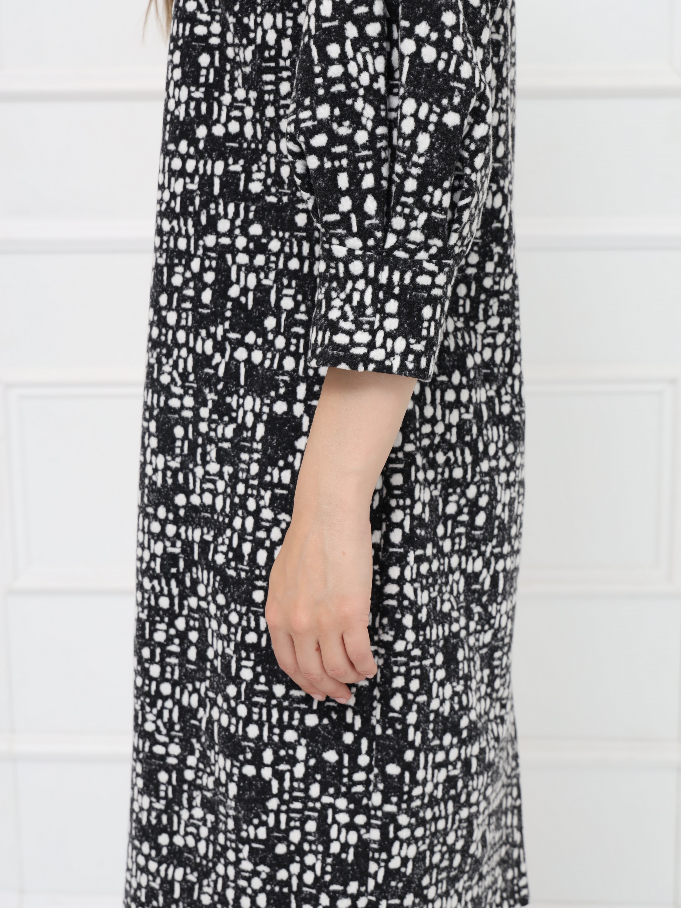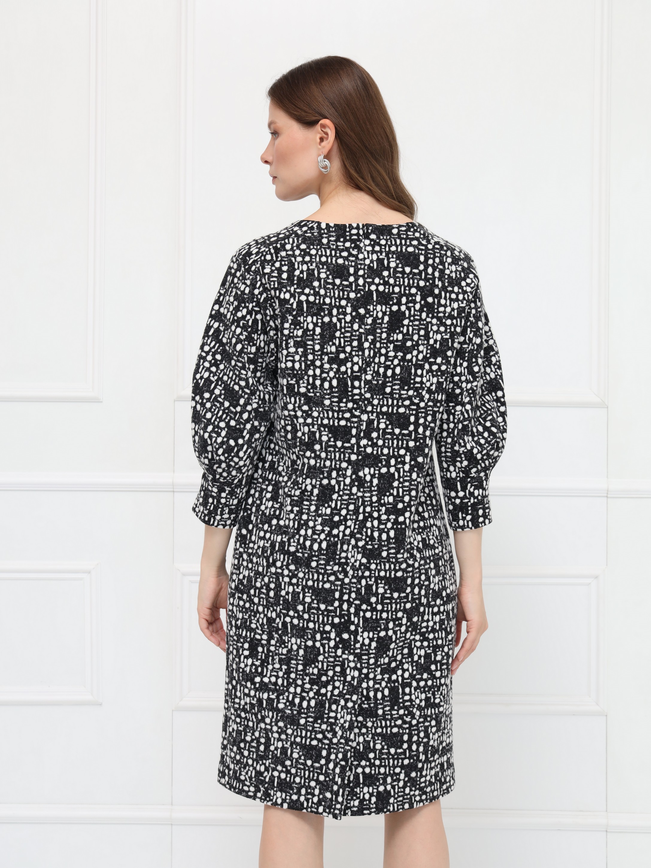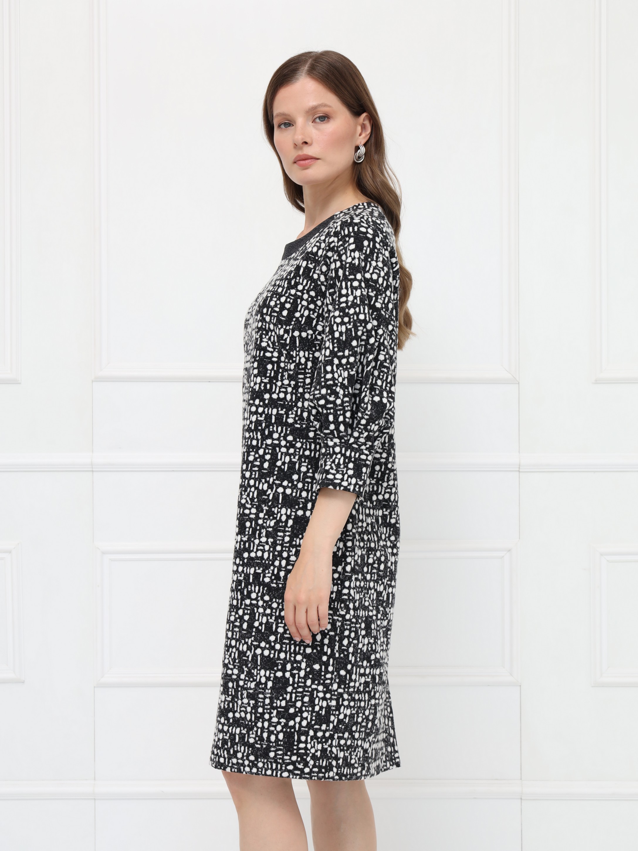 Элегантное платье полуприлегающего силуэта выполнено из мягкого уютного трикотажа в серо-белой гамме. Длина — до середины колена. Дополнено застежкой на молнию и шлицей для удобства при движении. Овальная горловина оформлена однотонной планкой, подчёркивая чистоту линий. Рукава реглан длины 7/8 привлекают внимание оригинальными вставками со складками, создающими необычный силуэт и дополнительный объём.