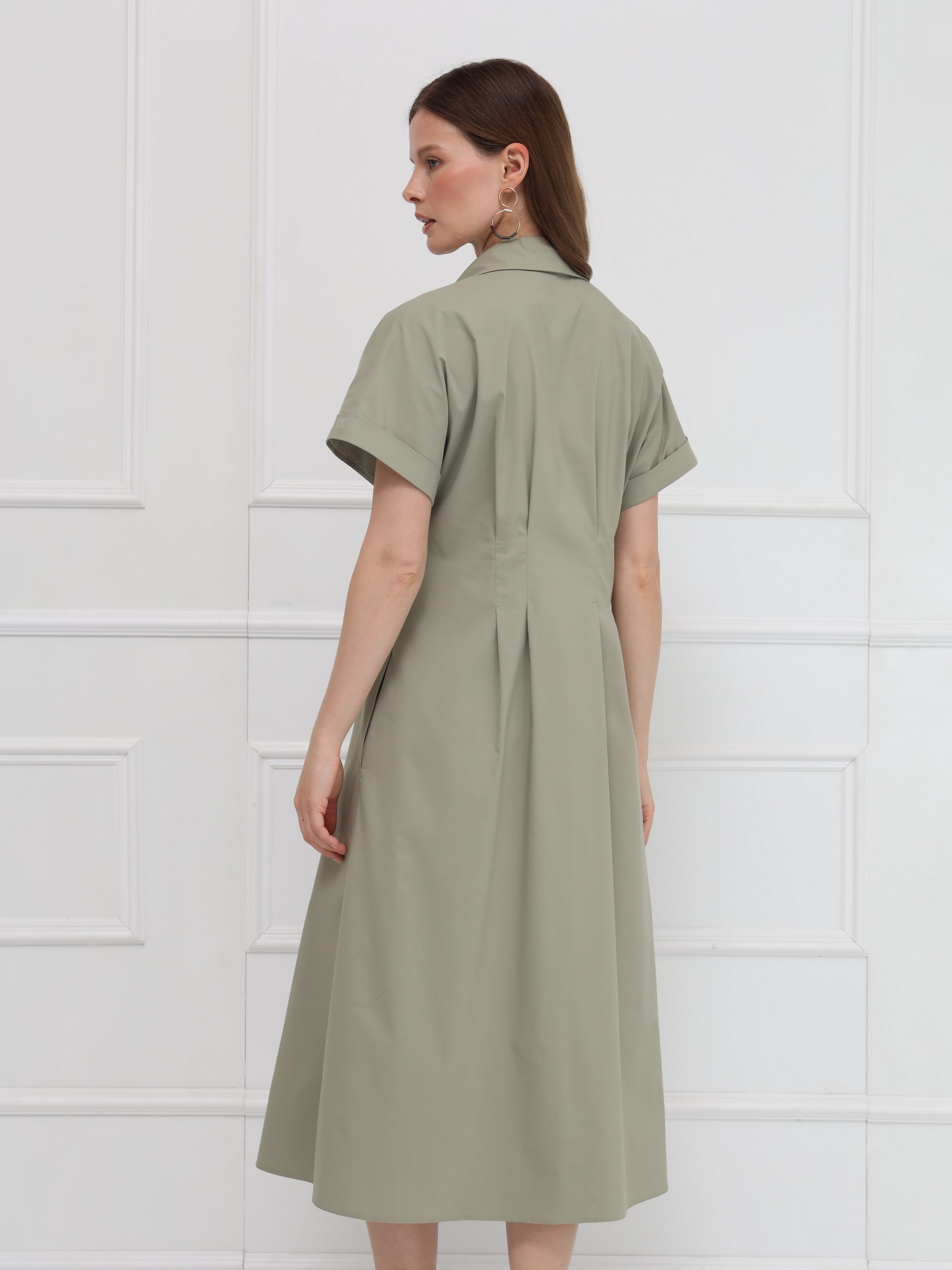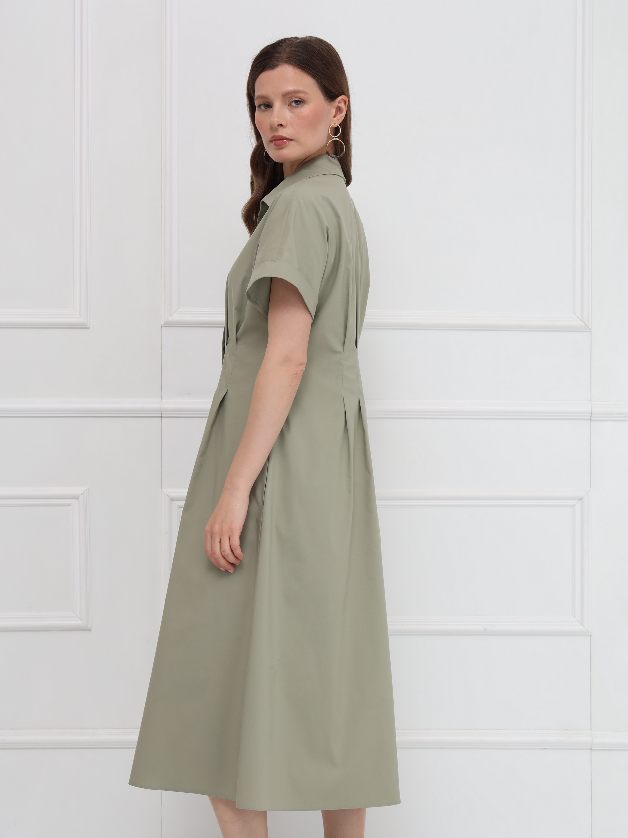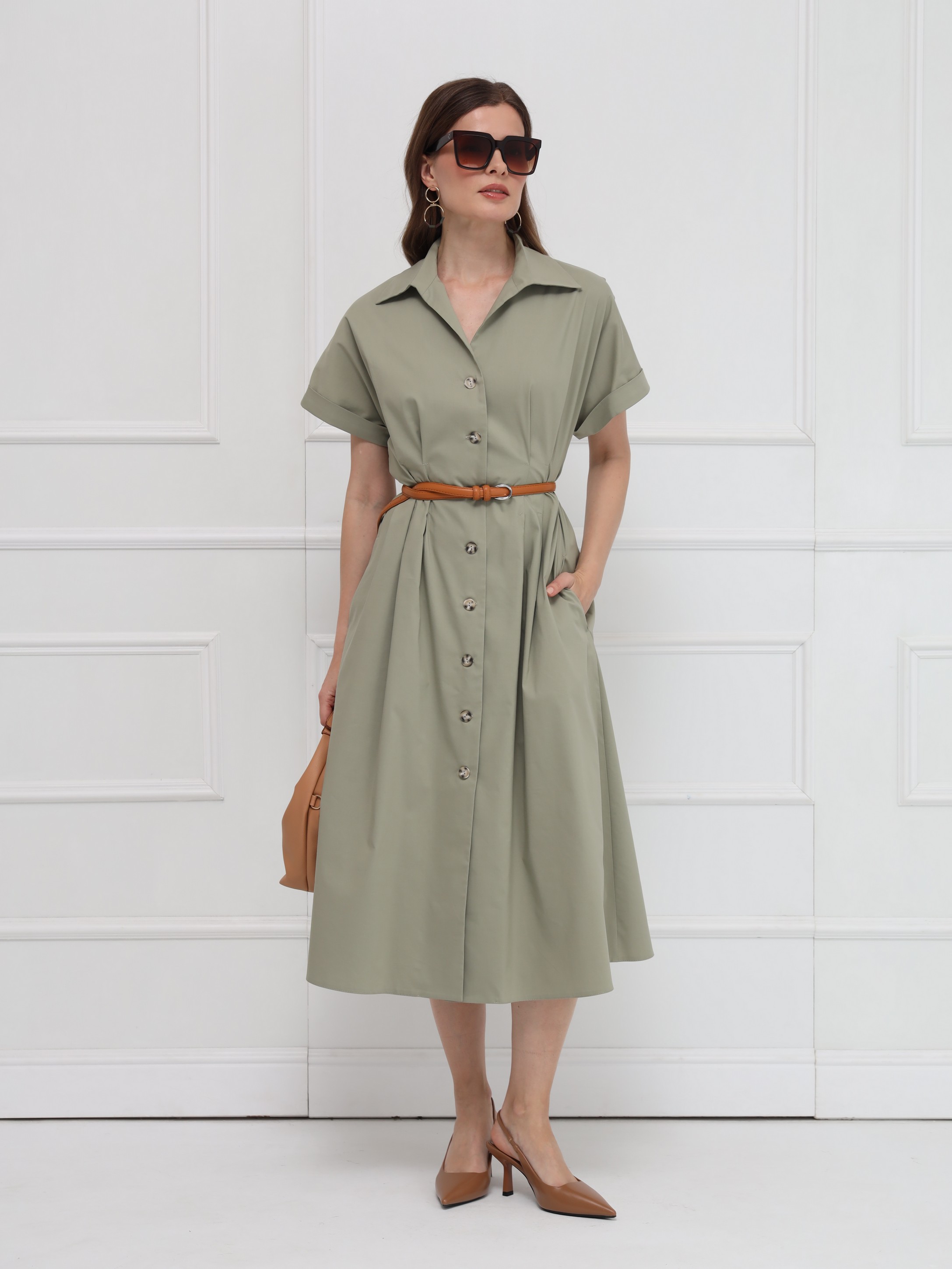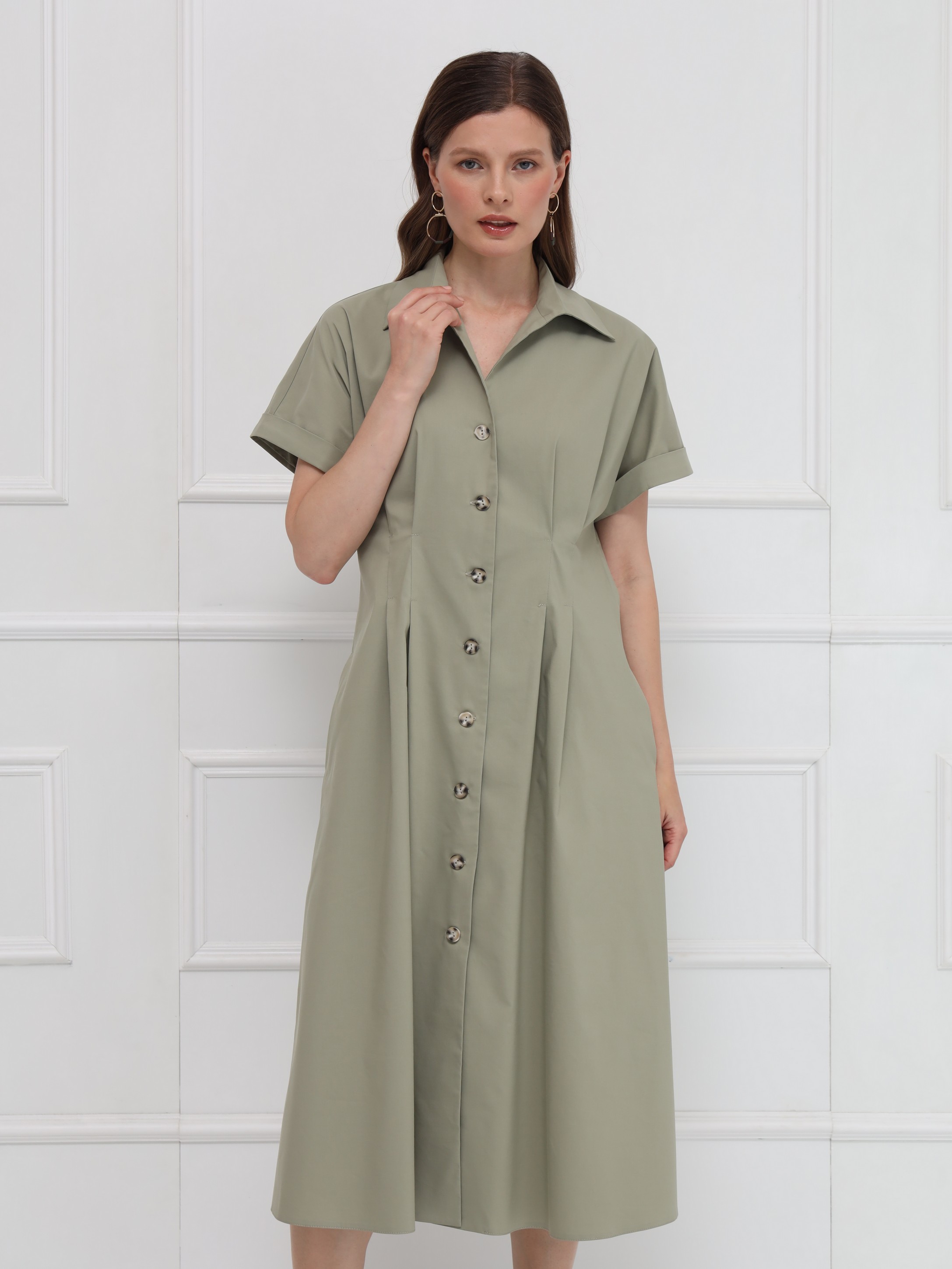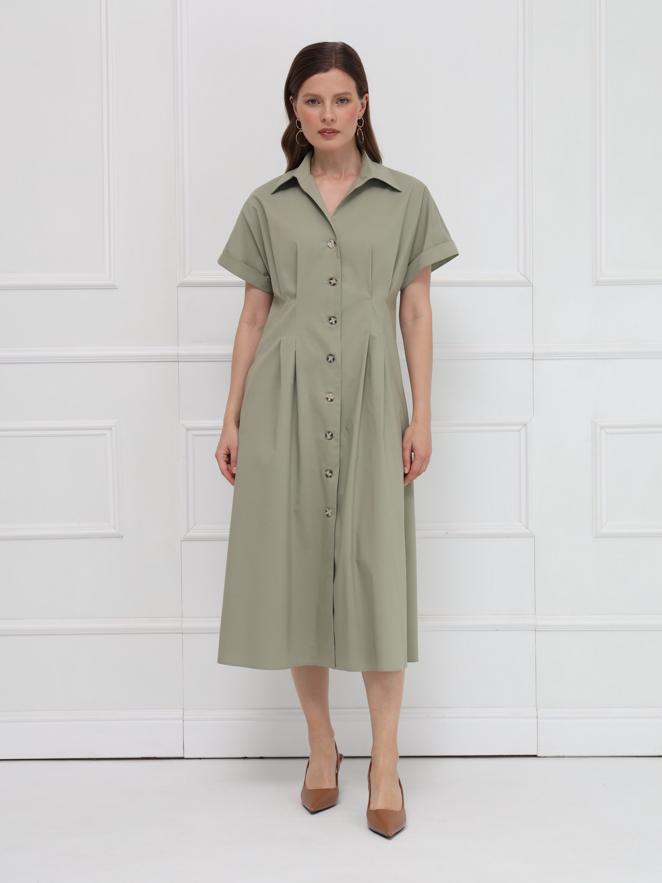 Платье из тонкого хлопка застёгивается на пуговицы от горловины до низа, создавая чистый и вытянутый силуэт. V-образный вырез и воротник на стойке добавляют акцента, а короткие цельнокроеные рукава с аккуратными отворотами придают образу расслабленность. Приталенность формируется застроченными складками, подчёркивая фигуру без лишней жёсткости. Миди-длина делает модель универсальной и элегантной - идеальный вариант для тёплых дней и стильных повседневных образов.