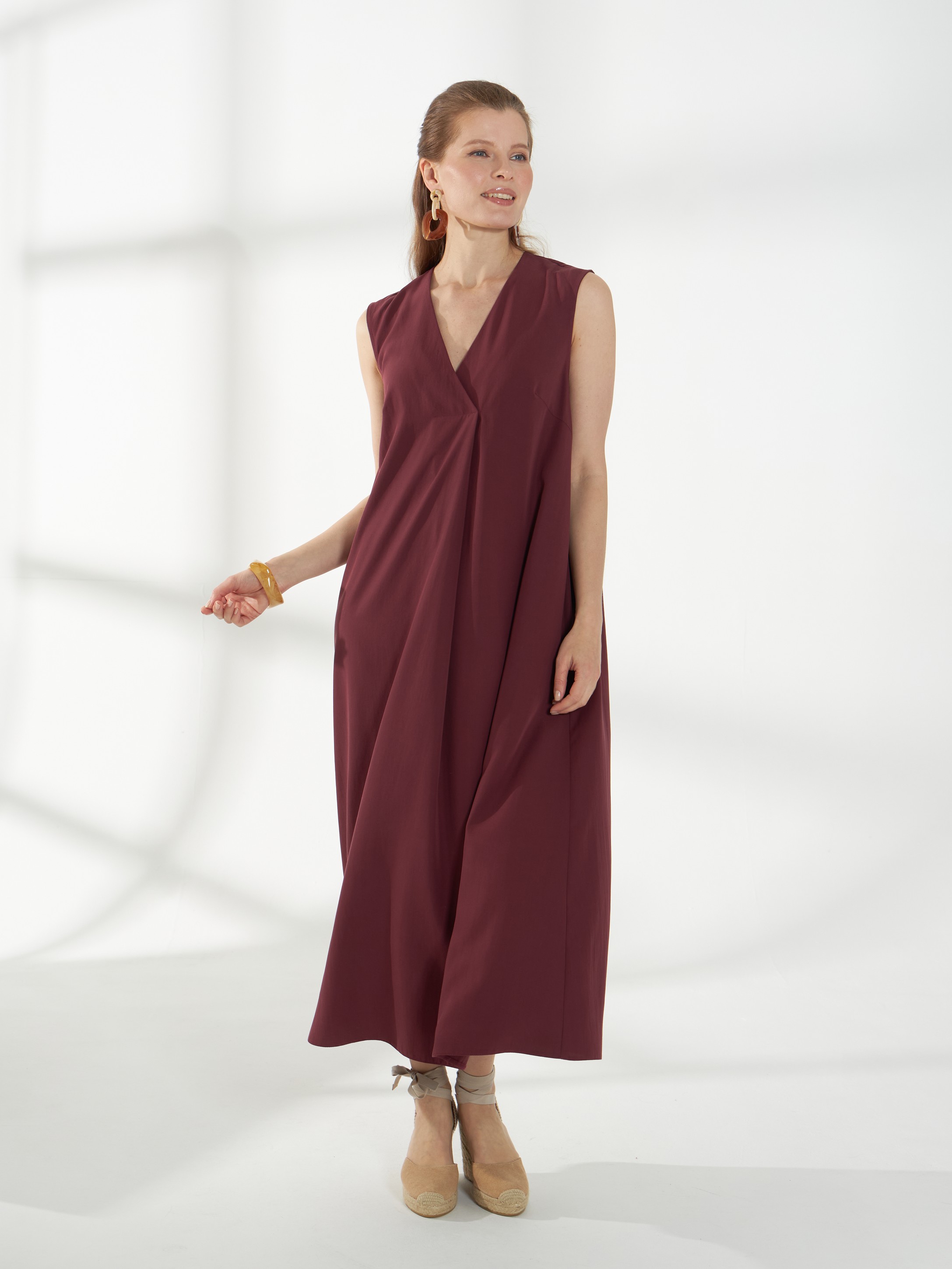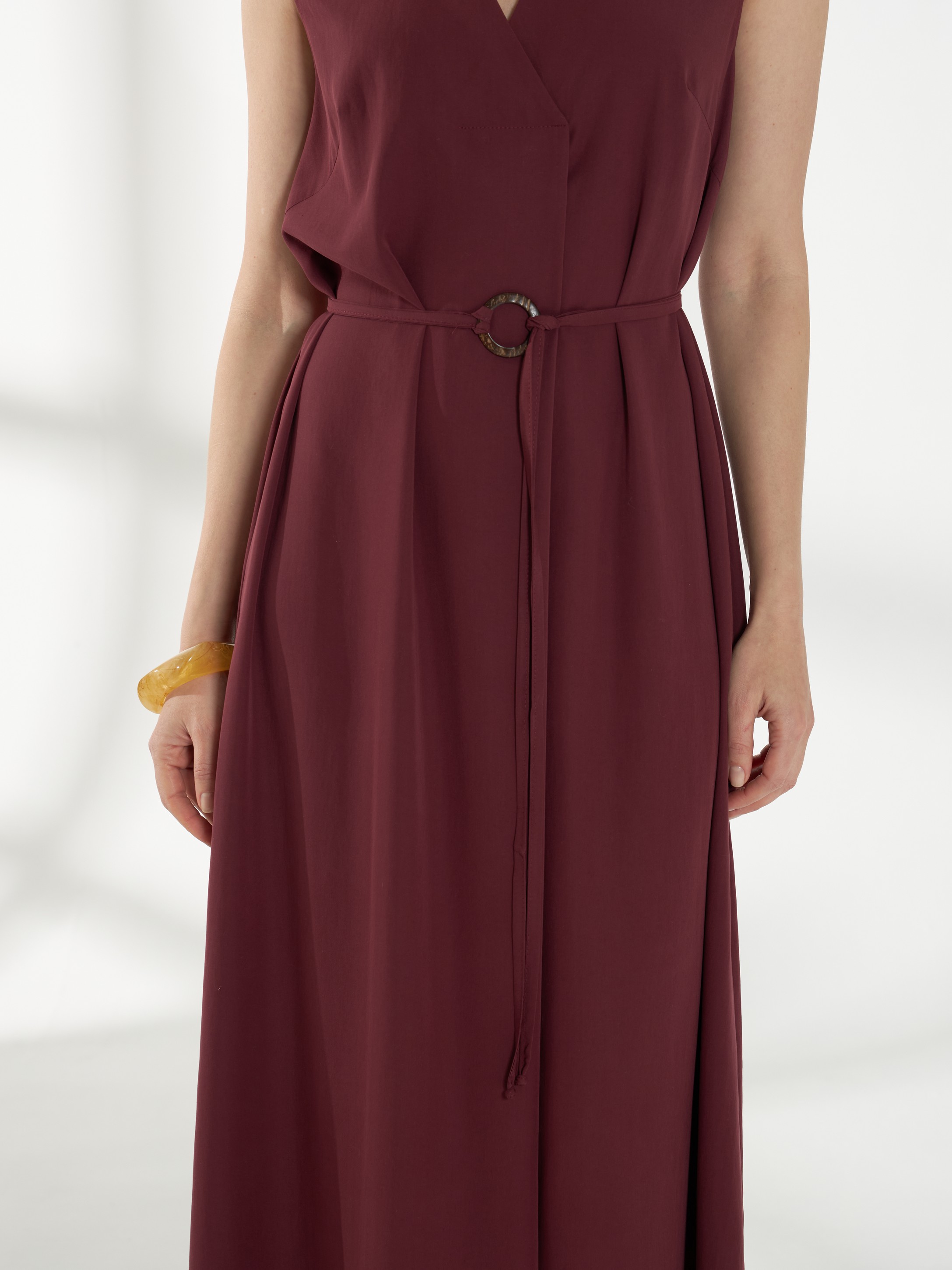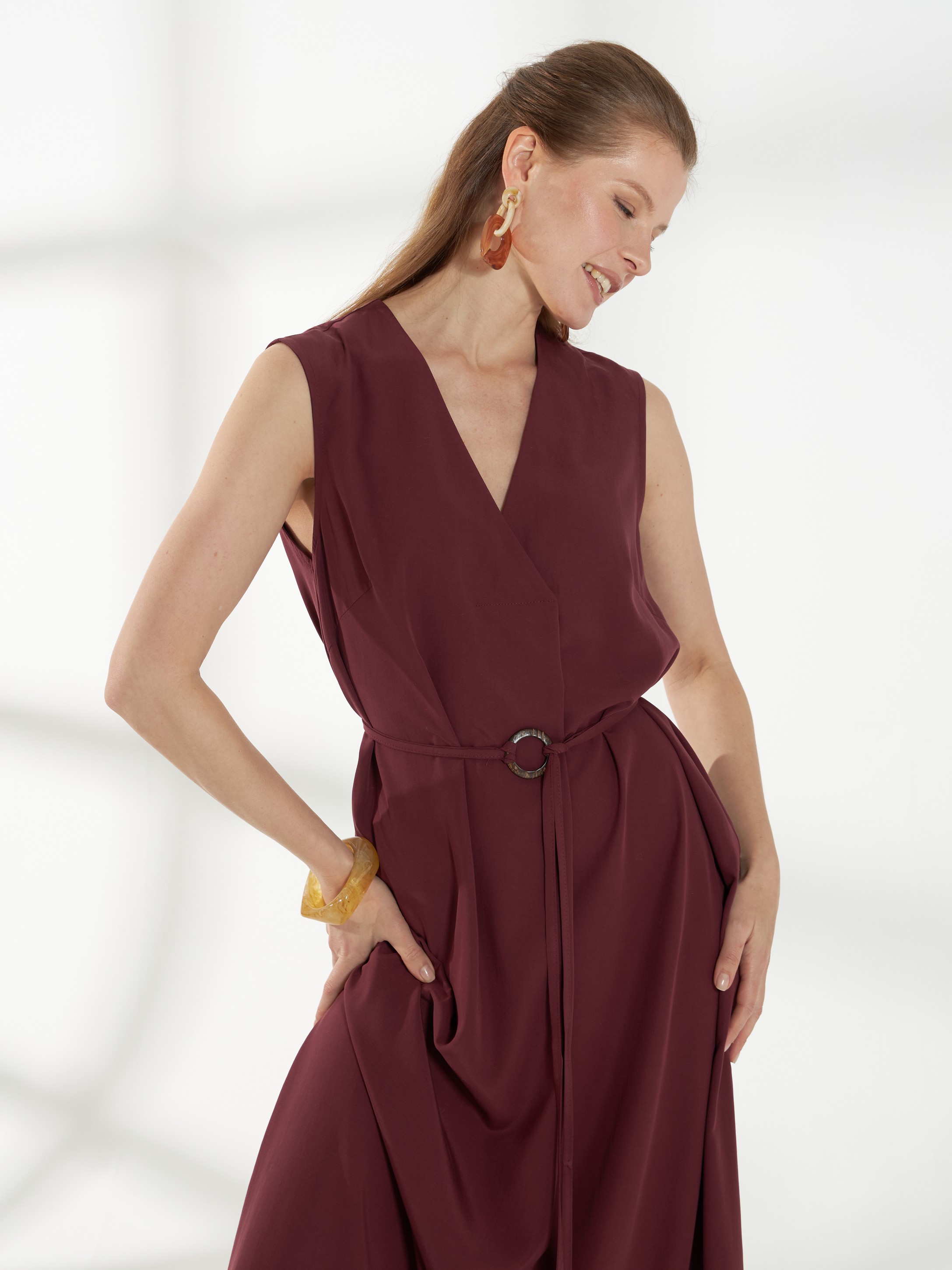 Легкое платье свободного силуэта, без рукавов, с плавным расклешением книзу и широкой складкой, исходящей от нижней точки V-образной горловины. Тонкий пояс-шнурок с пряжкой-кольцом позволяет регулировать посадку по талии, а мягкая шелковистая ткань из вискозного тенселя свободно струится и дышит. Платье выполнено в ягодном оттенке, который придаёт образу тепло и глубину.