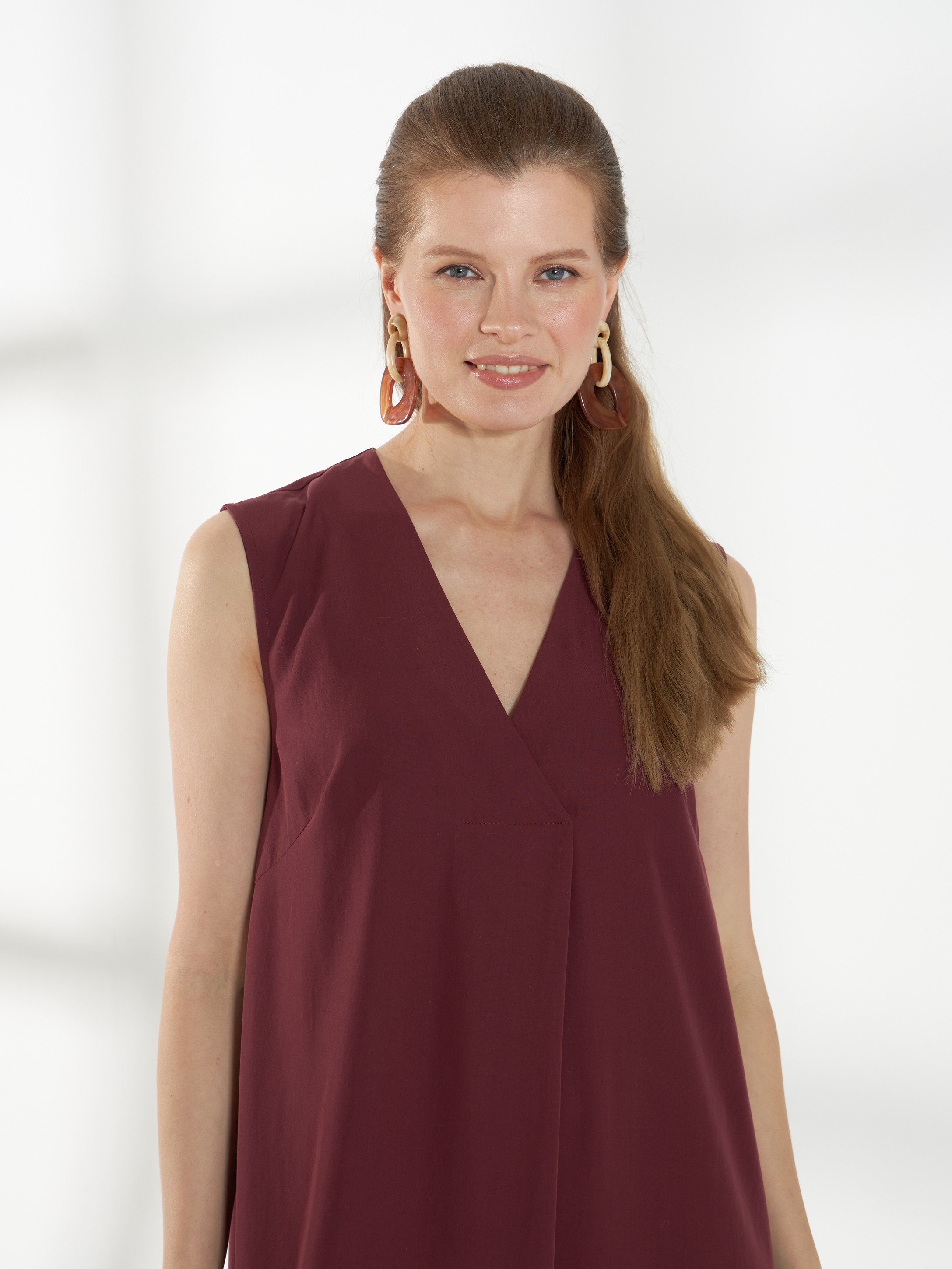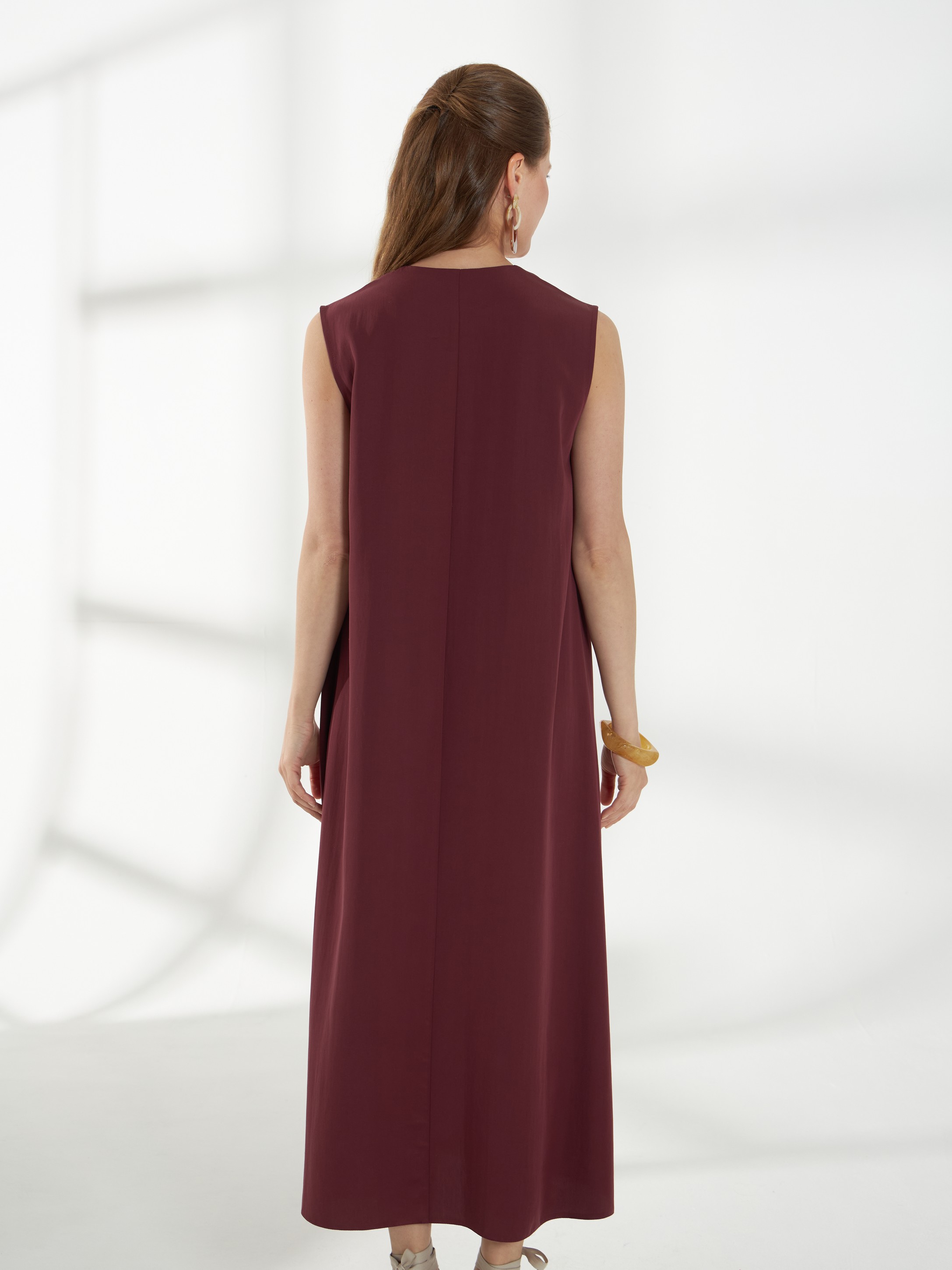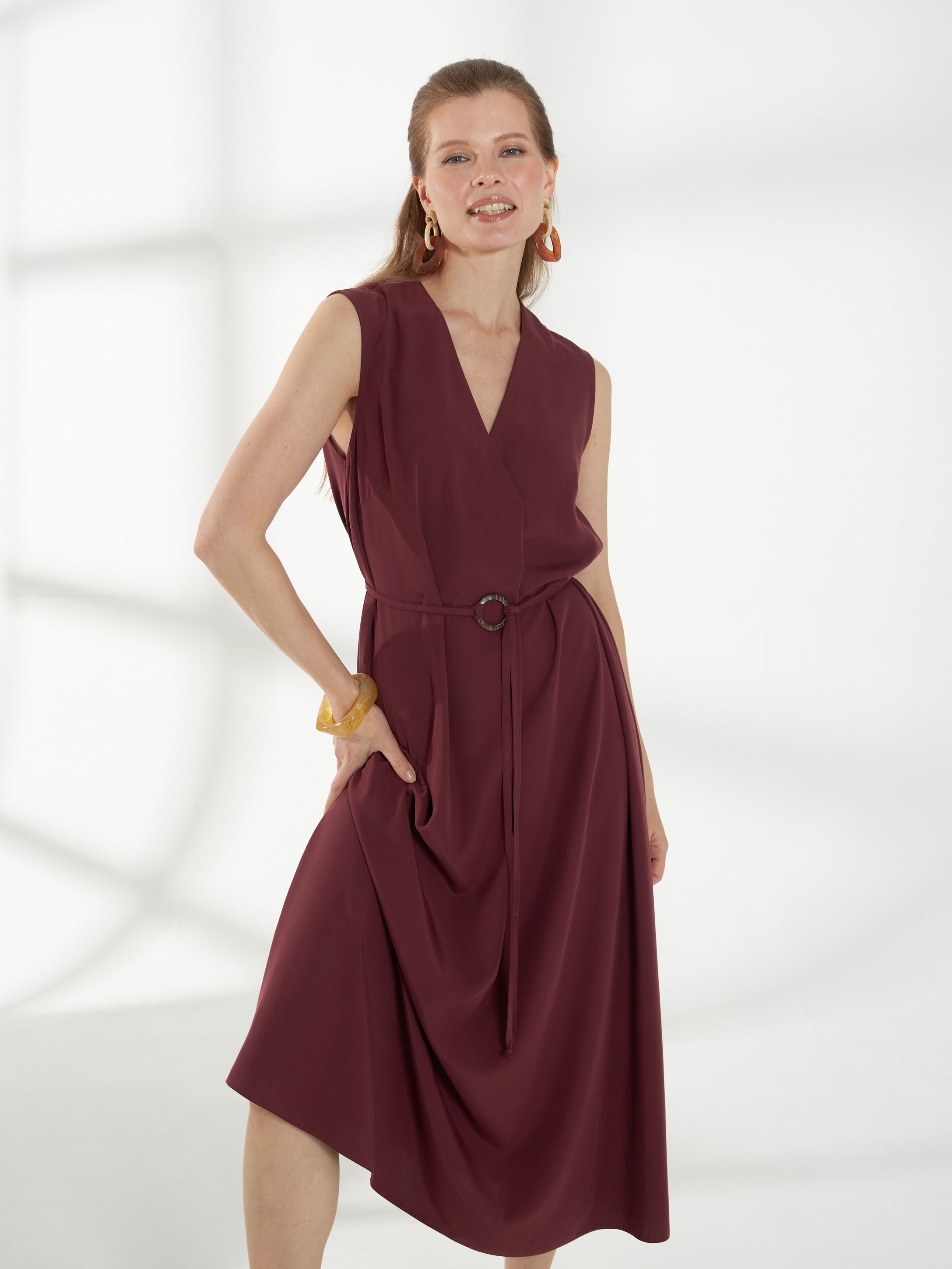 Легкое платье свободного силуэта, без рукавов, с плавным расклешением книзу и широкой складкой, исходящей от нижней точки V-образной горловины. Тонкий пояс-шнурок с пряжкой-кольцом позволяет регулировать посадку по талии, а мягкая шелковистая ткань из вискозного тенселя свободно струится и дышит. Платье выполнено в ягодном оттенке, который придаёт образу тепло и глубину.