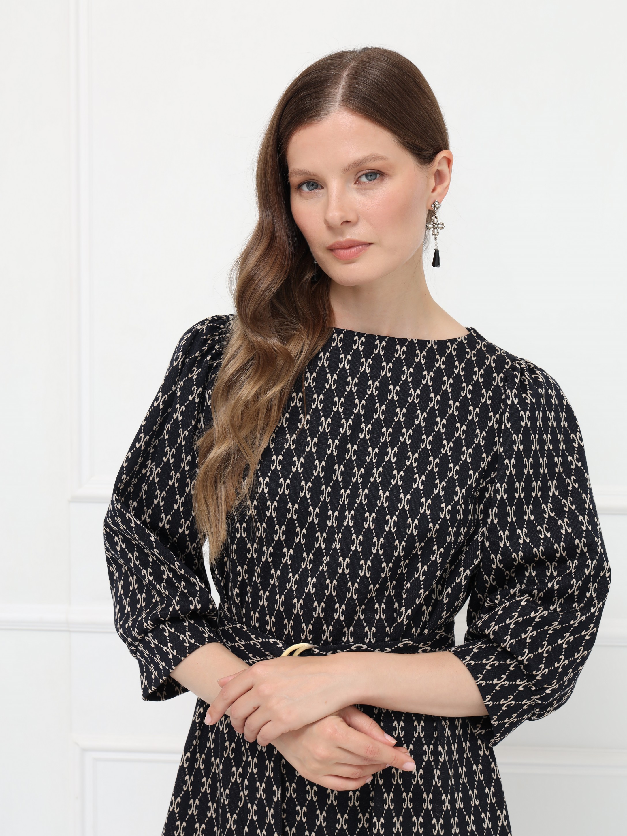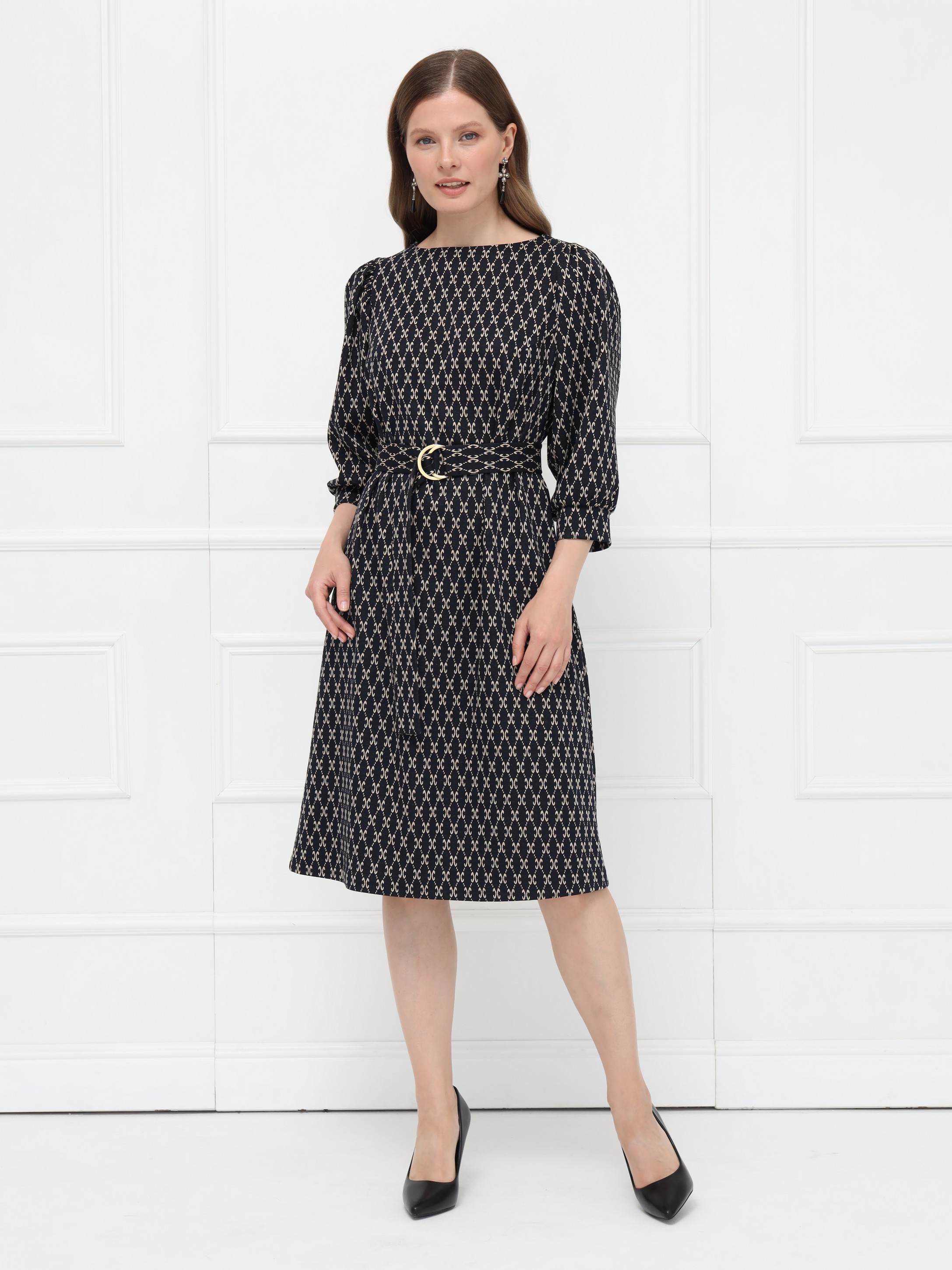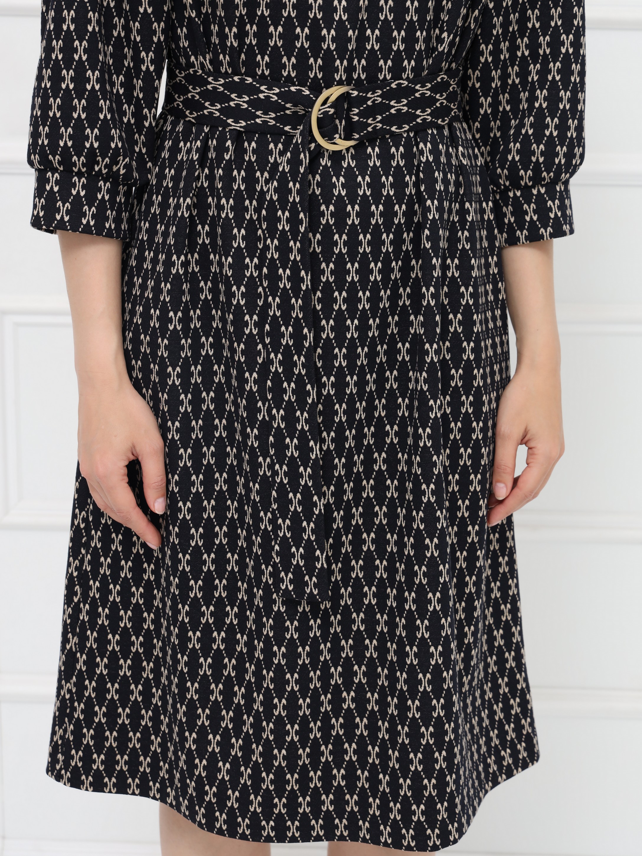 Платье А-силуэта станет универсальной основой вашего гардероба. Свободный крой и длина до середины колена создают комфорт и свободу движений, а пояс с бронзовой пряжкой деликатно подчёркивает талию. Лаконичная горловина, с застёжкой на пуговицу на спинке, и объёмные рукава на манжетах придают образу утончённость. Мягкий трикотаж приятен к телу и красиво драпируется, а авторский принт на тёмно-синем фоне добавляет изделию королевский шарм. Идеально подойдёт как для повседневных дел, так и для особых случаев.