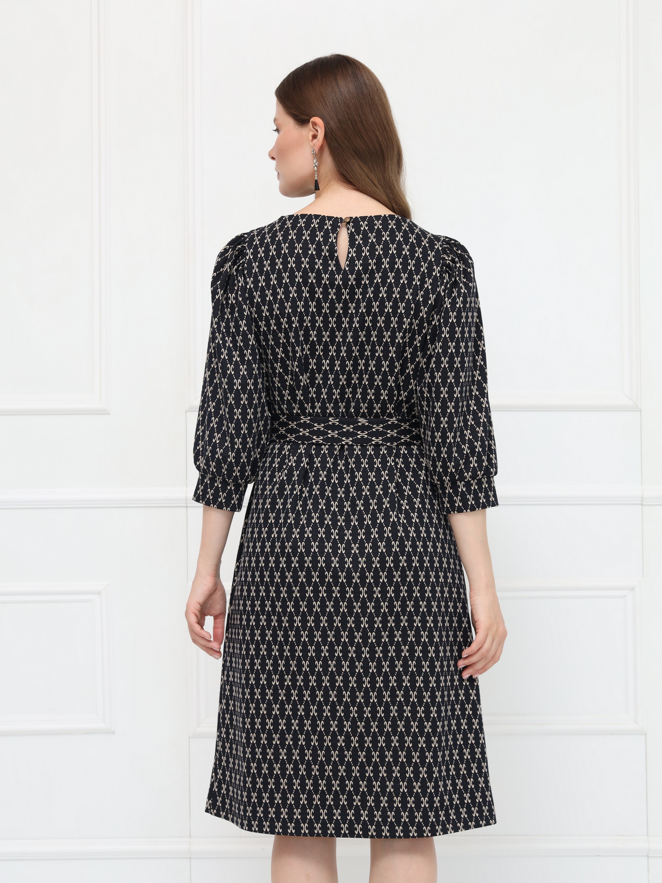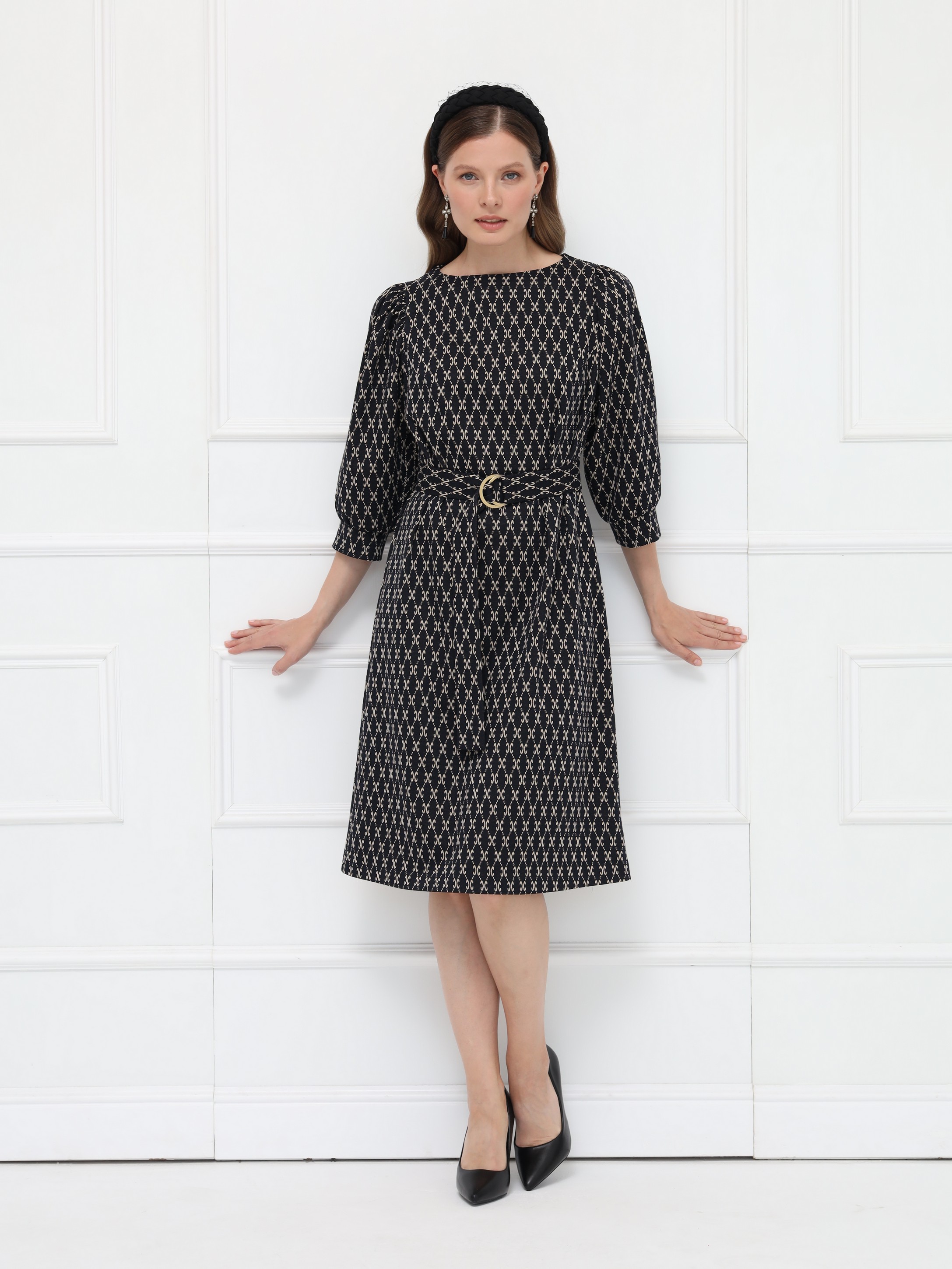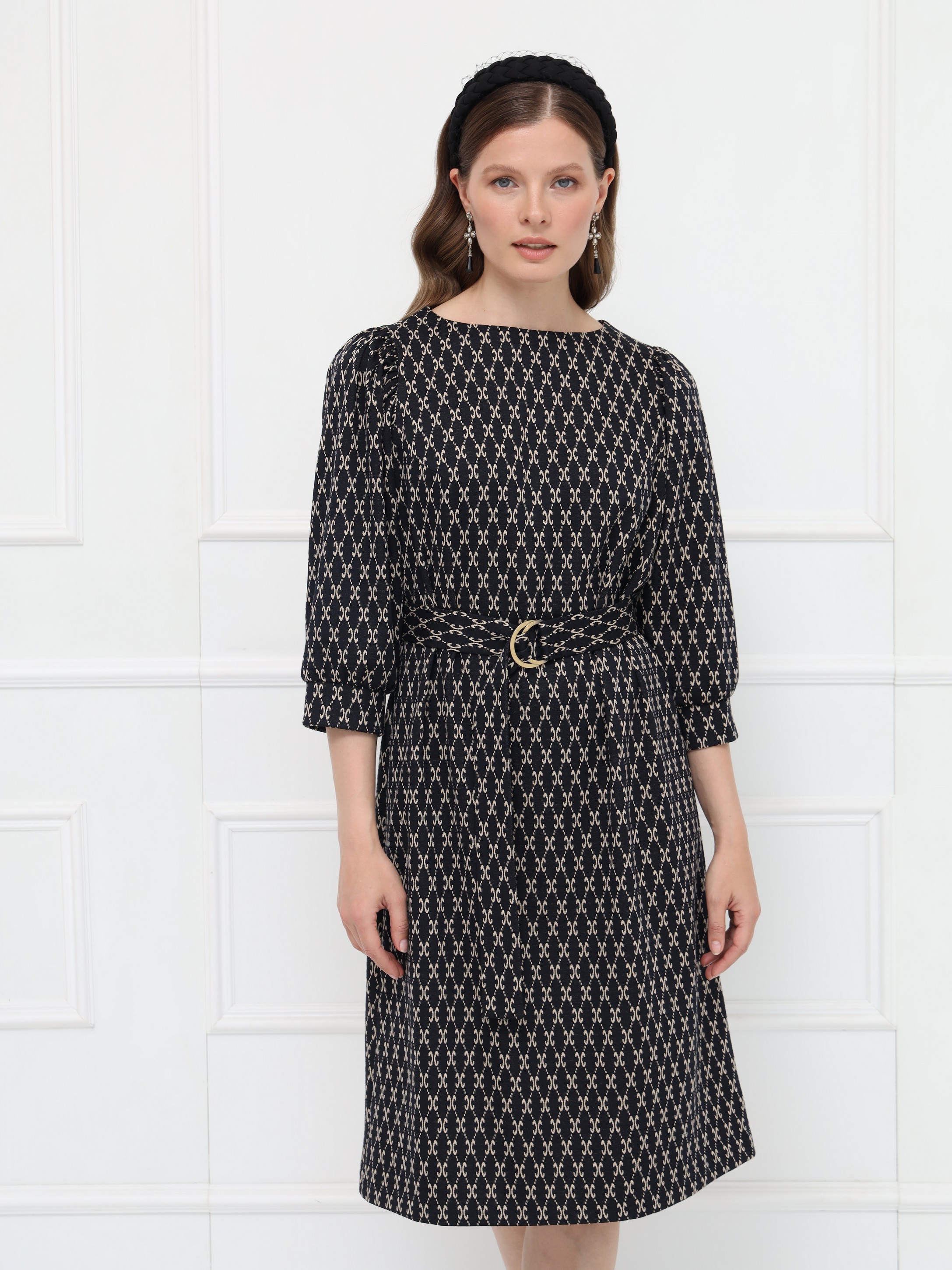 Платье А-силуэта станет универсальной основой вашего гардероба. Свободный крой и длина до середины колена создают комфорт и свободу движений, а пояс с бронзовой пряжкой деликатно подчёркивает талию. Лаконичная горловина, с застёжкой на пуговицу на спинке, и объёмные рукава на манжетах придают образу утончённость. Мягкий трикотаж приятен к телу и красиво драпируется, а авторский принт на тёмно-синем фоне добавляет изделию королевский шарм. Идеально подойдёт как для повседневных дел, так и для особых случаев.