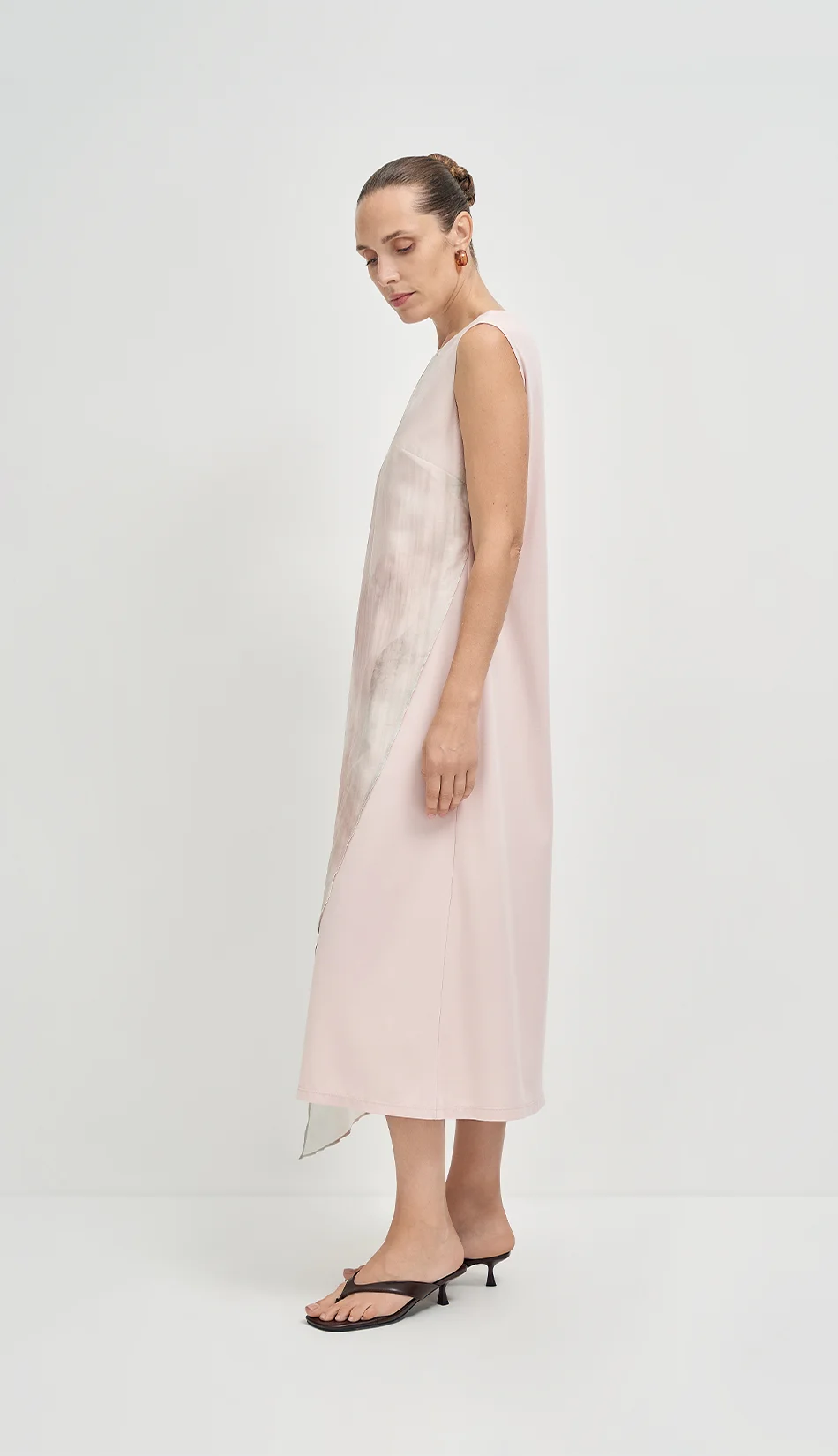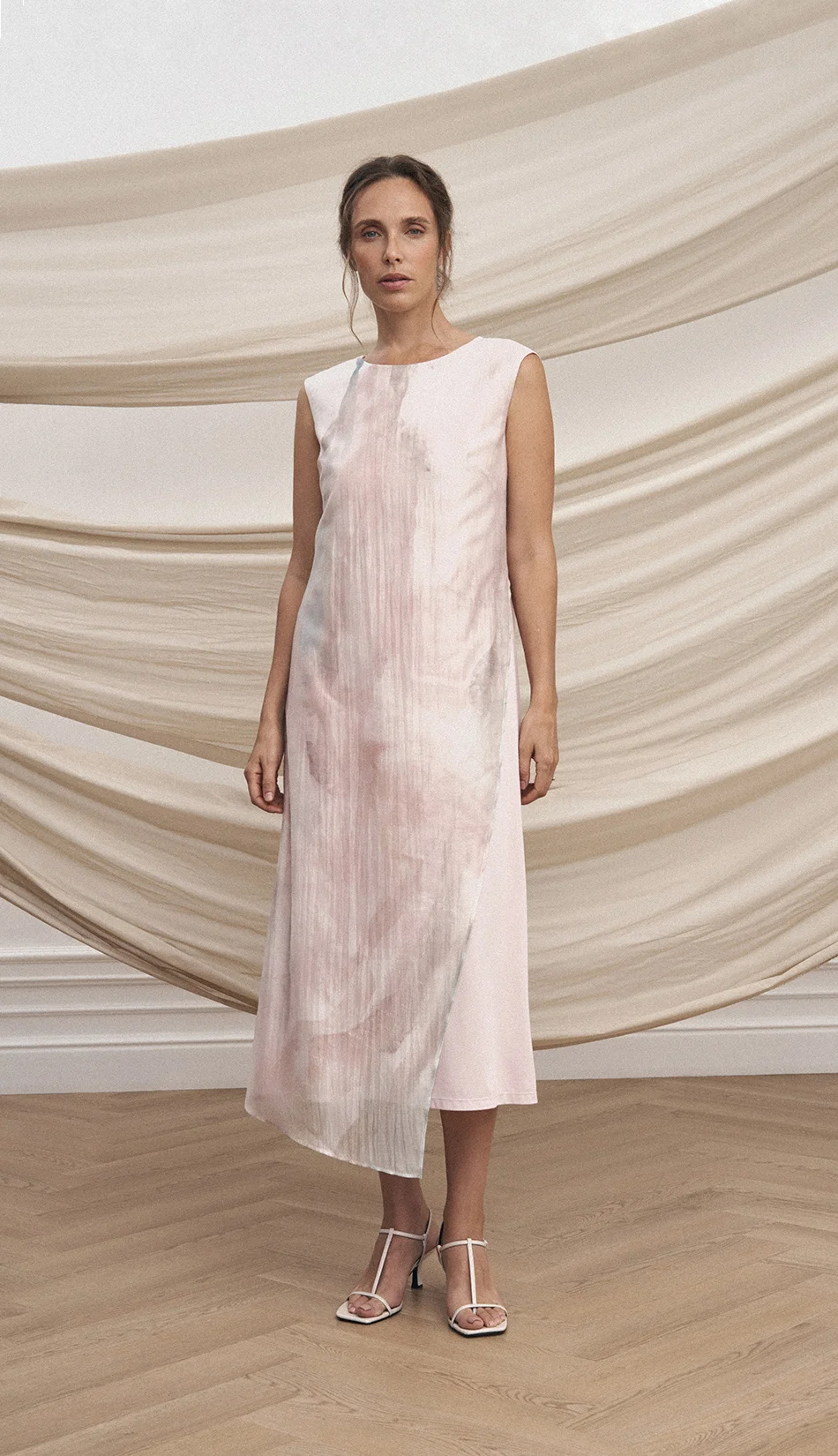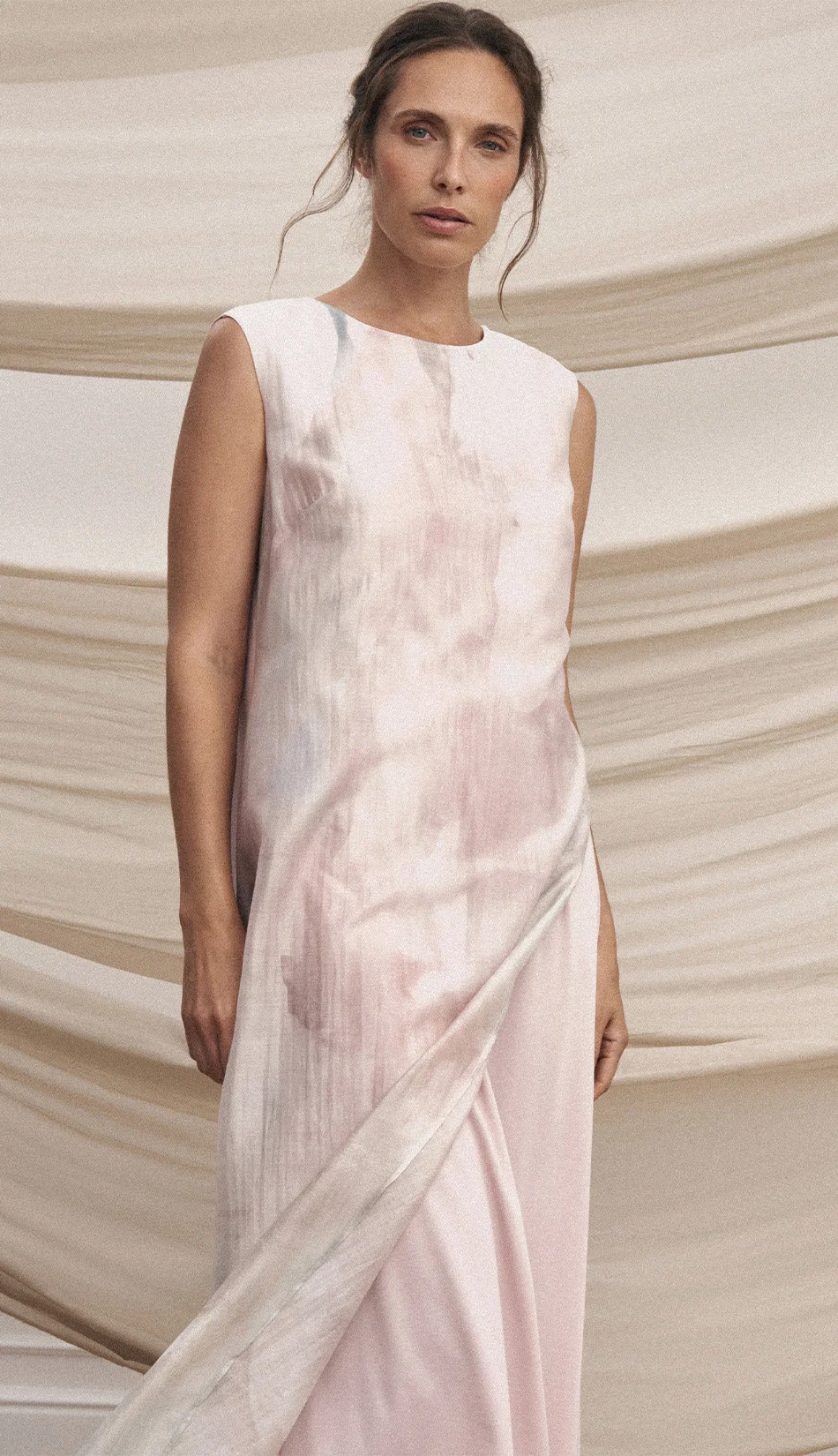 Лаконичное платье А-образного силуэта 'сахарная фреска'.Основная ткань - мягкая пластичная вискоза, идеальная для летнего сезона. Отлетная деталь - из тонкого полупрозрачного батиста с акварельным принтом, разработанным художником бренда.