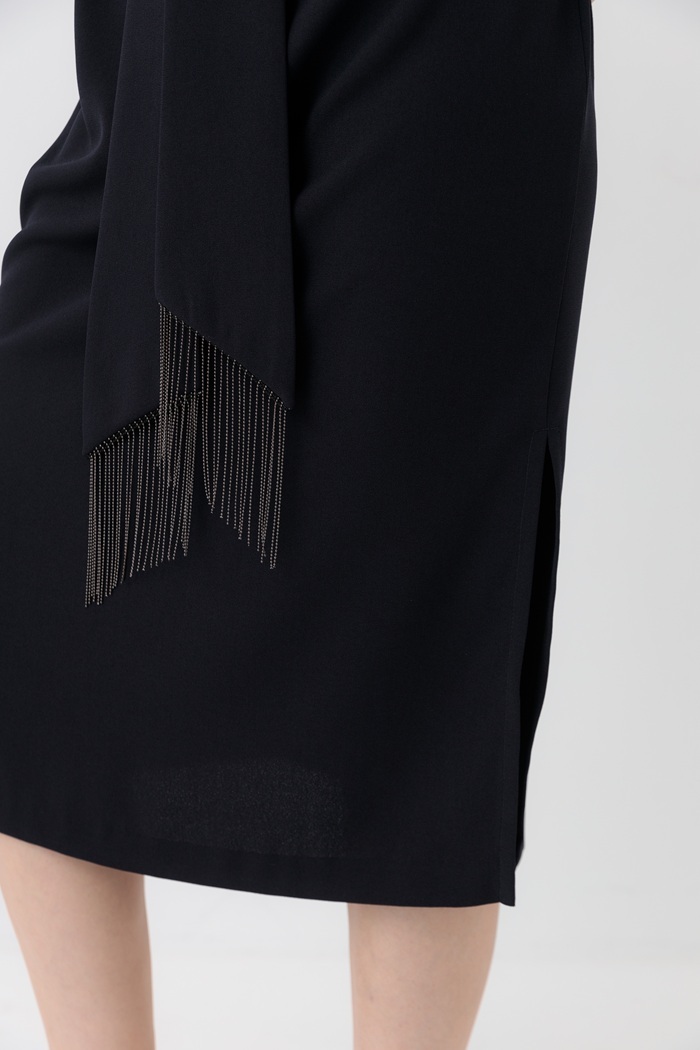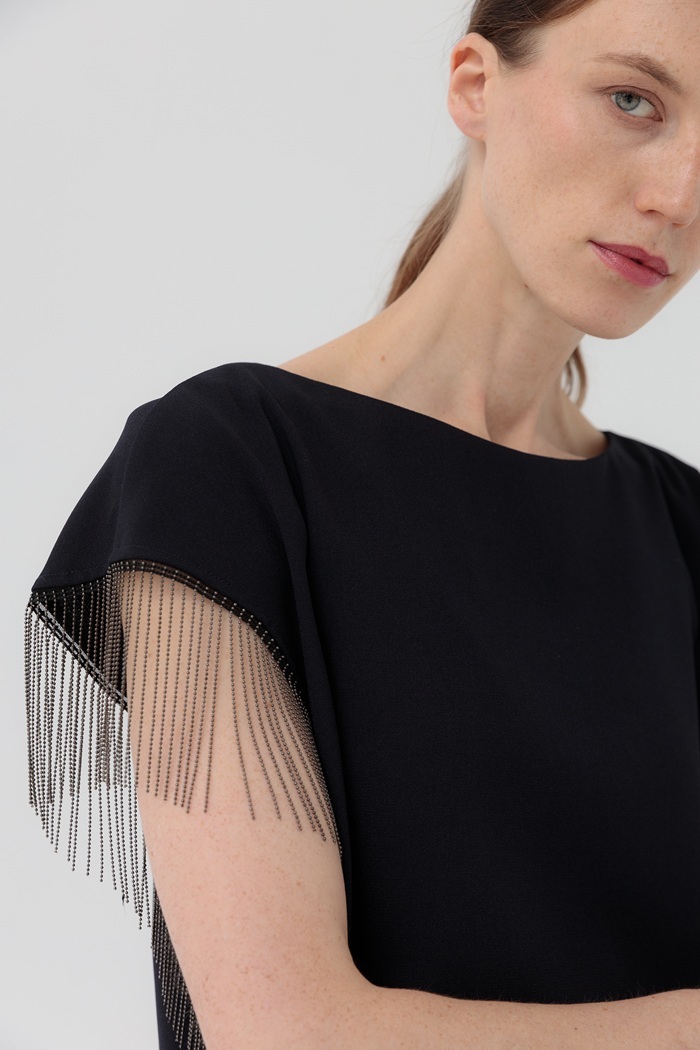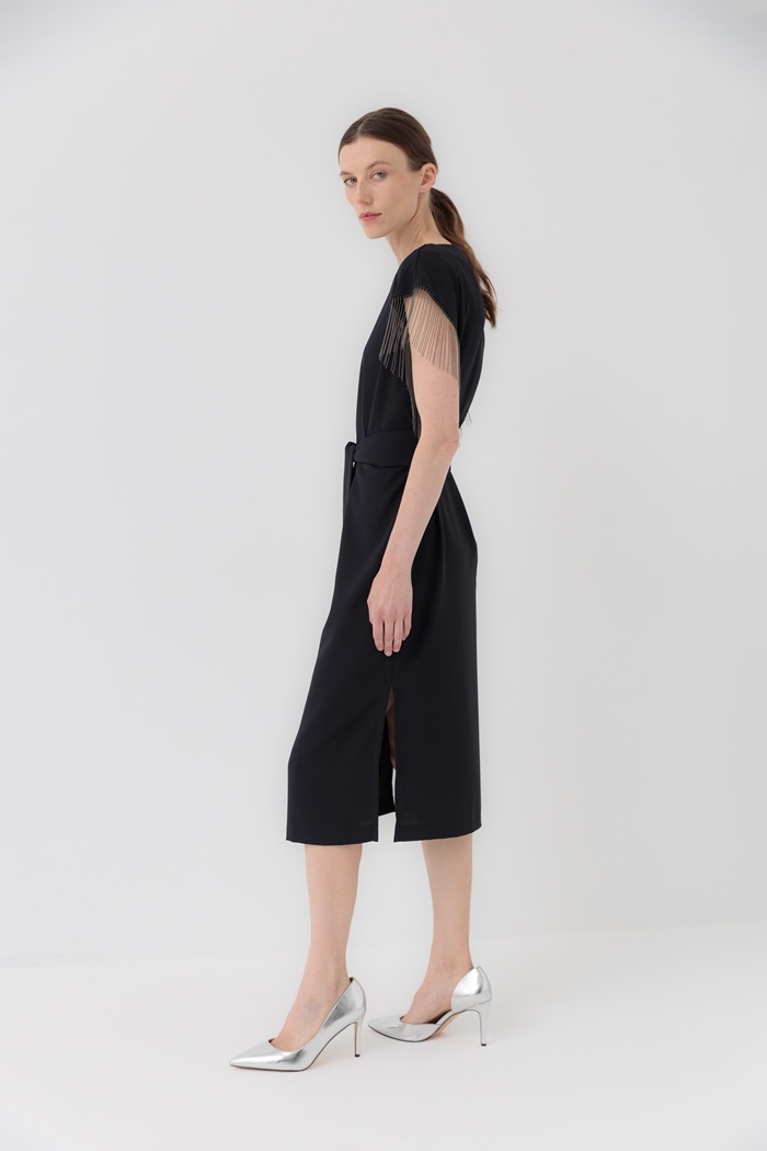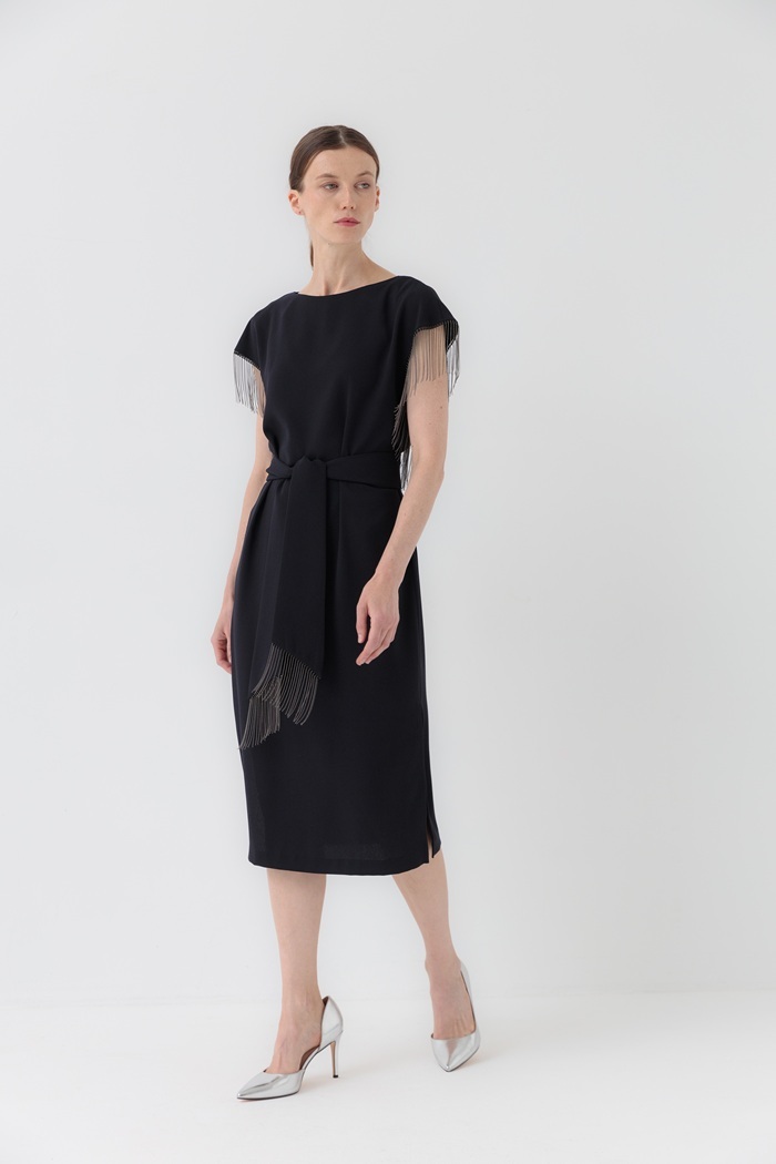 Нарядное платье темно-синего цвета из крепа прямого силуэта с боковыми разрезами и короткими рукавами. По рукавам отделано бахромой из металлических бусин. Можно носить как с поясом, так и без него.