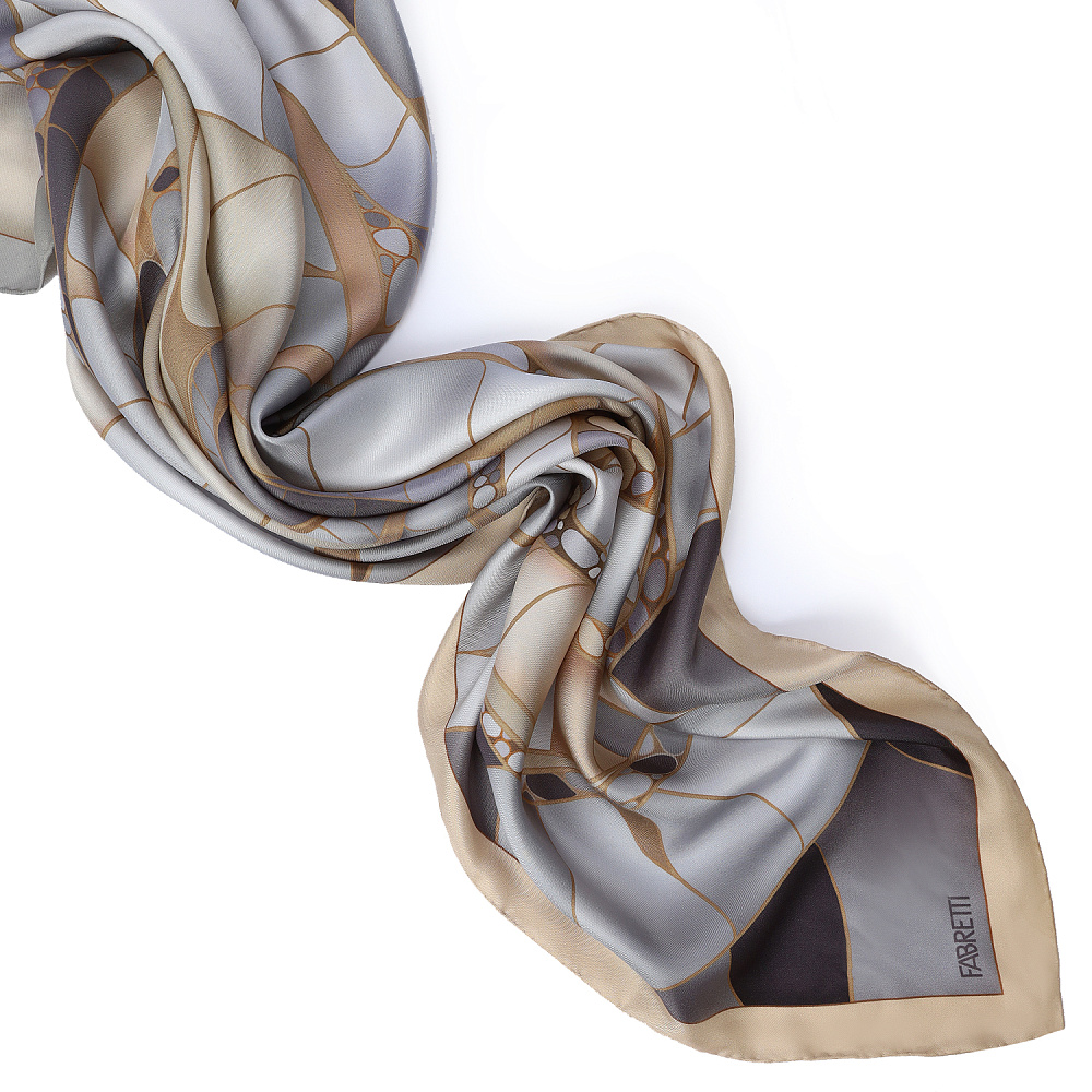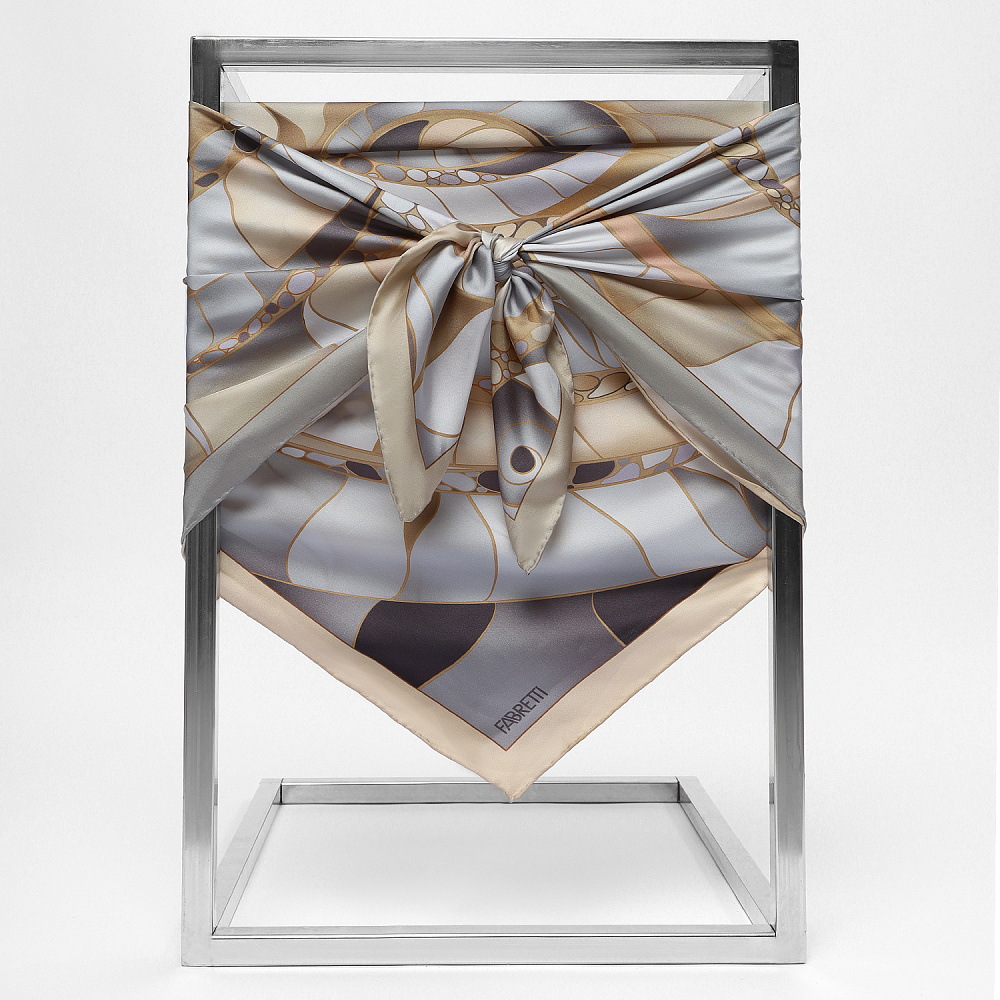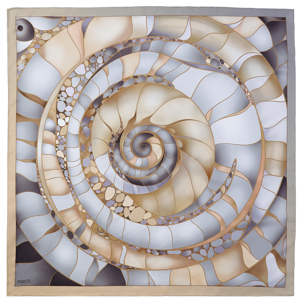 Великолепный женский платок итальянского бренда FABRETTI из натурального шелка со сложным геометрическим узором, образующим спираль или ракушку. Платок смотрится эффектно и элегантно благодаря плавным линиям и градиентным переходам оттенков голубой и бежевой гаммы.Этот романтичный аксессуар будет прекрасно смотреться с повседневным гардеробом, с одеждой из замши и натуральных тканей. У платка ручная подшивка краев.Шелковый платок сохраняет актуальность вне модных тенденций — это классика, которая не выходит из моды, изысканный подарок, подчеркивающий особое отношение.Размер 90*90 см.