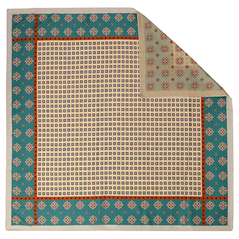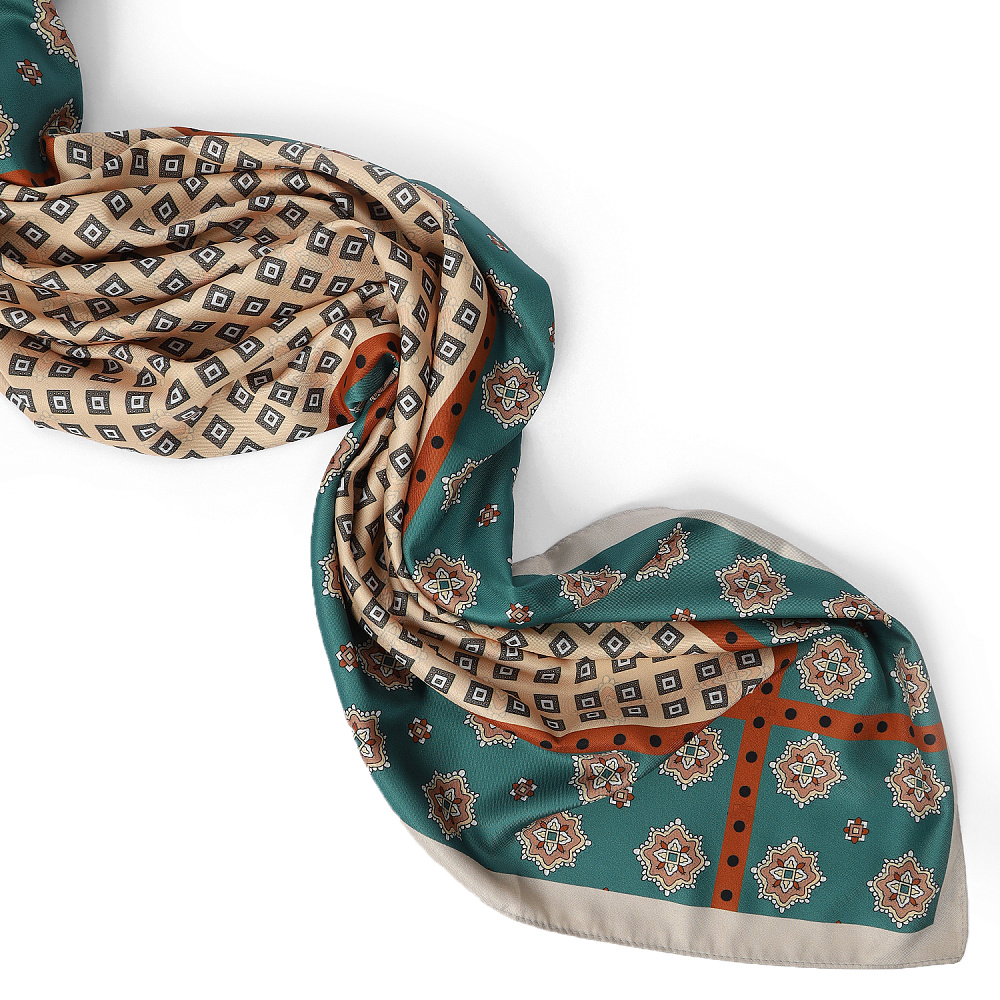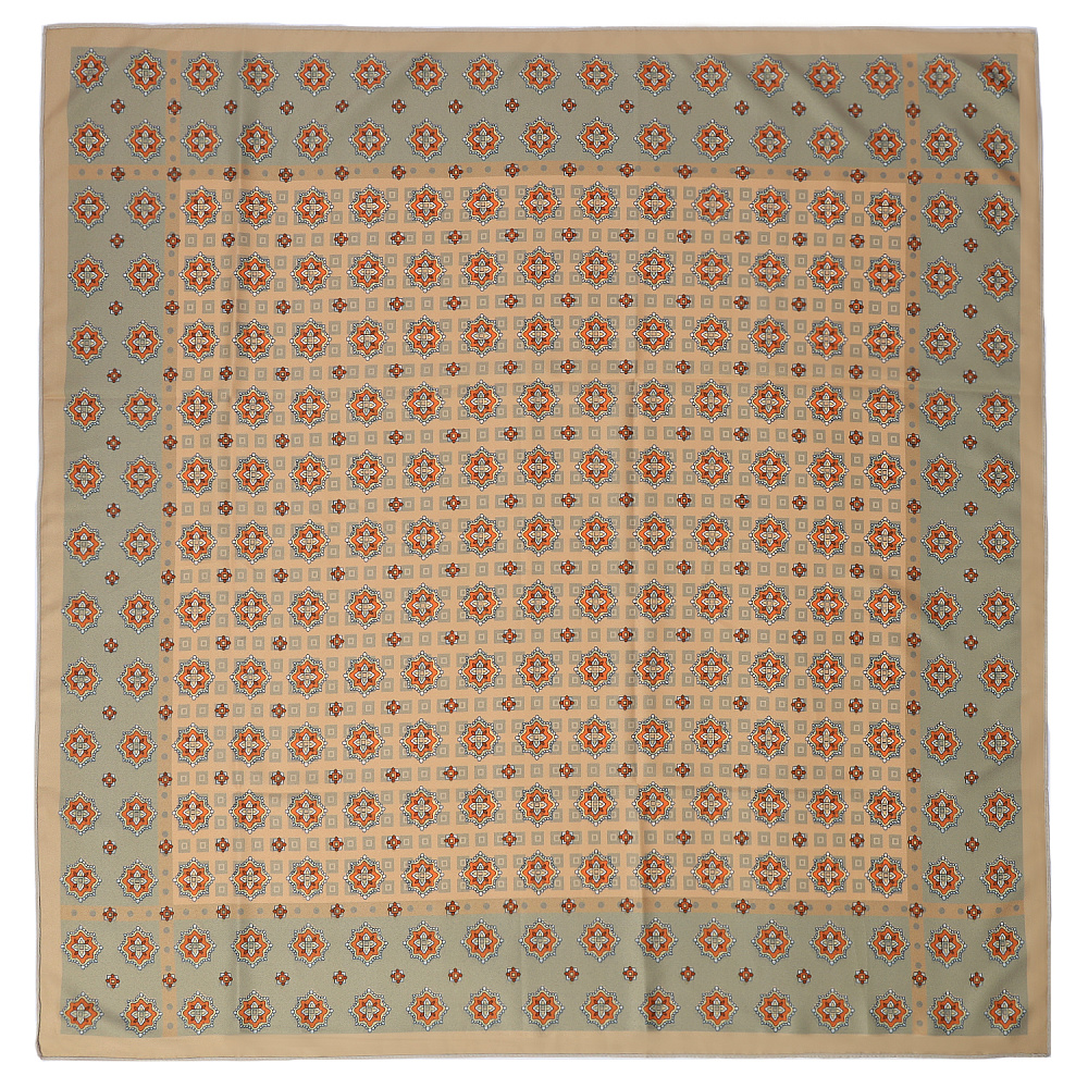 Роскошный двусторонний женский платок итальянского бренда FABRETTI из искусственного шелка украшен с одной стороны сочетанием восточных цветочных орнаментов и геометрических форм, с другой – сплошным узором из стилизованных восточных цветов.Теплые коричневые, бежевые и зеленые тона платка идеально сочетаются с коричневой кожей и замшей, однотонной одеждой теплых оттенков. Матовый искусственный шелк прекрасно сочетается с тканями самых разных фактур, материал хорошо переносит чистку, не деформируется и не выцветает.Размер 90*90 см.