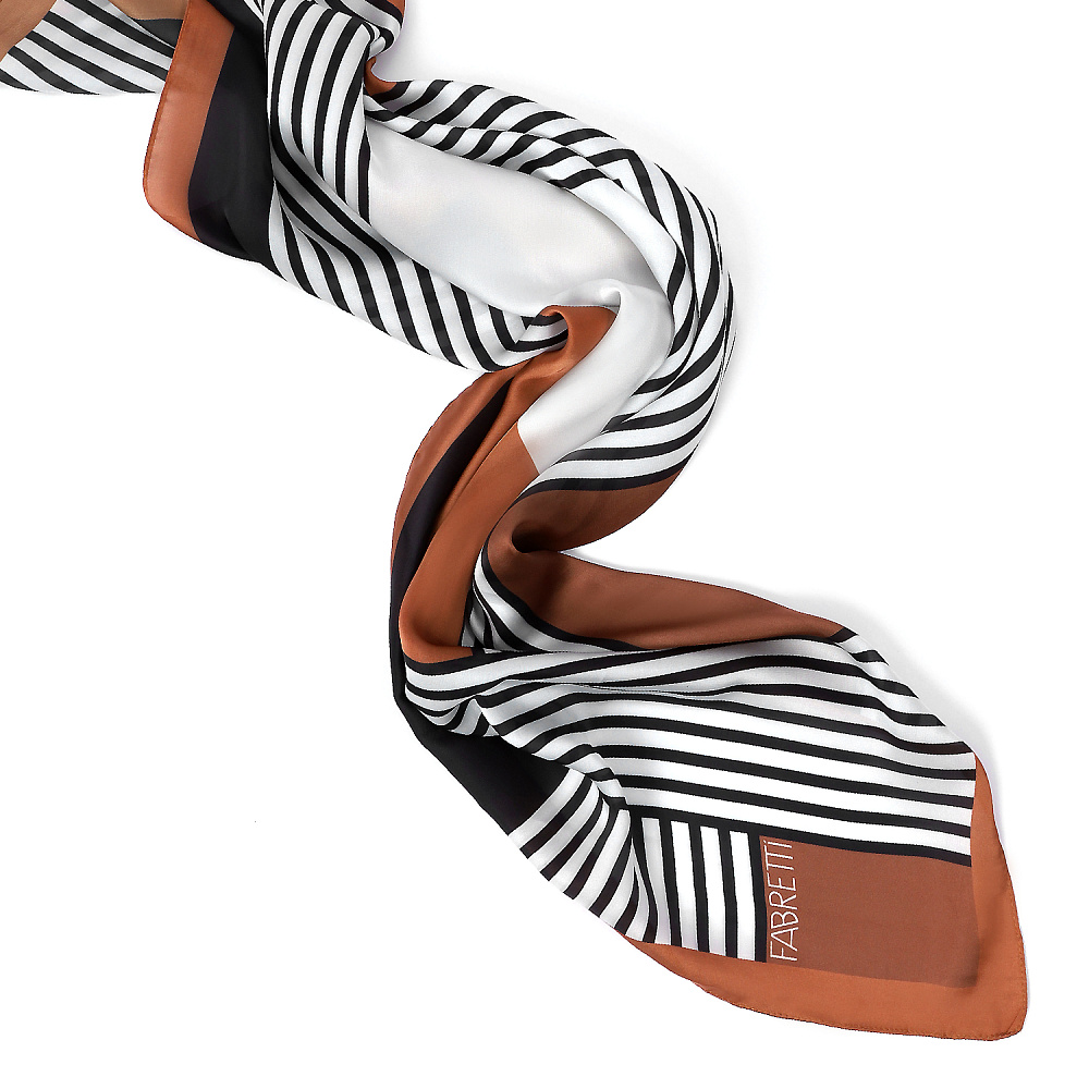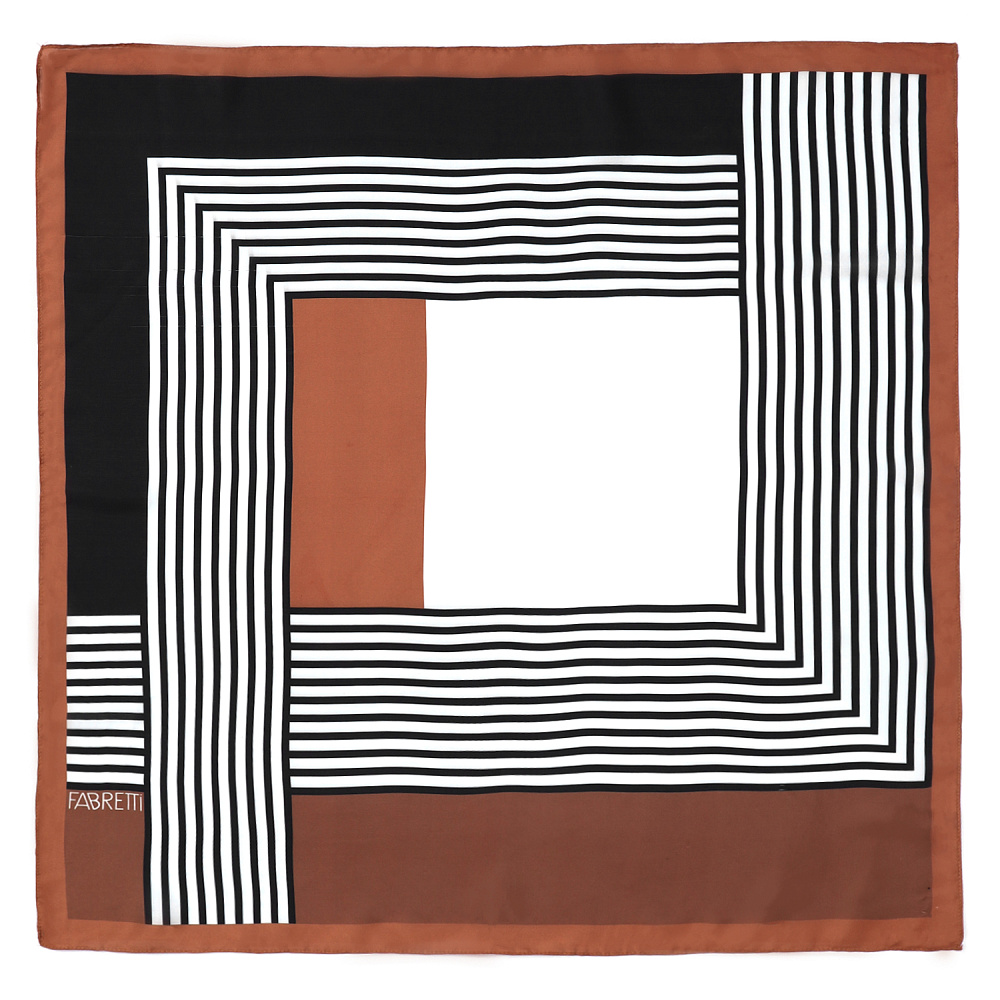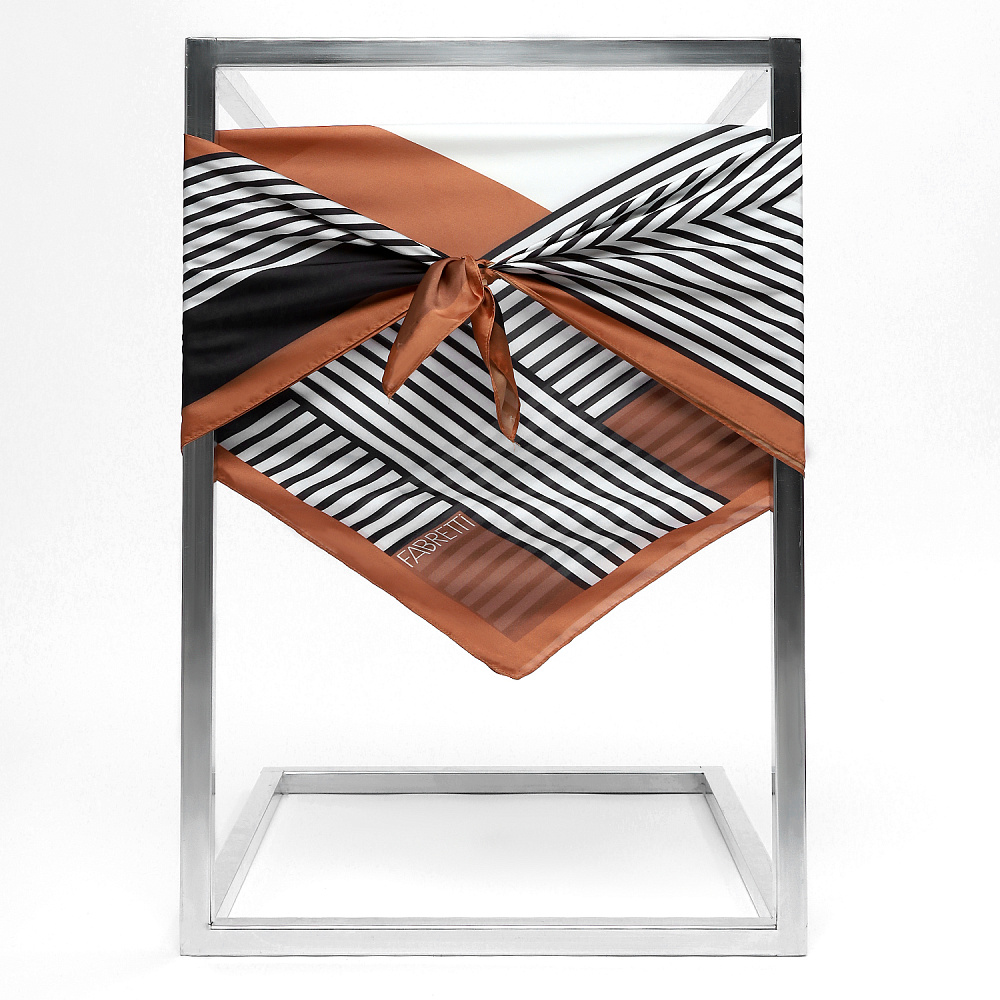 Лаконичный женский платок итальянского бренда FABRETTI из искусственного шелка со строгим геометрическим узором из квадратов и линий в коричневом тоне.Платок с геометрией делает повседневный образ строже, а деловой – разбавляет яркими акцентами. Этот платок создан для привлечения внимания и не требует других акцентных аксессуаров.Легкий искусственный шелк, с его гладкостью и блеском, отлично сочетается как с натуральными, так и искусственными материалами, особенно гладких и матовых фактур.Размер 70*70 см.
