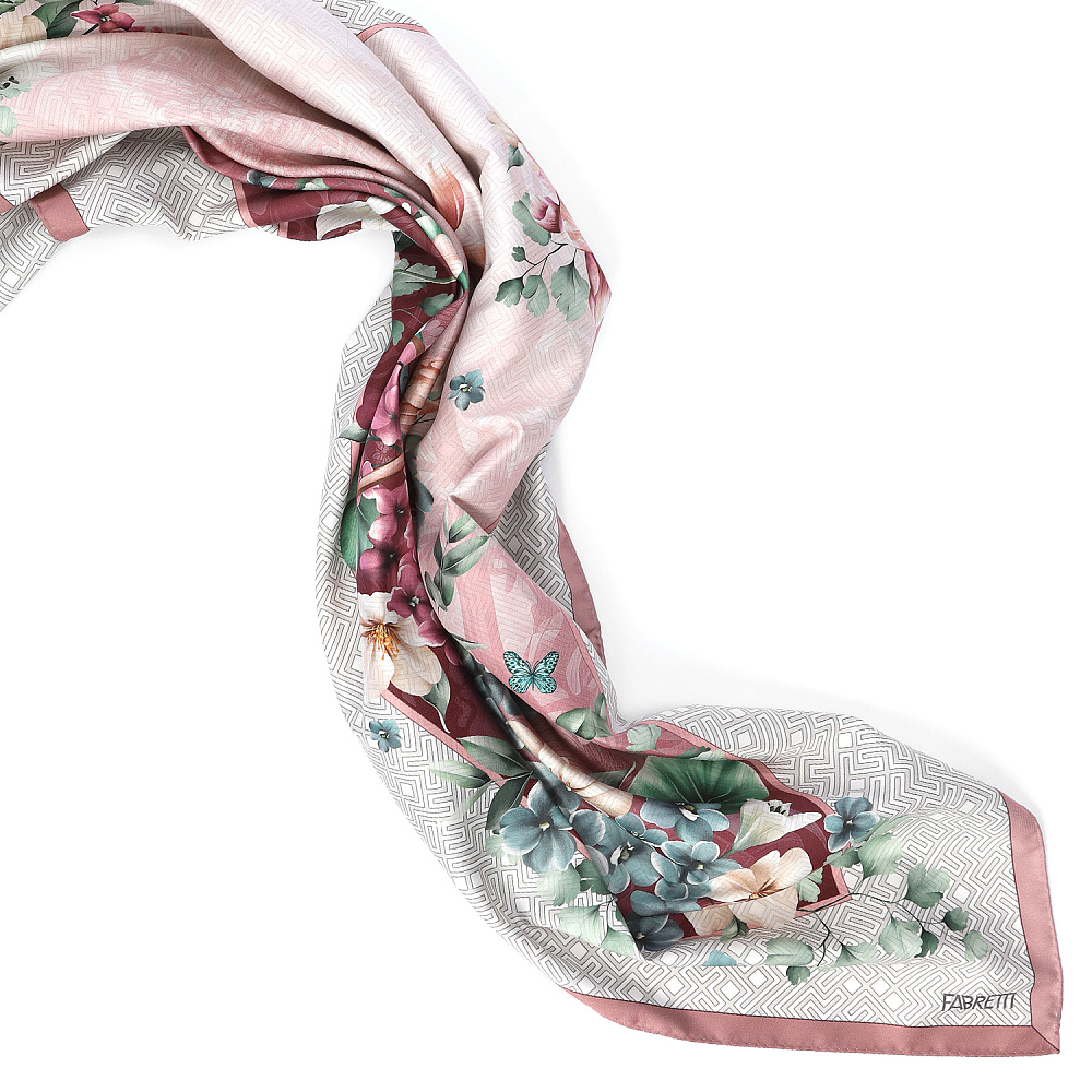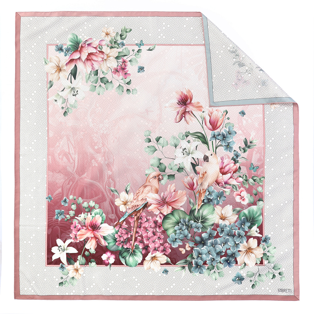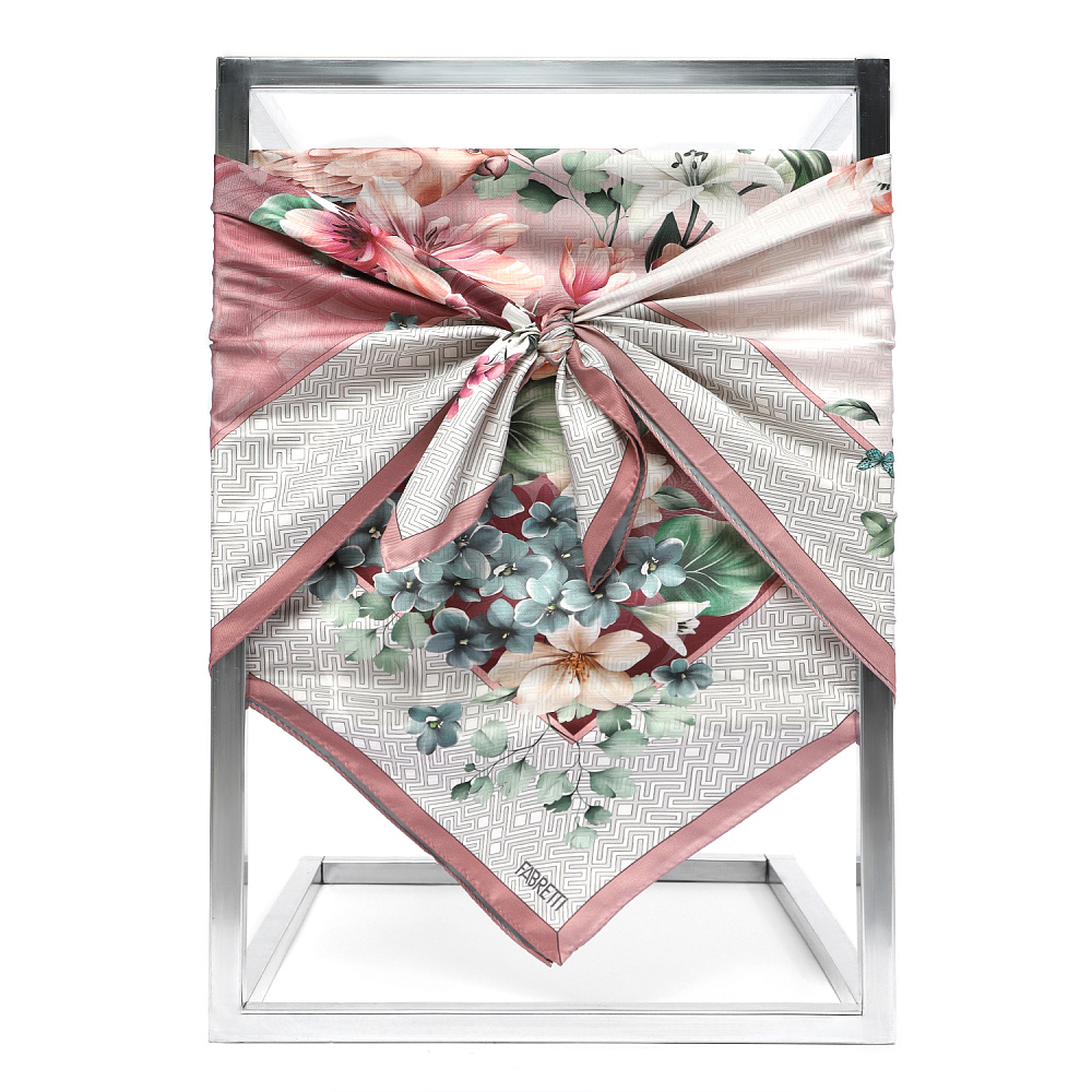 Элегантный женский платок итальянского бренда FABRETTI из искусственного шелка оригинально сочетает романтичные растительные узоры с четким геометрическим орнаментом. Изнаночная сторона украшена лабиринтом из геометрических форм.Матовый искусственный шелк прекрасно сочетается с тканями самых разных фактур, материал хорошо переносит чистку, не деформируется и не выцветает.Динамичный узор из детализированных листьев деревьев привлекает внимание – этот платок может выступать ключевым акцентом в образе. Большой платок в розовых тонах будет хорошо смотреться с контрастной одеждой, с натуральными тканями и природными оттенками – коричневой, зеленой, песочной гаммой.Размер 90*90 см.