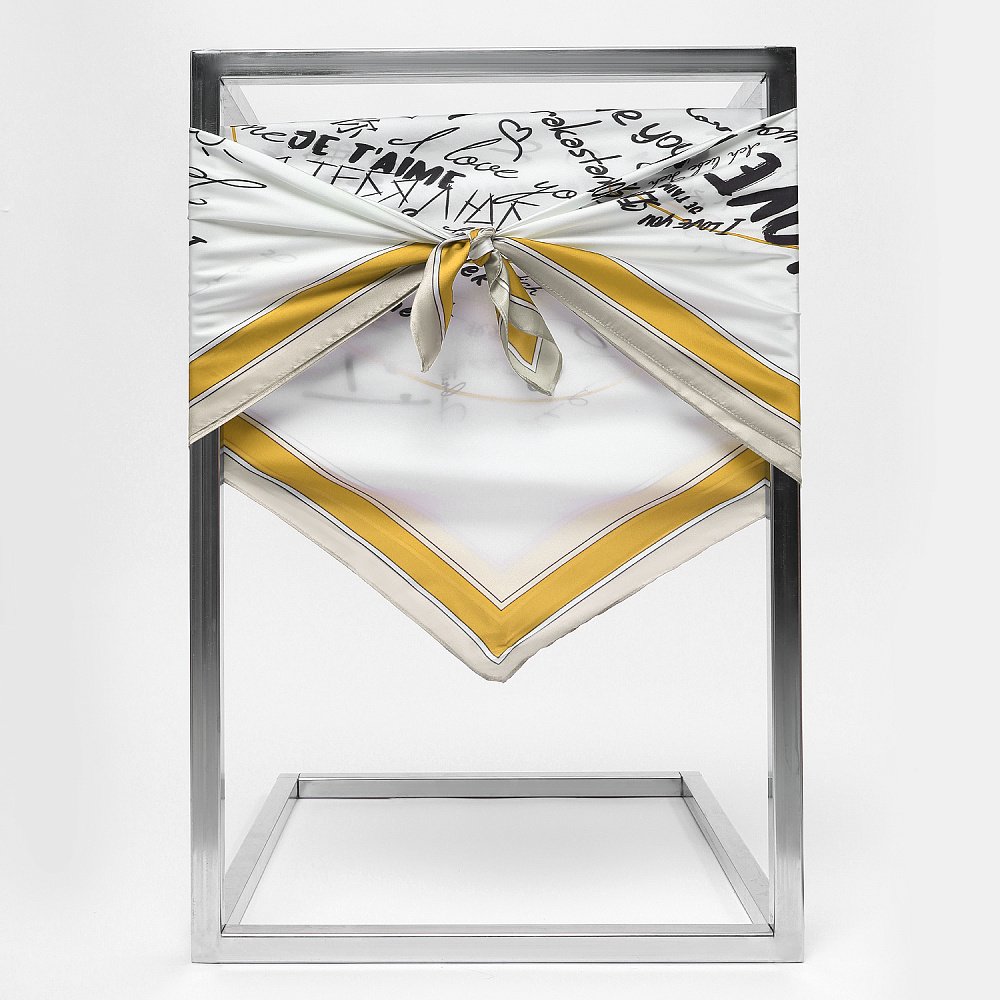 Элегантный женский платок итальянского бренда FABRETTI из искусственного шелка с романтическими надписями на разных языках, формирующими сердце, цветовой акцент – желтый. Это платок станет прекрасным подарком со смыслом.Легкий искусственный шелк, с его гладкостью и блеском, отлично сочетается как с натуральными, так и искусственными материалами, особенно гладких и матовых фактур.Размер 70*70 см.