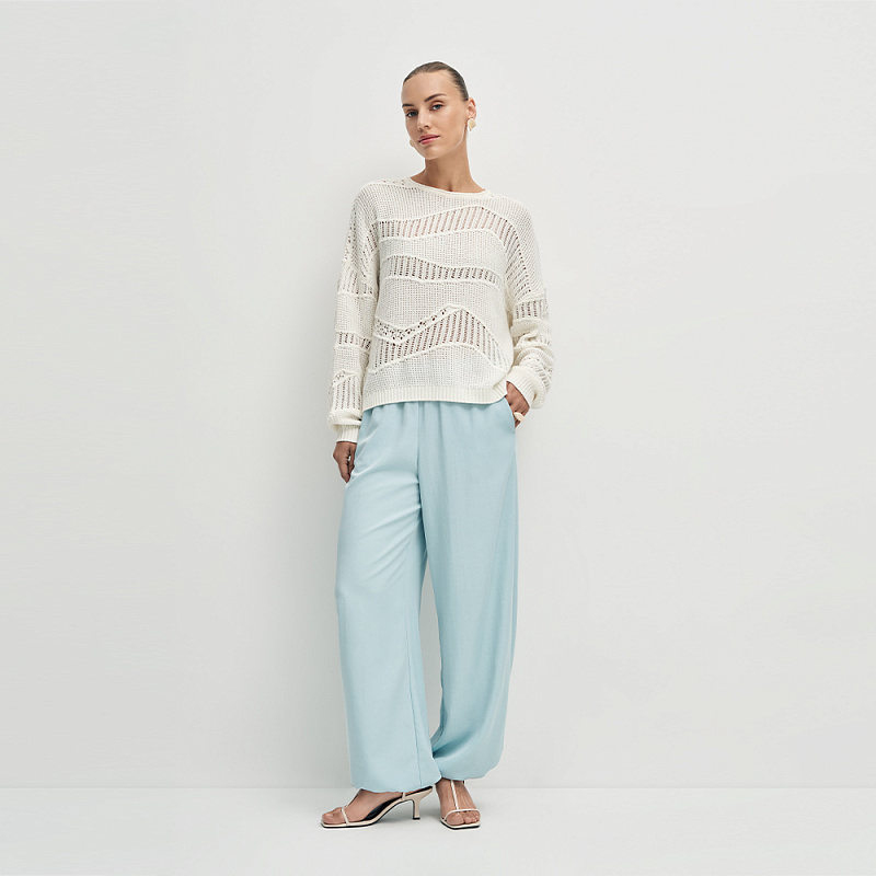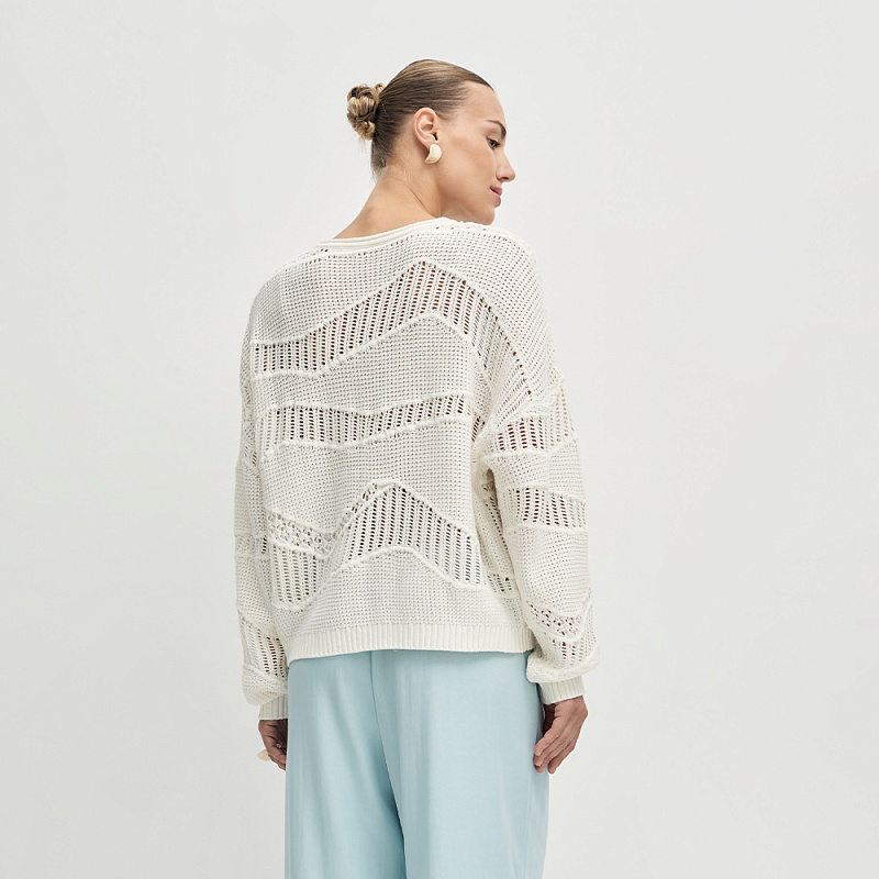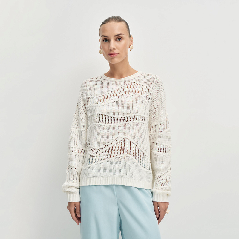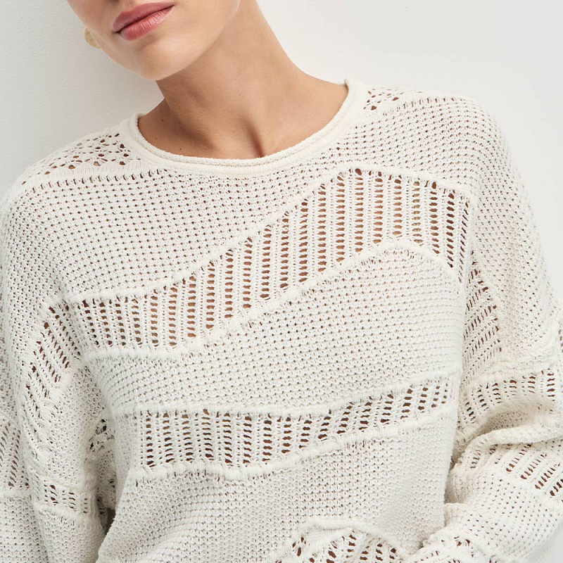 Воздушный пуловер выполненный из мягкой хлопковой пряжи с нежным ажурным переплетением. Фактурное вязаное полотно с ажурными мотивами придает модели особый шарм и объем, делая образ утонченным и женственным.