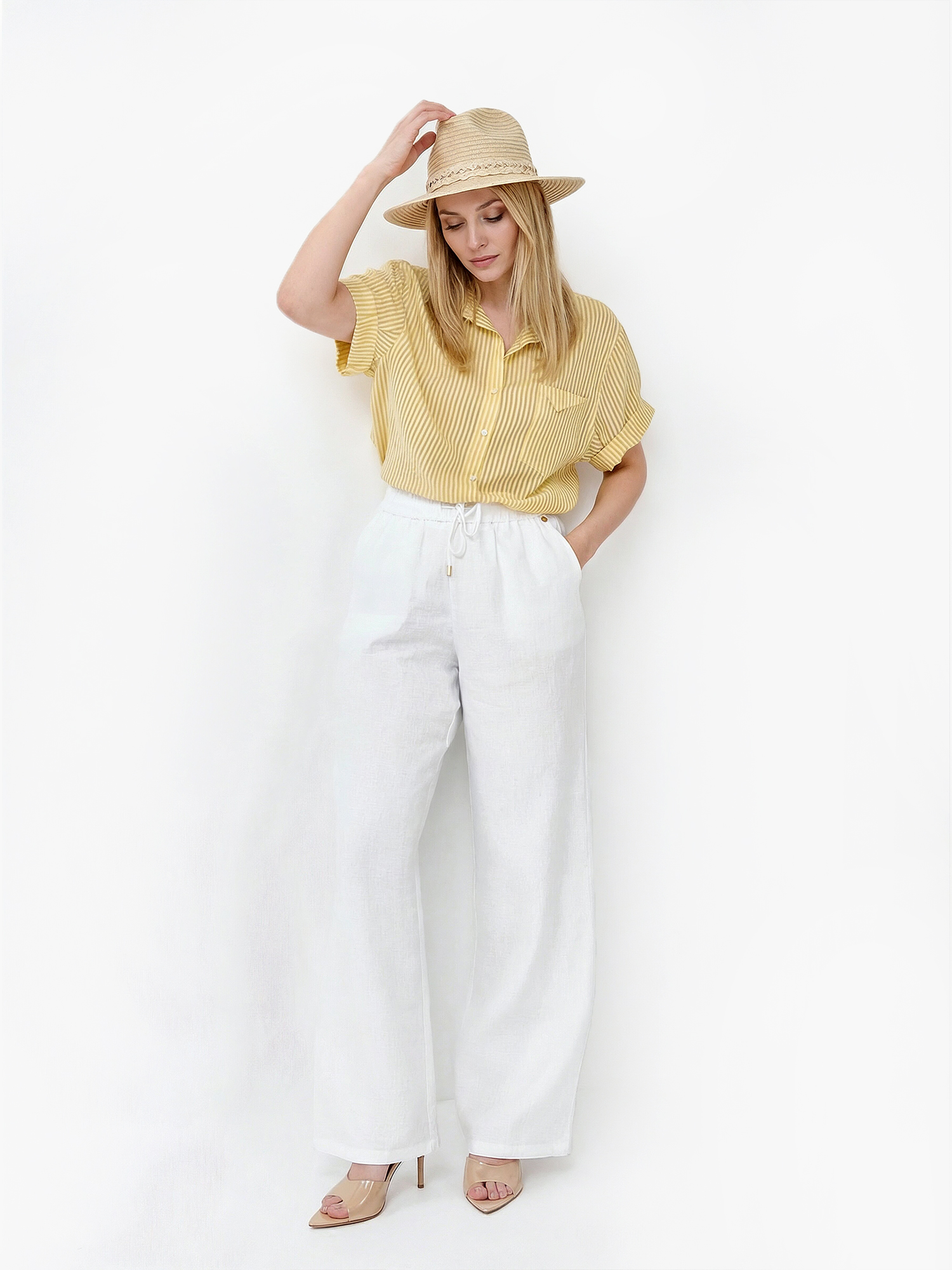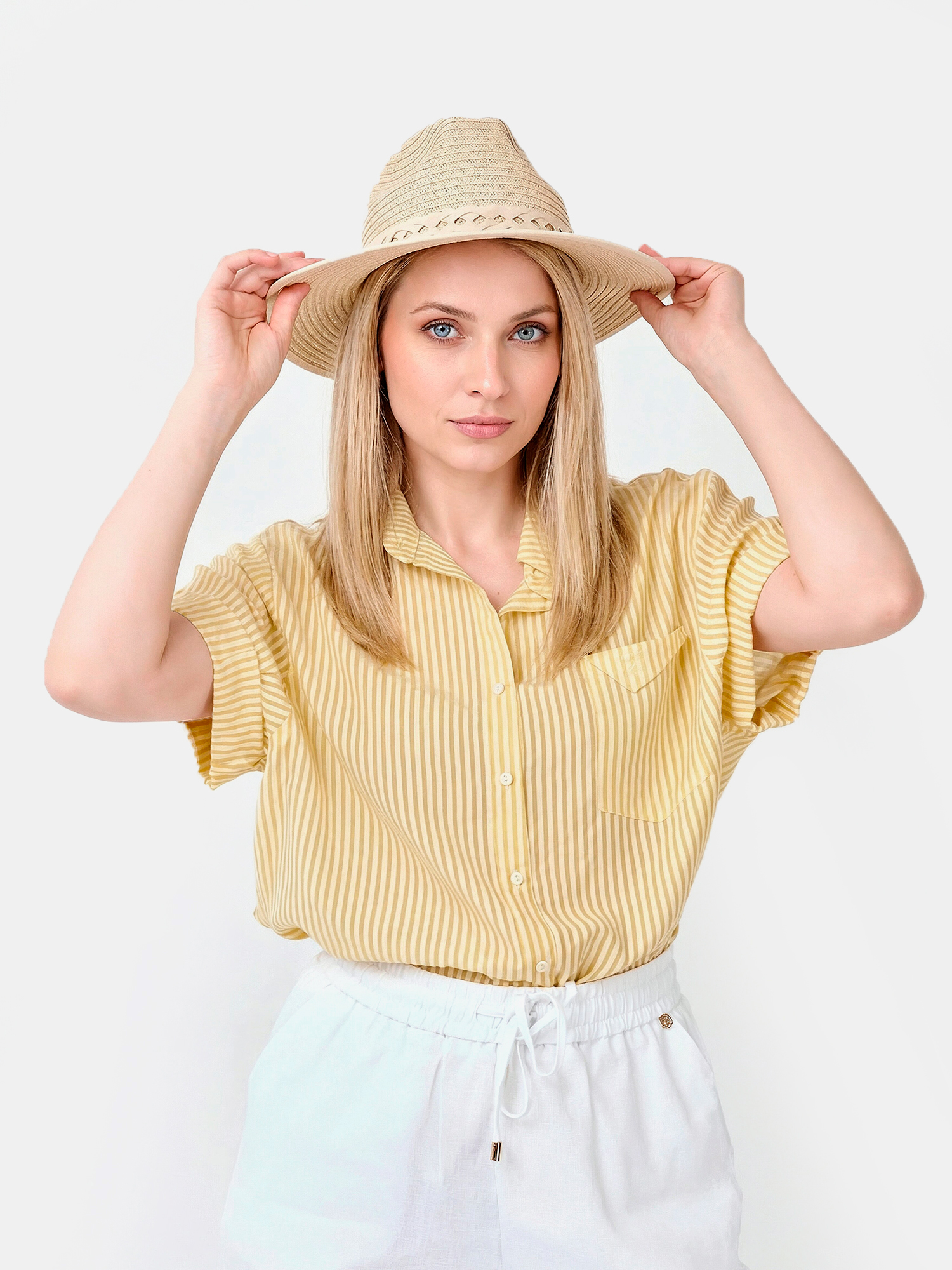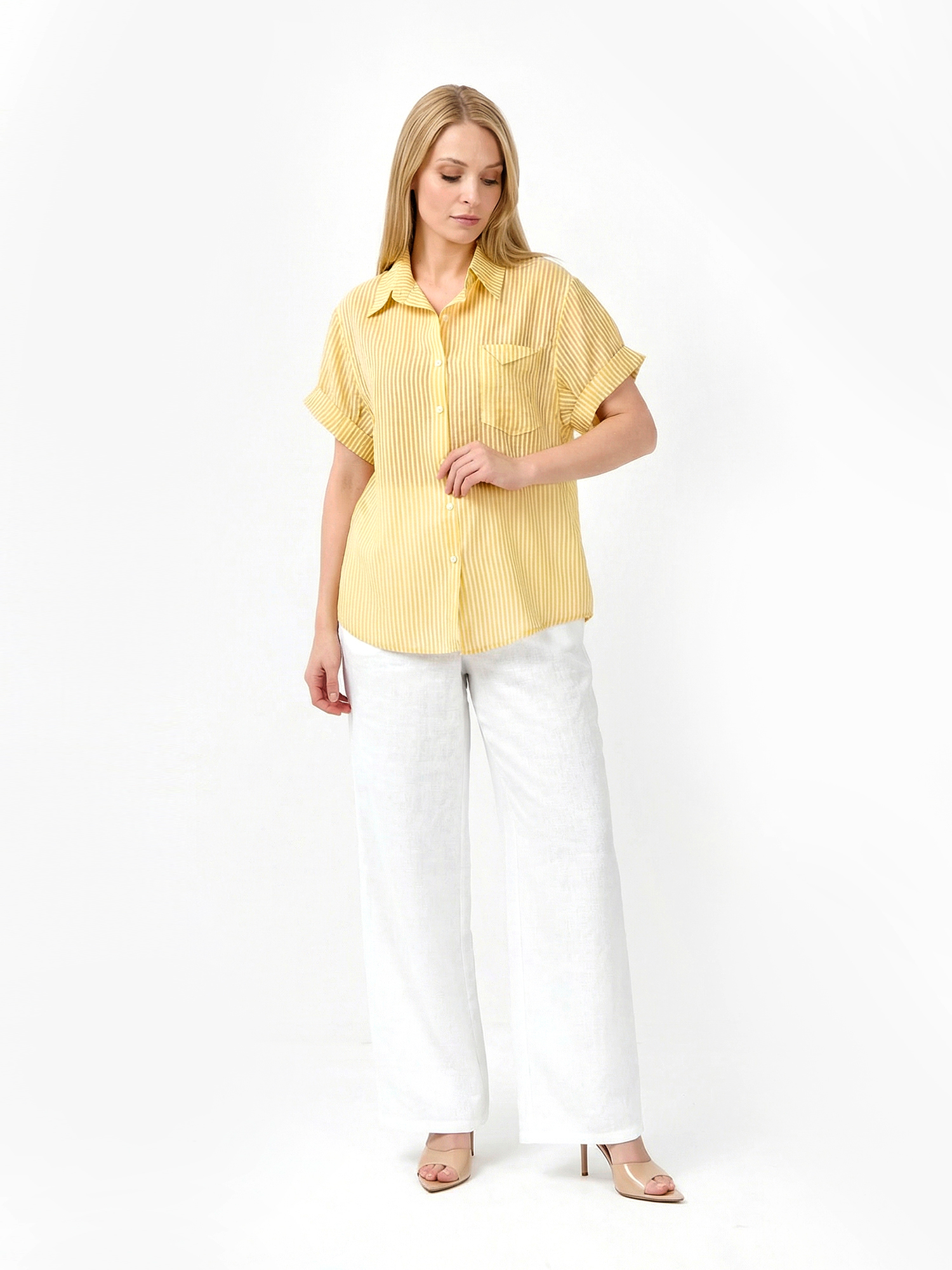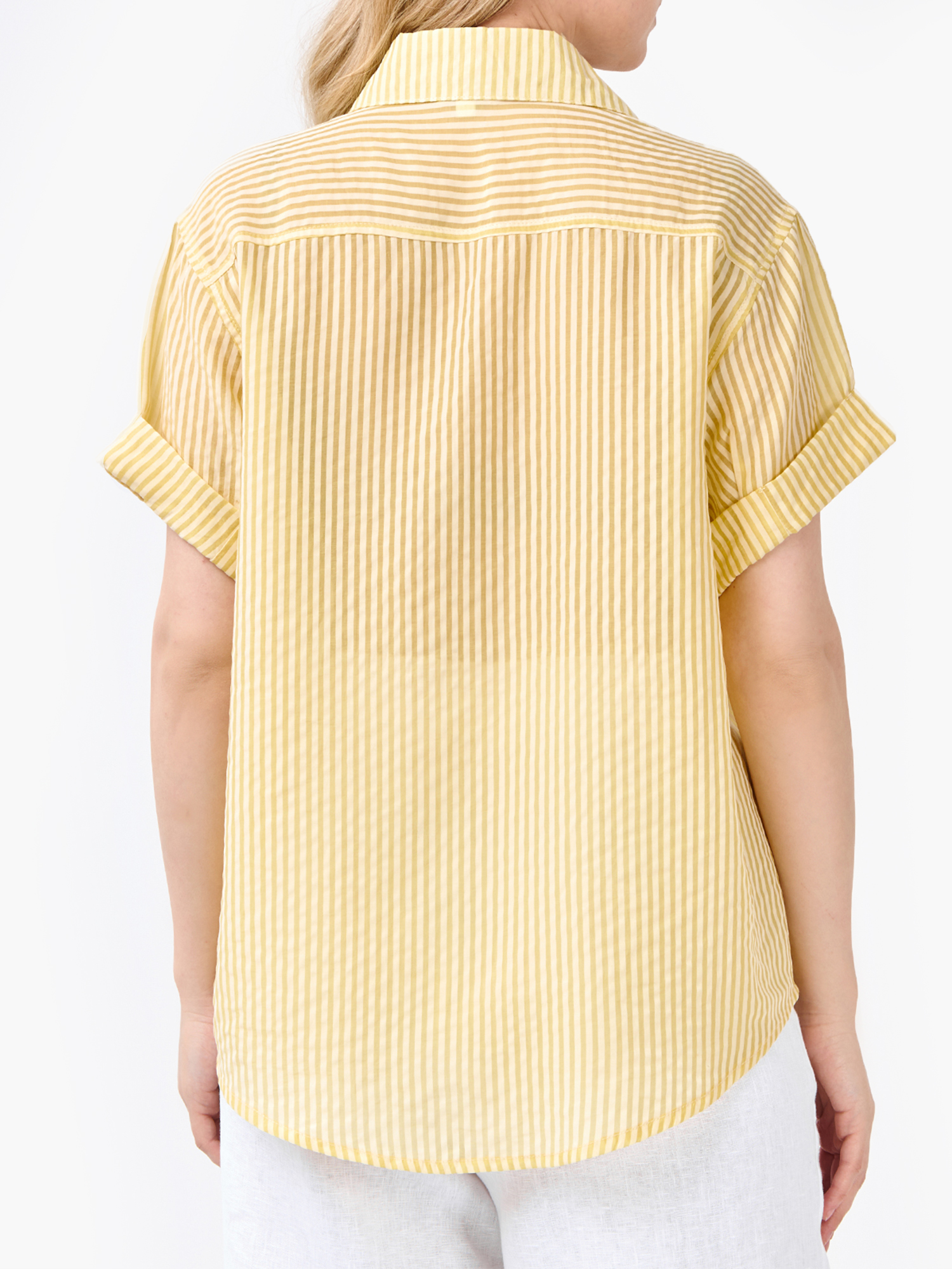 Летняя женская рубашка от итальянского бренда FABRETTI смотрится легко и элегантно благодаря узору в тонкую вертикальную полоску и классическому крою. У этой модели прямой свободный силуэт с кокеткой на спине, короткие рукава дополнены декоративными отворотами. На груди накладной карман с имитацией клапана и вышитой монограммой. Рубашка застегивается на пуговицы и имеет отложной воротник.Легкая полупрозрачная ткань пропускает воздух, позволяя коже дышать. Яркое летнее сочетание белых и желтых полос отлично подходит под городской стиль и пляжную моду. Рубашку можно смело сочетать и с юбками, и с шортами и джинсами.