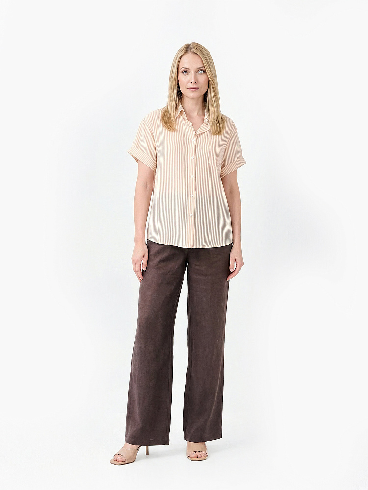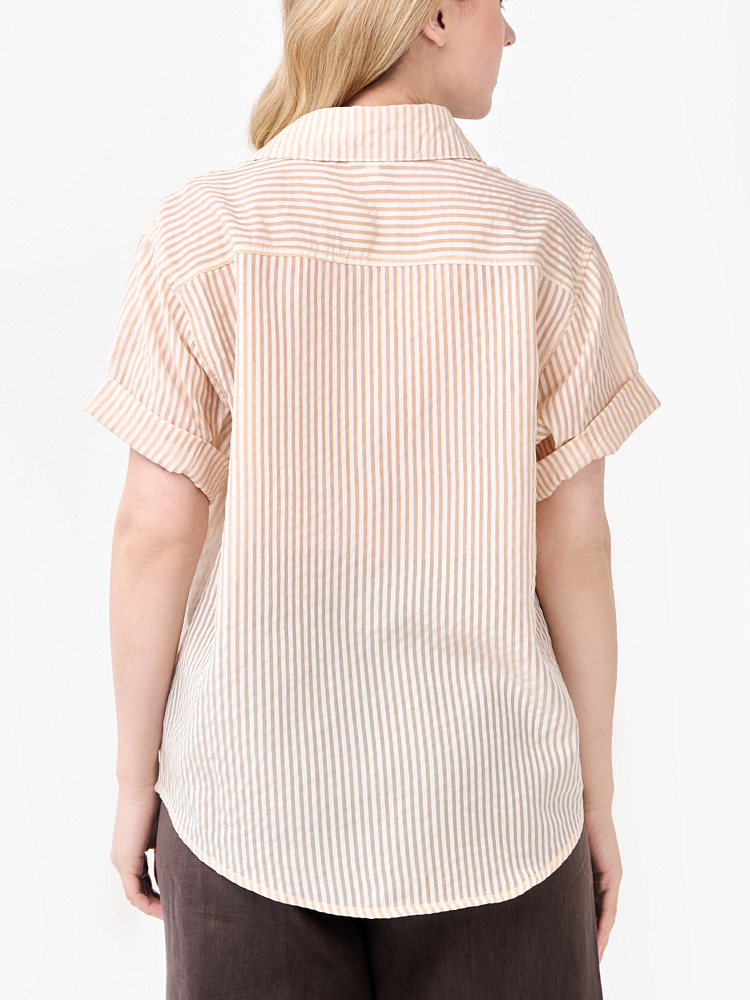 Летняя женская рубашка от итальянского бренда FABRETTI смотрится легко и элегантно благодаря узору в тонкую вертикальную полоску и классическому крою. У этой модели прямой свободный силуэт с кокеткой на спине, короткие рукава дополнены декоративными отворотами. На груди накладной карман с имитацией клапана и вышитой монограммой. Рубашка застегивается на пуговицы и имеет отложной воротник.Легкая полупрозрачная ткань пропускает воздух, позволяя коже дышать. Классическое сочетание белых и бежевых полос отлично подходит под городской стиль и пляжную моду. Рубашку можно смело сочетать и с юбками, и с шортами и джинсами.
