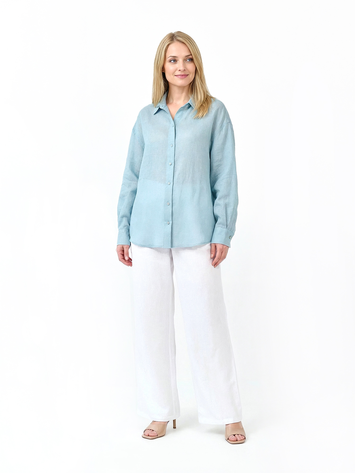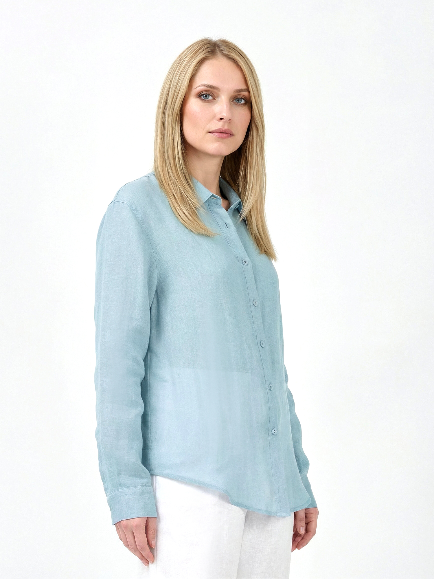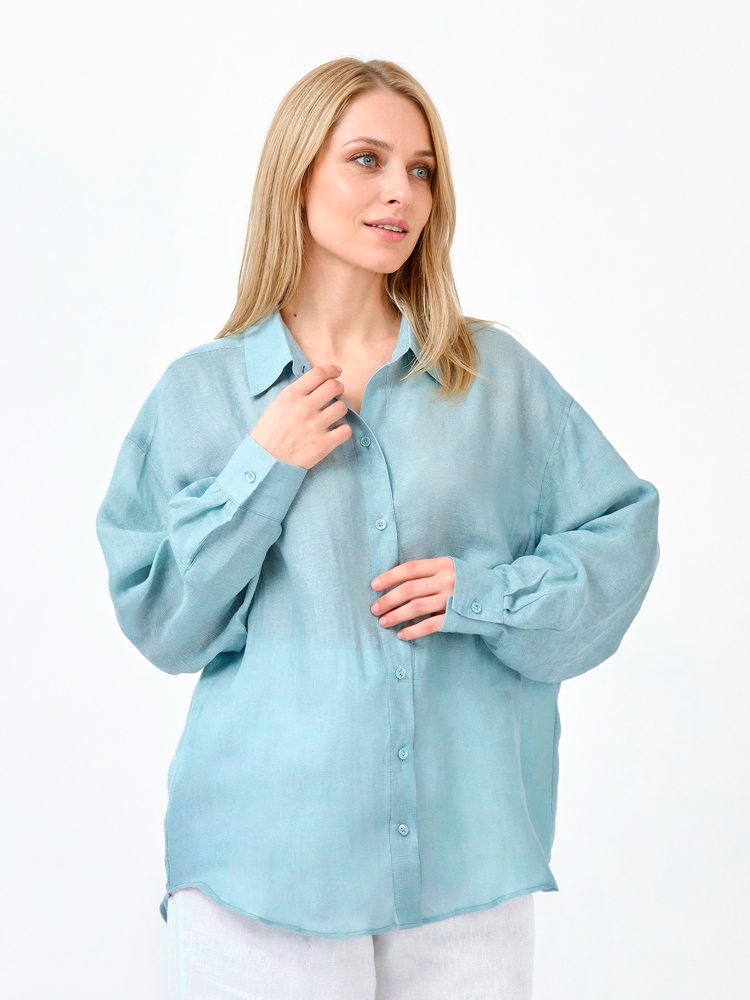 Легкая летняя женская рубашка итальянского бренда FABRETTI в нежном оттенке морской волны с фактурой ткани «елочкой».Выполнена в прямом крое, с кокеткой на спине, отложным воротником и застежкой на пуговицы. Длинные рукава дополнены манжетами на пуговице.Блуза выполнена из сочетания рами и тенсель – легкой ткани натурального происхождения. Она пропускает воздух, приятна на ощупь.Эта модель будет хорошо сочетаться с однотонными юбками и брюками, с легкими джинсами. Эта рубашка - яркий акцент в образе, поэтому к ней подойдут лаконичные нейтральные аксессуары.