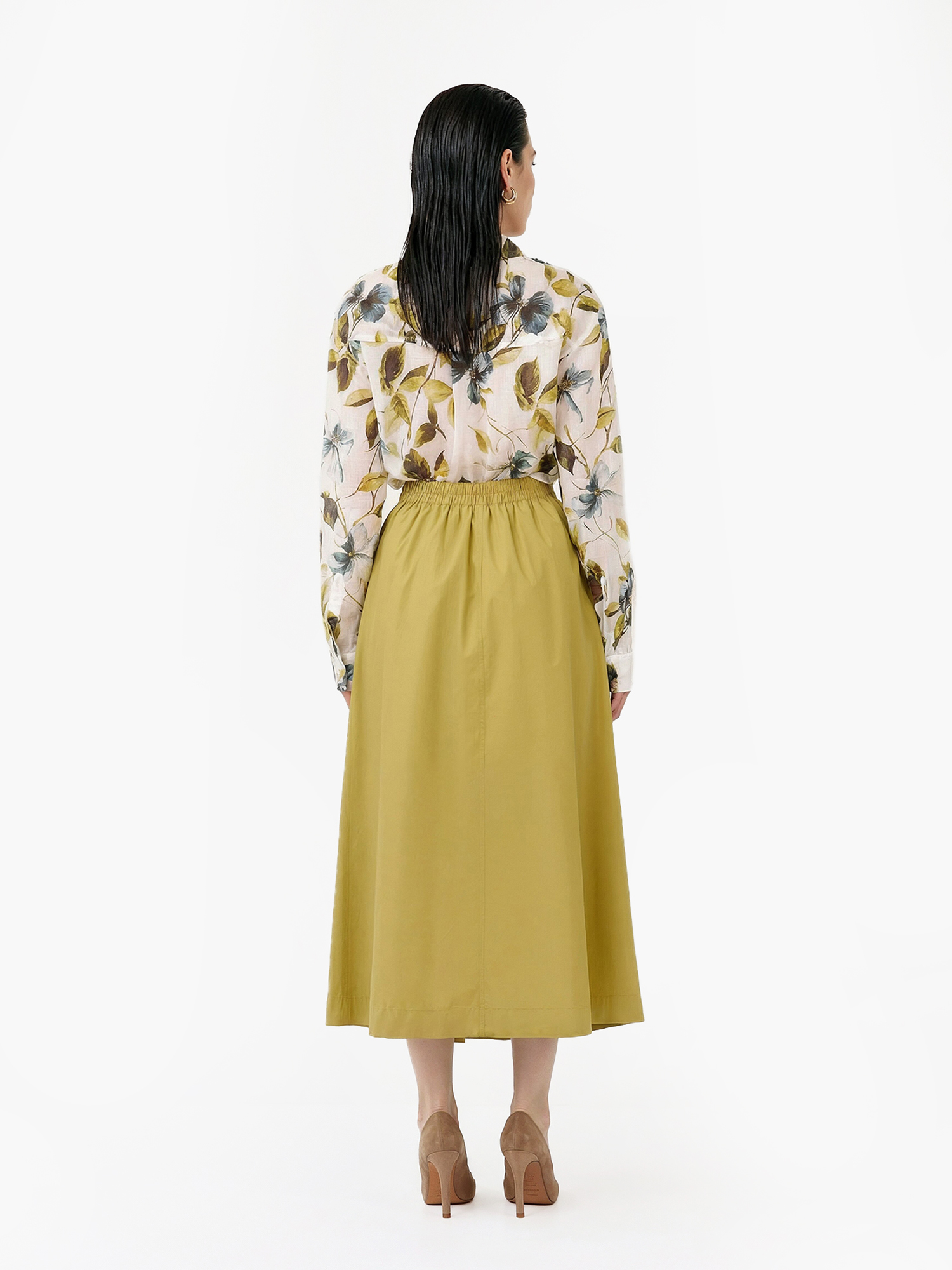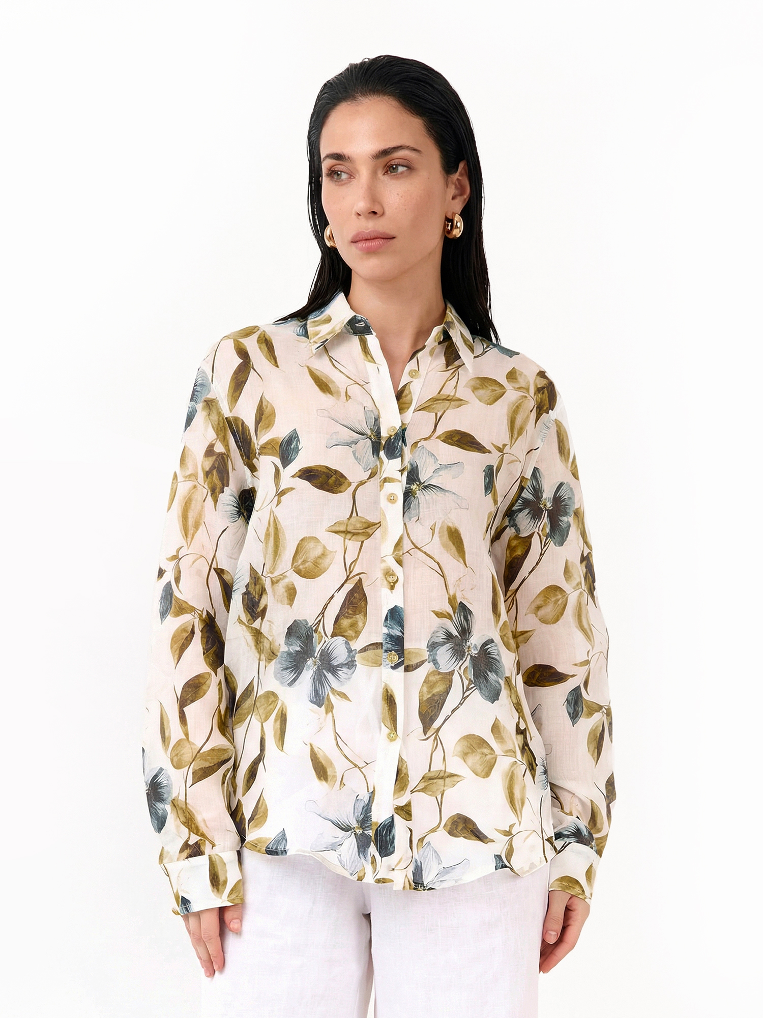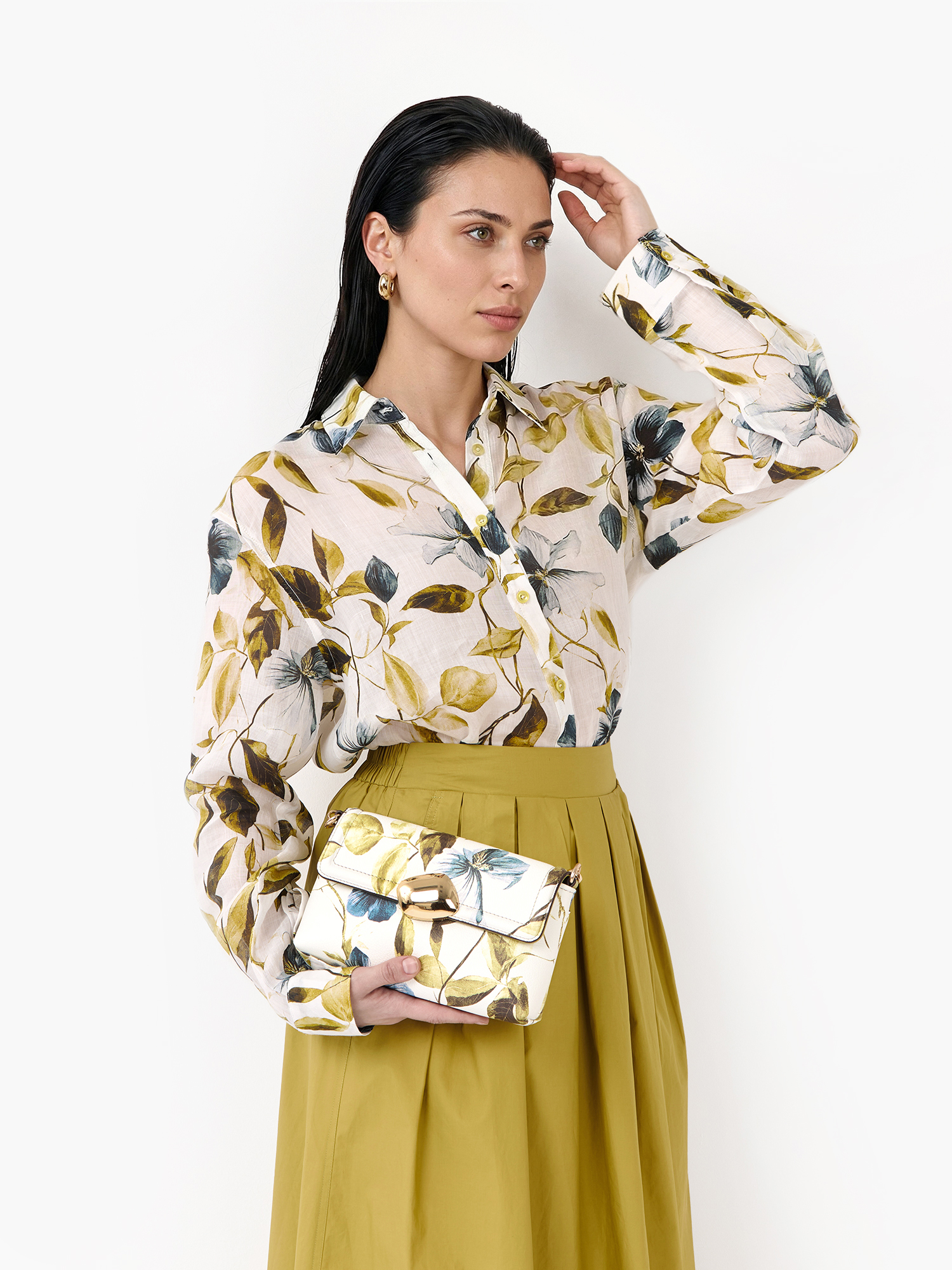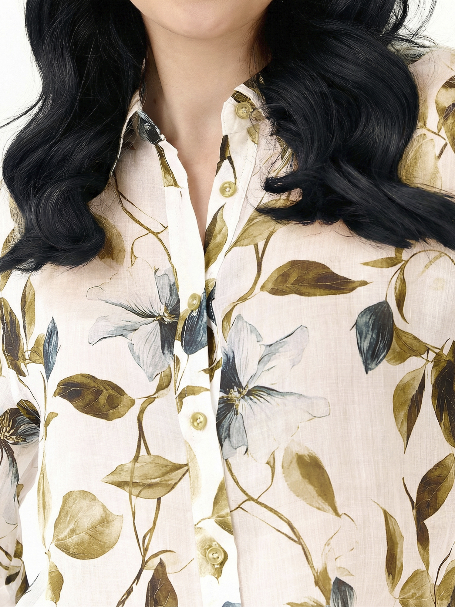 Легкая летняя женская рубашка итальянского бренда FABRETTI из натурального дышащего материала рами с очень легкой, полупрозрачной фактурой. Выполнена в прямом крое, с кокеткой на спине, отложным воротником и застежкой на пуговицы. Длинные рукава дополнены манжетами на пуговице. Ткань украшена летним принтом с желто-зелеными цветущими лозами и цветами.Модель будет хорошо сочетаться с однотонными юбками и брюками любой длины, с легкими джинсами. Эта рубашка - яркий акцент в образе, поэтому к ней подойдут лаконичные нейтральные аксессуары.
