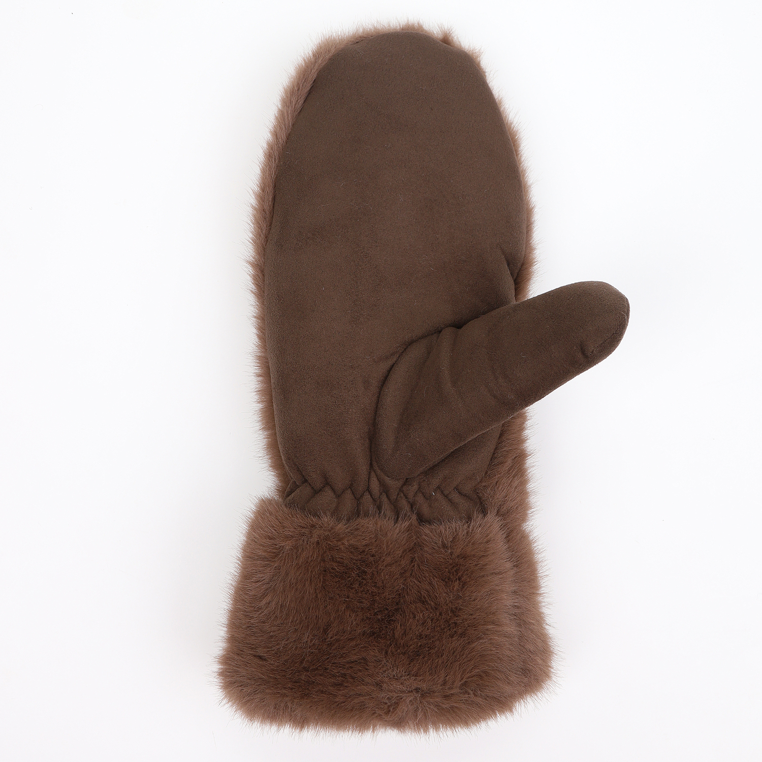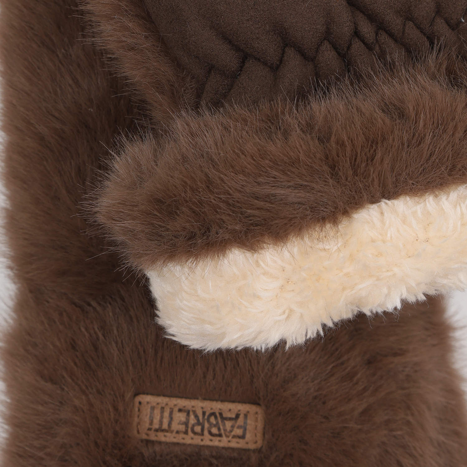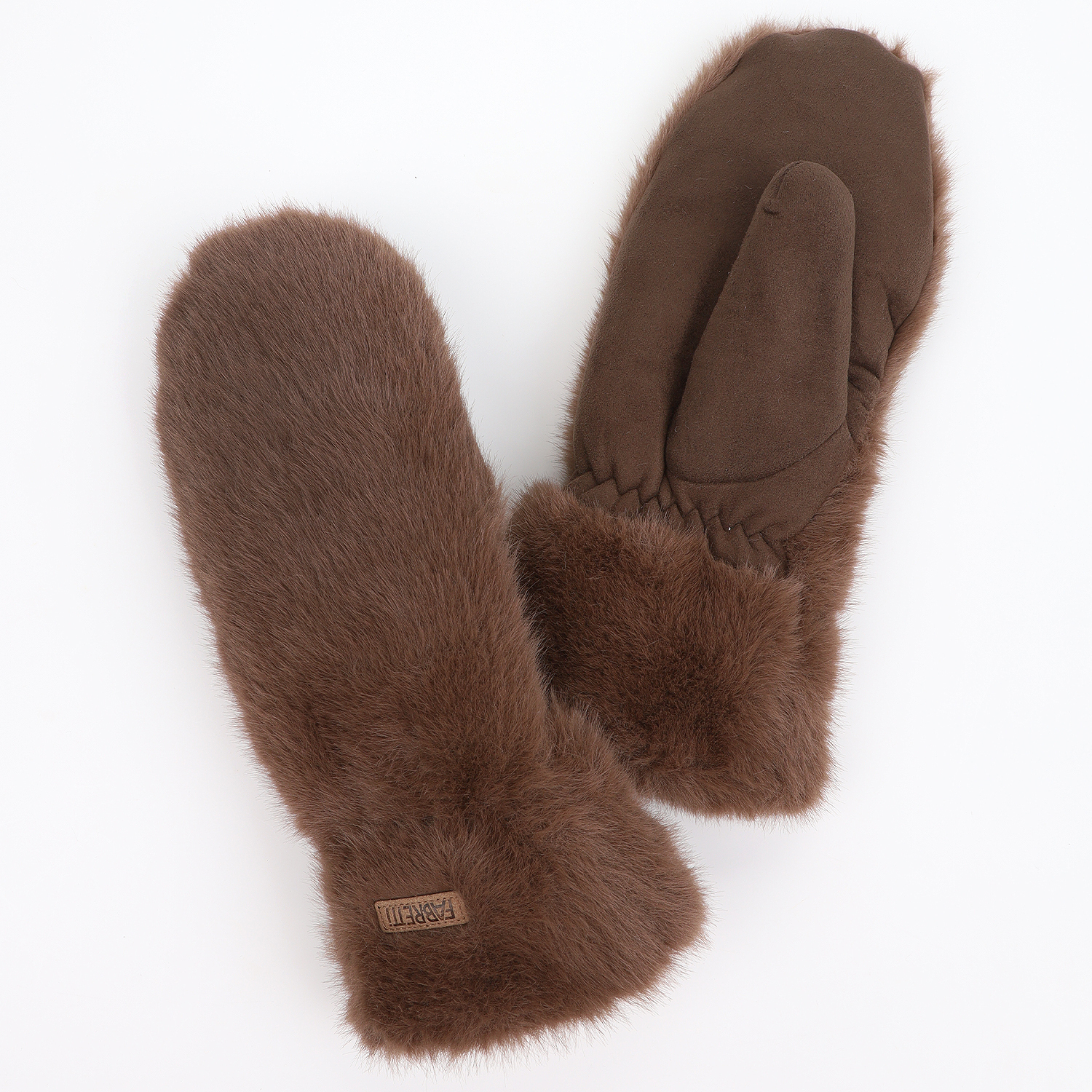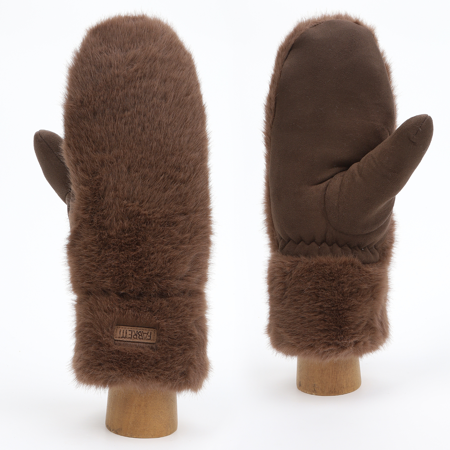 Оригинальные комбинированные рукавицы итальянского бренда FABRETTI сочетают искусственную замшу нежной фактуры на тыльной стороне и экомех кролика - на лицевой. Внутренняя часть утеплена подкладкой из искусственного меха.  На лицевой стороне лаконичный декор – пришивной кожаный логотип.