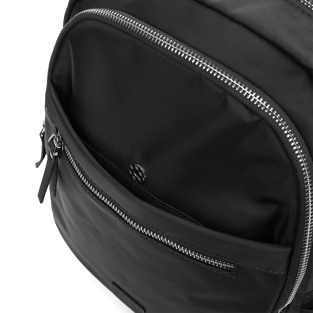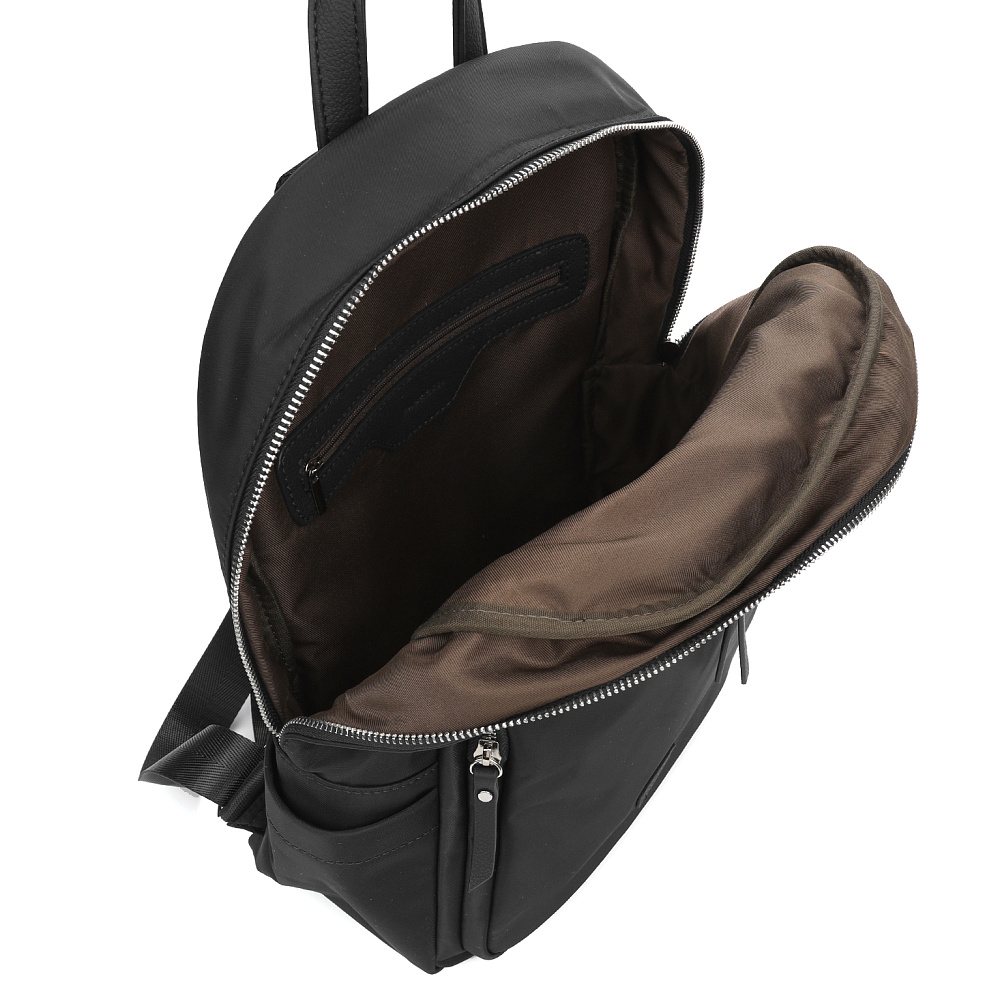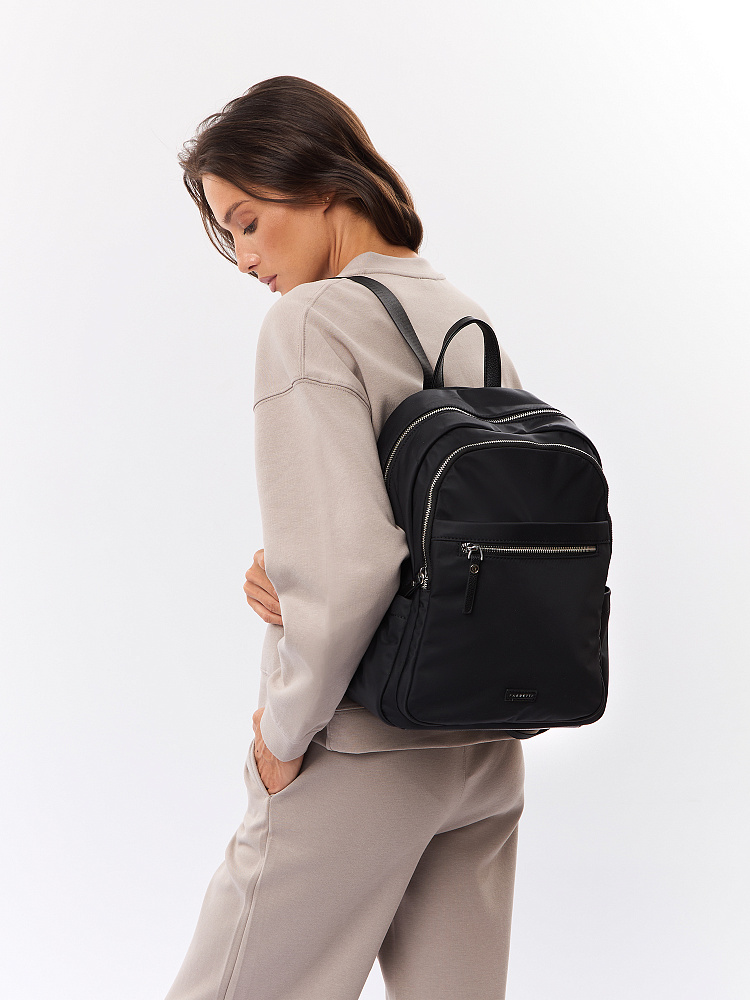 Современный женский городской рюкзак из коллекции итальянского бренда FABRETTI в классическом черном цвете.Эта модель с лаконичным дизайном станет надежным спутником как в городе, так и в небольших поездках. Универсальный дизайн хорошо комбинируется с гардеробом в стиле кэжуал.У рюкзака два отделения – объемное основное и плоский карман, оба застегиваются на полукруглые металлические молнии. В основном отделении открытый карман и на молнии. Лицевая часть рюкзака также дополнена карманом на молнии, по бокам открытые карманы для воды и мелочей. Модель дополнена регулируемыми текстильными бретелями и верхней ручкой из экокожи. Поводки на молниях и пришивной логотип также выполнены из экокожи с фирменным лого.Эксклюзивная плотная гладкая ткань с деликатным сатиновым блеском имеет водоотталкивающие свойства.Дно усилено вставкой из экокожи. Рюкзак вмещает формат А4. Цвет фурнитуры – серебро.