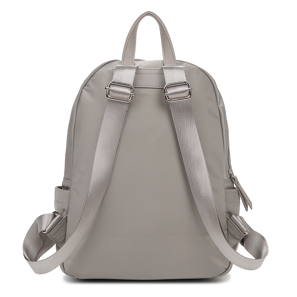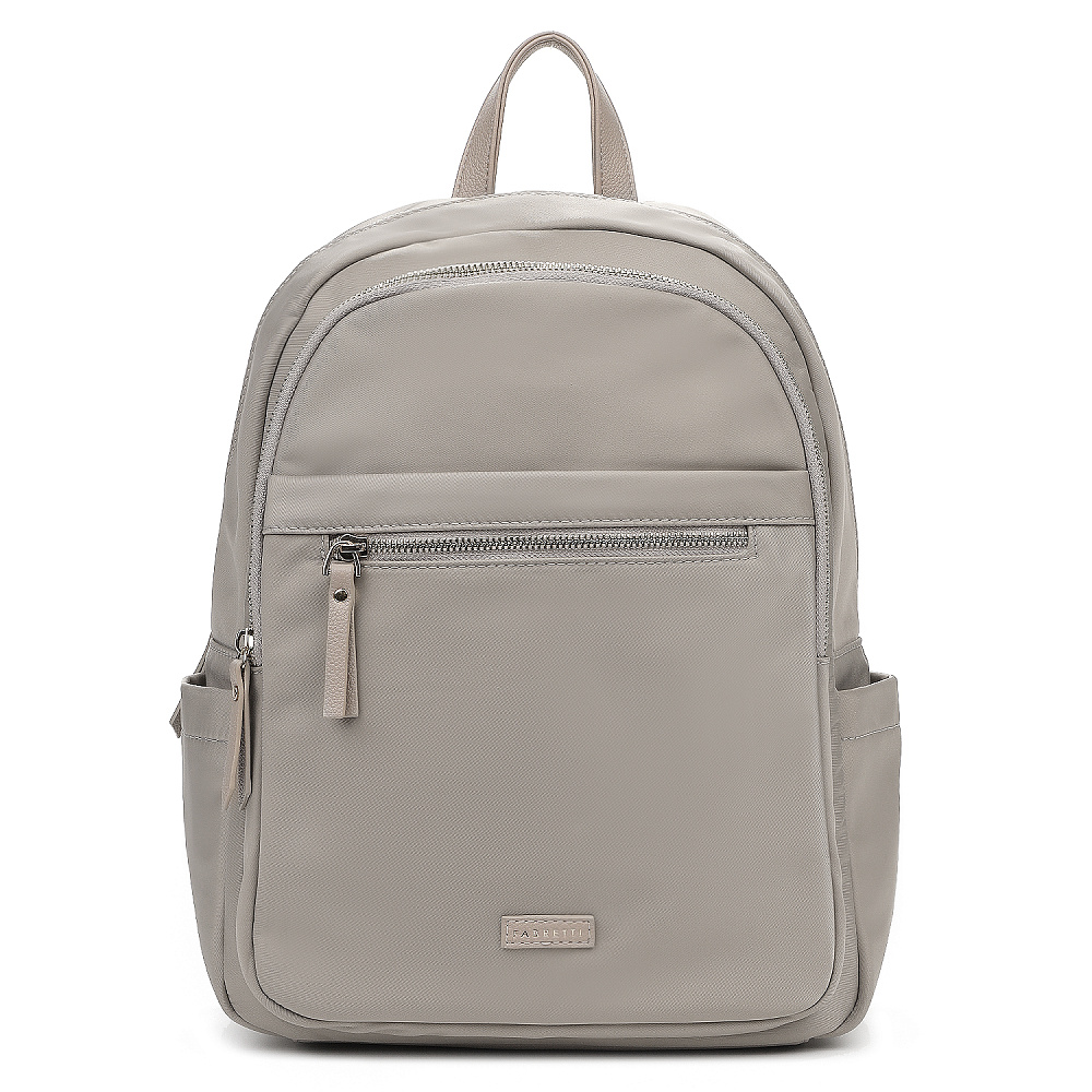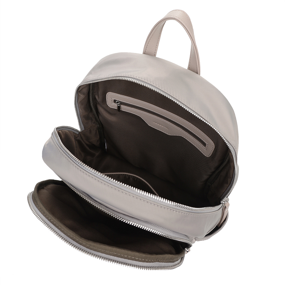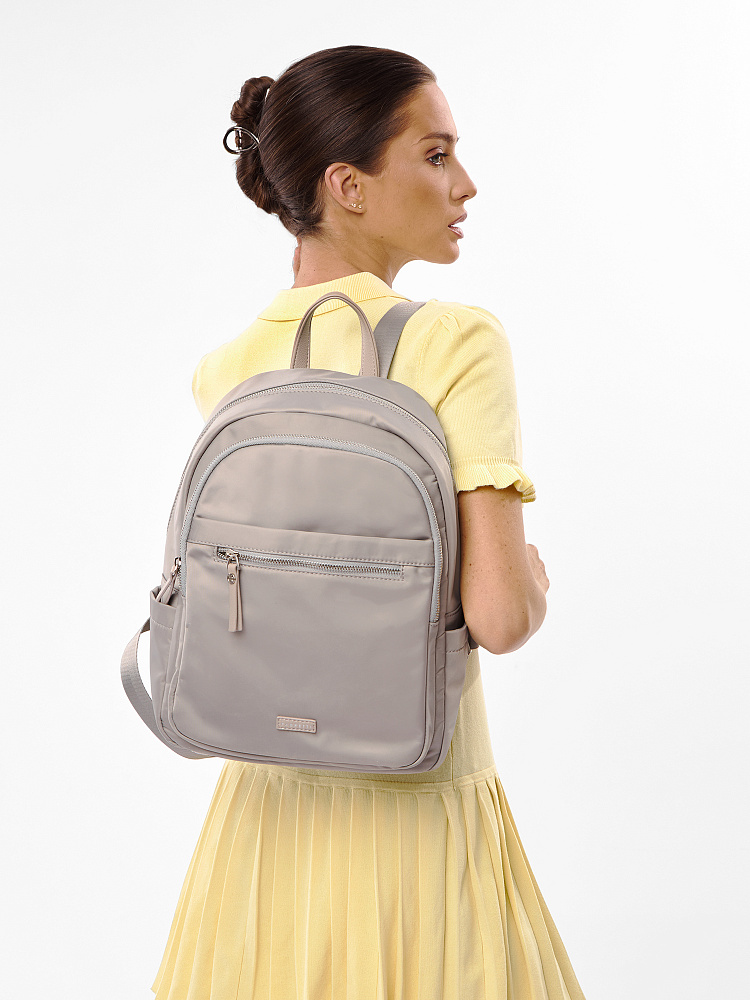 Современный женский городской рюкзак из коллекции итальянского бренда FABRETTI в нежном сером оттенке с бежевыми нотками.Эта модель с лаконичным дизайном станет надежным спутником как в городе, так и в небольших поездках. Универсальный дизайн хорошо комбинируется с гардеробом в стиле кэжуал.У рюкзака два отделения – объемное основное и плоский карман, оба застегиваются на полукруглые металлические молнии. В основном отделении открытый карман и на молнии. Лицевая часть рюкзака также дополнена карманом на молнии, по бокам открытые карманы для воды и мелочей. Модель дополнена регулируемыми текстильными бретелями и верхней ручкой из экокожи. Поводки на молниях и пришивной логотип также выполнены из экокожи с фирменным лого.Эксклюзивная плотная гладкая ткань с деликатным сатиновым блеском имеет водоотталкивающие свойства.Дно усилено вставкой из экокожи. Рюкзак вмещает формат А4. Цвет фурнитуры – серебро