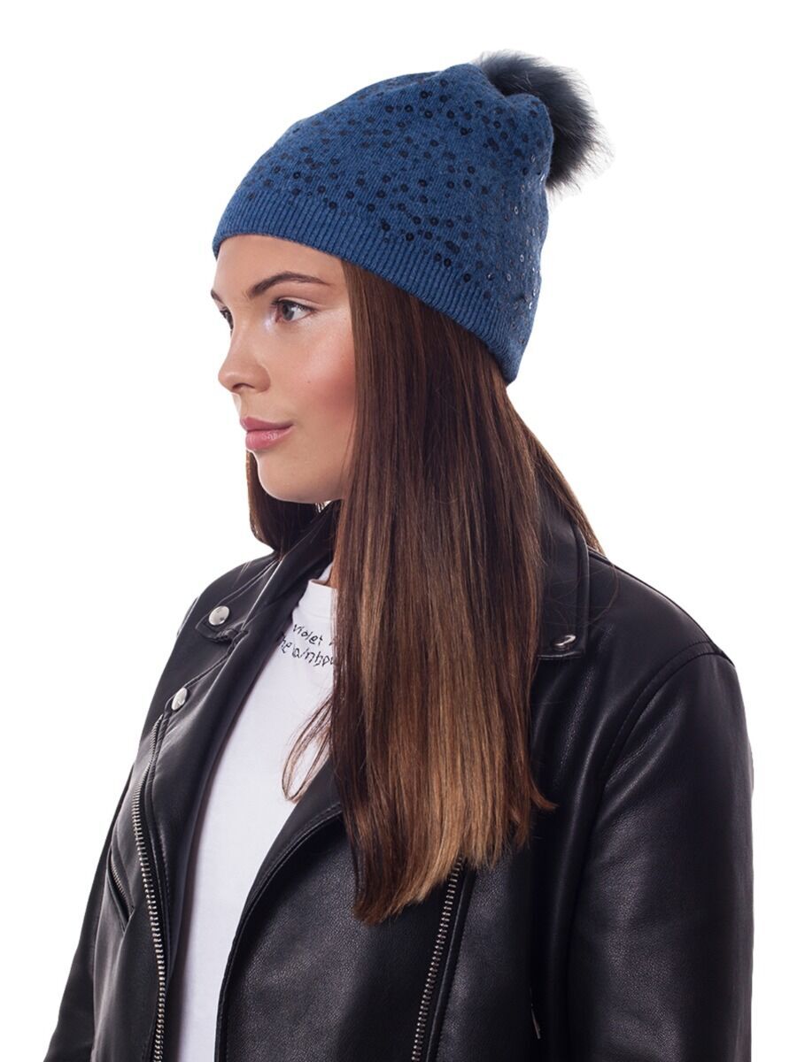 Яркая синяя шапочка, украшенная пайетками и большим помпоном. Позволяет создать новый образ, вплетя нотку непринужденности и игривости. Пушистый помпон из натурального меха, как ультрамодный тренд сезона только добавляет в получившийся образ шарма. Шапка женская с помпоном и пайетками – настоящий хит молодежных линеек головных уборов.