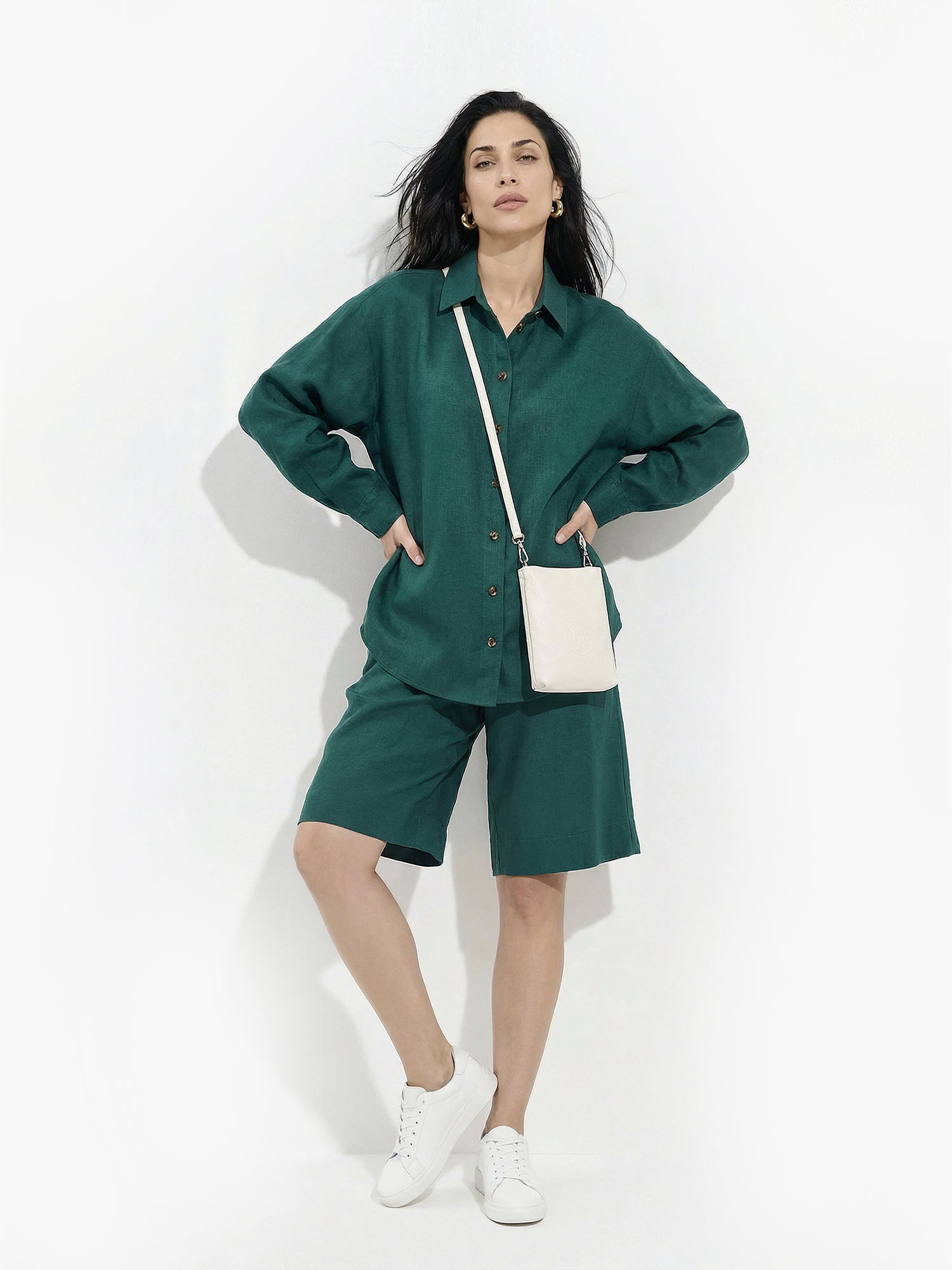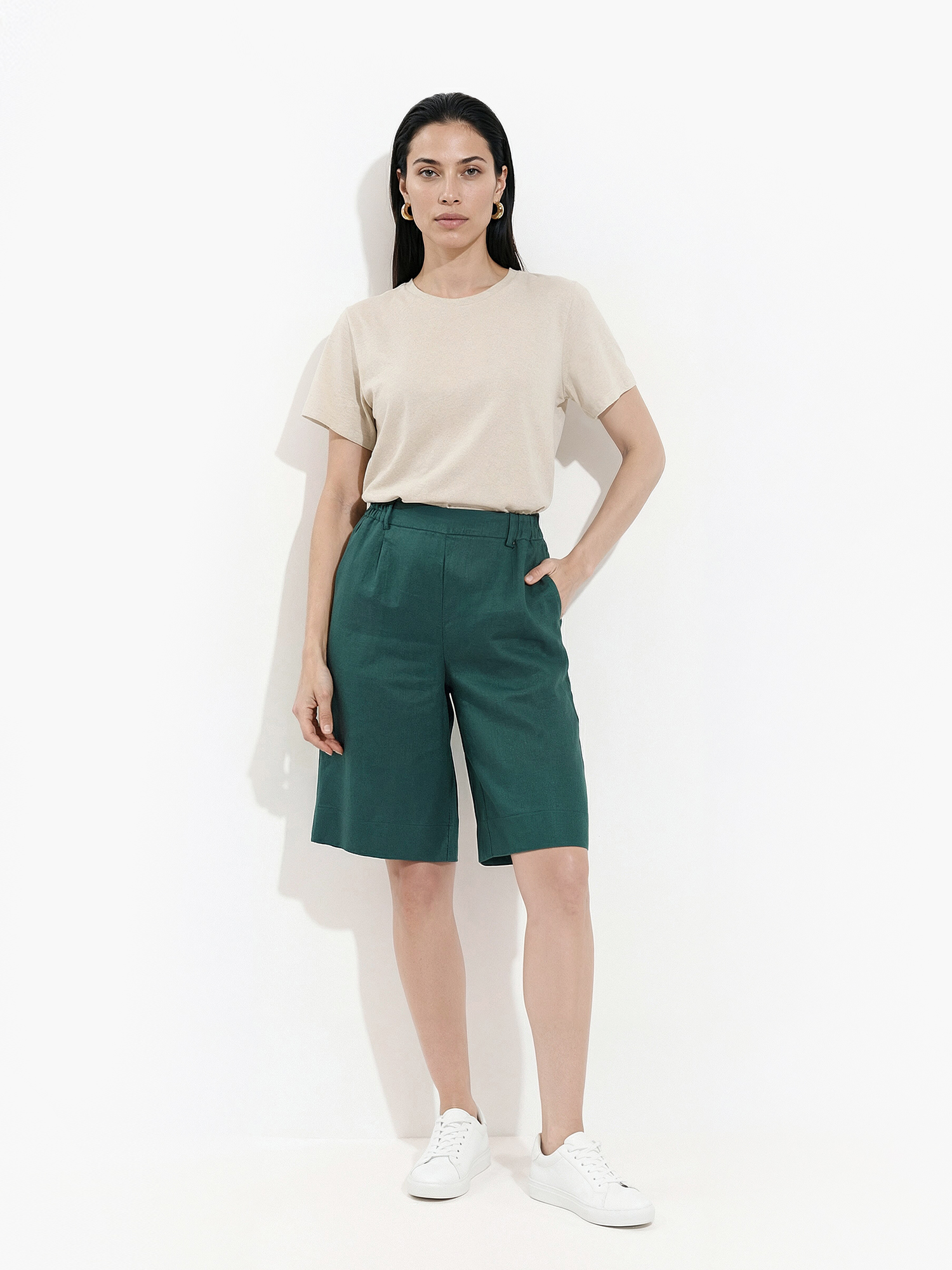 Легкие летние шорты-бермуды от итальянского бренда FABRETTI изумрудного цвета для пляжного отдыха и необычных городских образов. Шорты выполнены в прямом свободном крое, притачной пояс собран на резинку и дополнен шлевками, по бокам врезные карманы.Легкая льняная ткань имеет классическую узловатую фактуру. Низ имеет широкую подгибку - можно создать стильный отворот и уменьшить длину шорт, визуально удлиннив ноги.Эта модель поможет создать запоминающийся летний образ для пляжного отдыха и городского стиля.