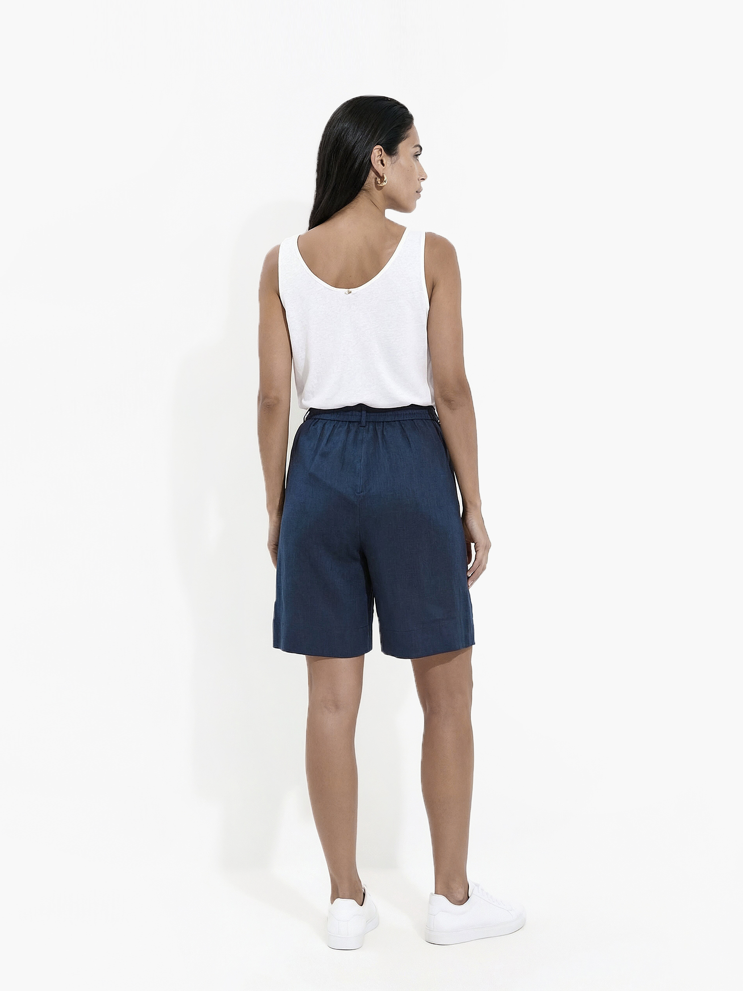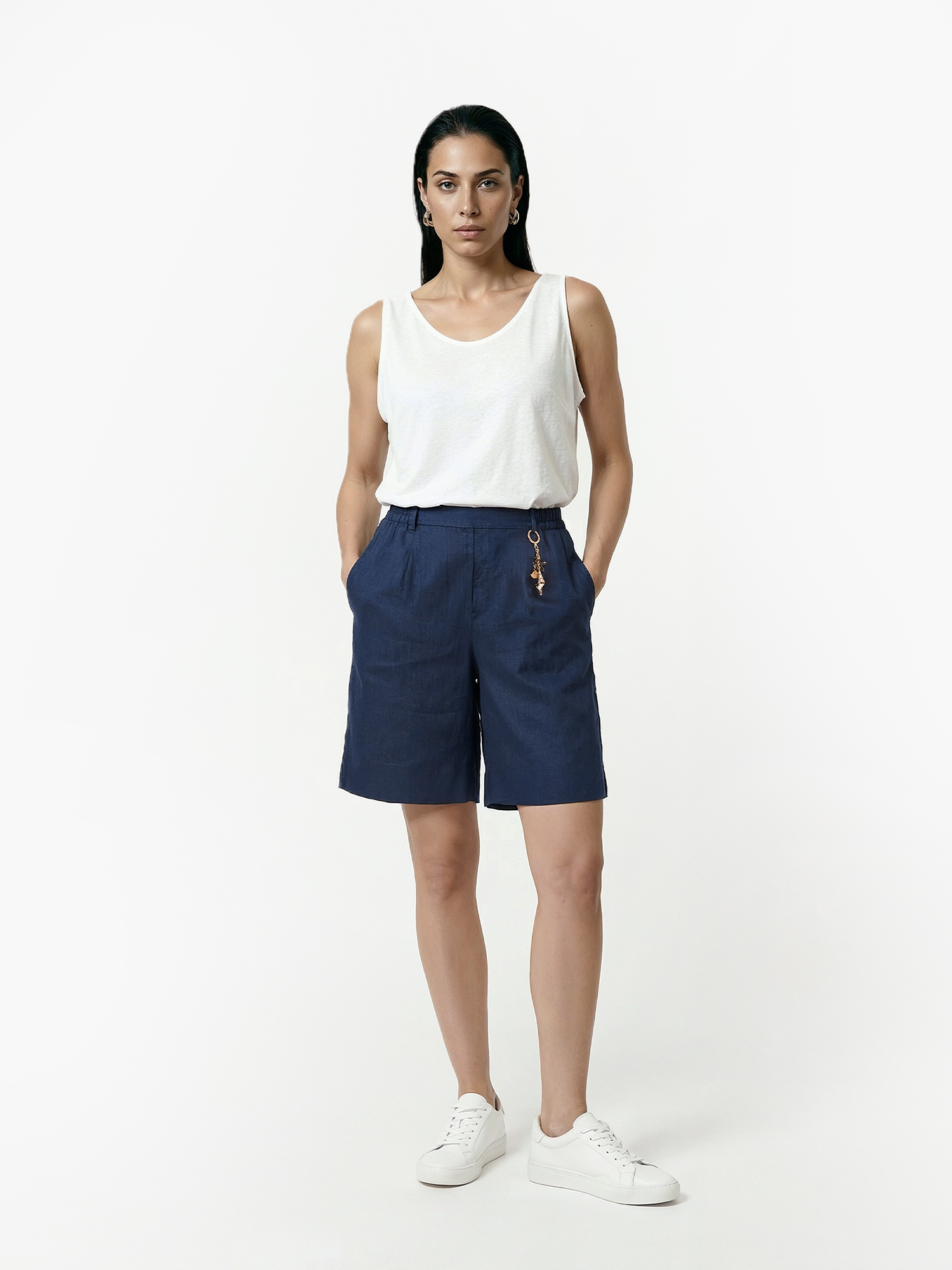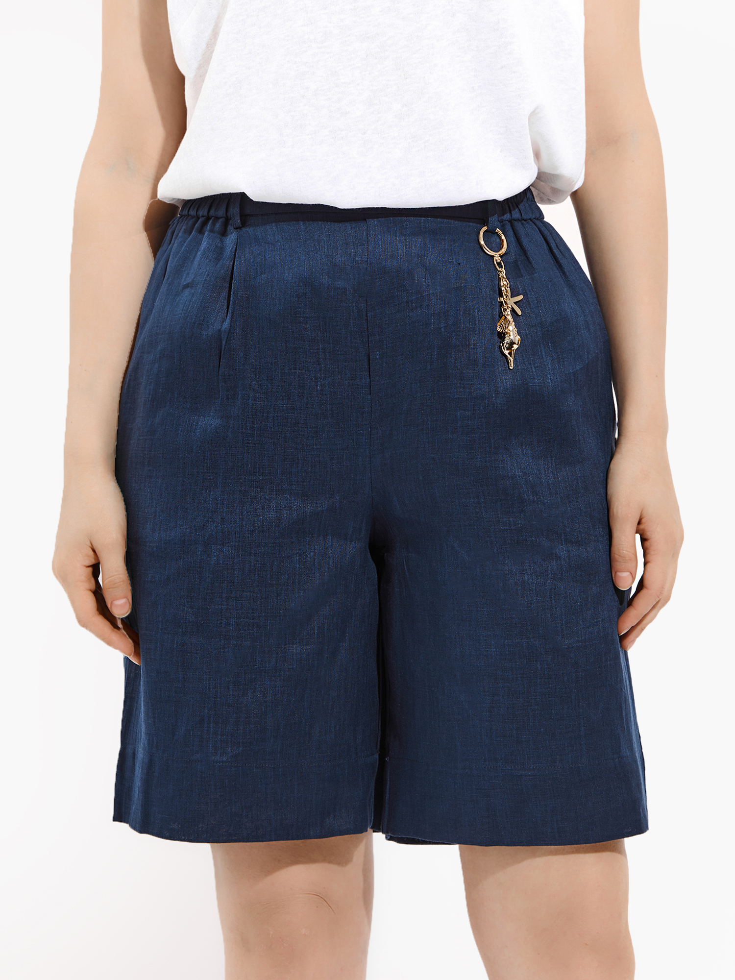 Легкие летние шорты-бермуды от итальянского бренда FABRETTI синего цвета для пляжного отдыха и необычных городских образов. Шорты выполнены в прямом свободном крое, притачной пояс собран на резинку, по бокам врезные карманы. Внутри легкая подкладка. Модель украшена съемным брелоком на карабине с подвесками в морской тематике.Легкая льняная ткань имеет классическую узловатую фактуру. Низ имеет широкую подгибку - можно создать стильный отворот и уменьшить длину шорт, визуально удлинив ноги.Эта модель поможет создать запоминающийся образ в морском или круизном стиле, если дополнить ее одеждой белого цвета, тонкой полоской и ярко-красным акцентным аксессуаром. Также хорошо подойдут аксессуары из соломки.