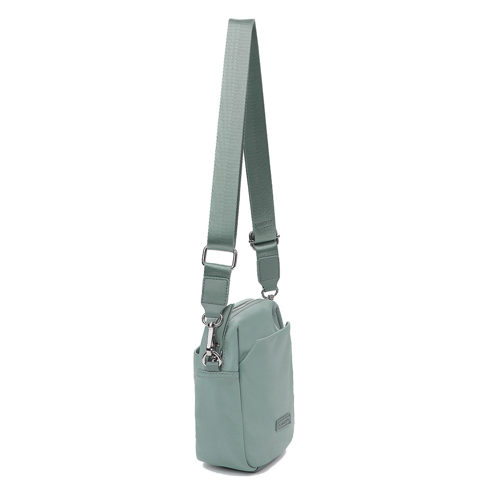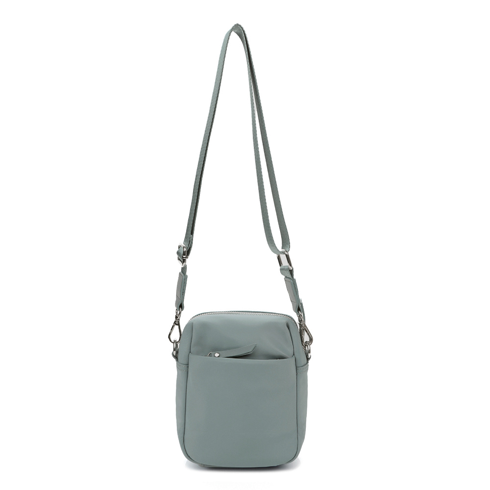 Компактная сумка для телефона из коллекции итальянского бренда FABRETTI в холодном серо-зеленом оттенке. Небольшой, но вместительный аксессуар для прогулок и путешествий.У сумки одно основное отделение на полукруглой металлической молнии. Внутри открытый карман и на молнии. На лицевой стороне открытый карман с магнитным замком, на тыльной стороне карман быстрого доступа на молнии. Пришивной логотип и поводки на молниях выполнены их экокожи в тон сумке.Сумка дополнена съемным регулируемым текстильным ремнем на карабинах. Длина 135 см. Дно усилено вставкой из экокожи. Цвет фурнитуры – серебро.